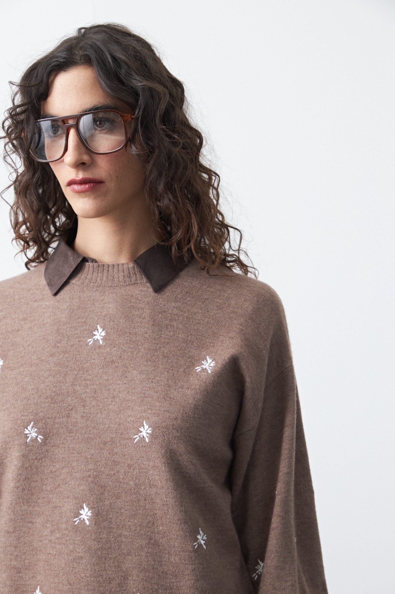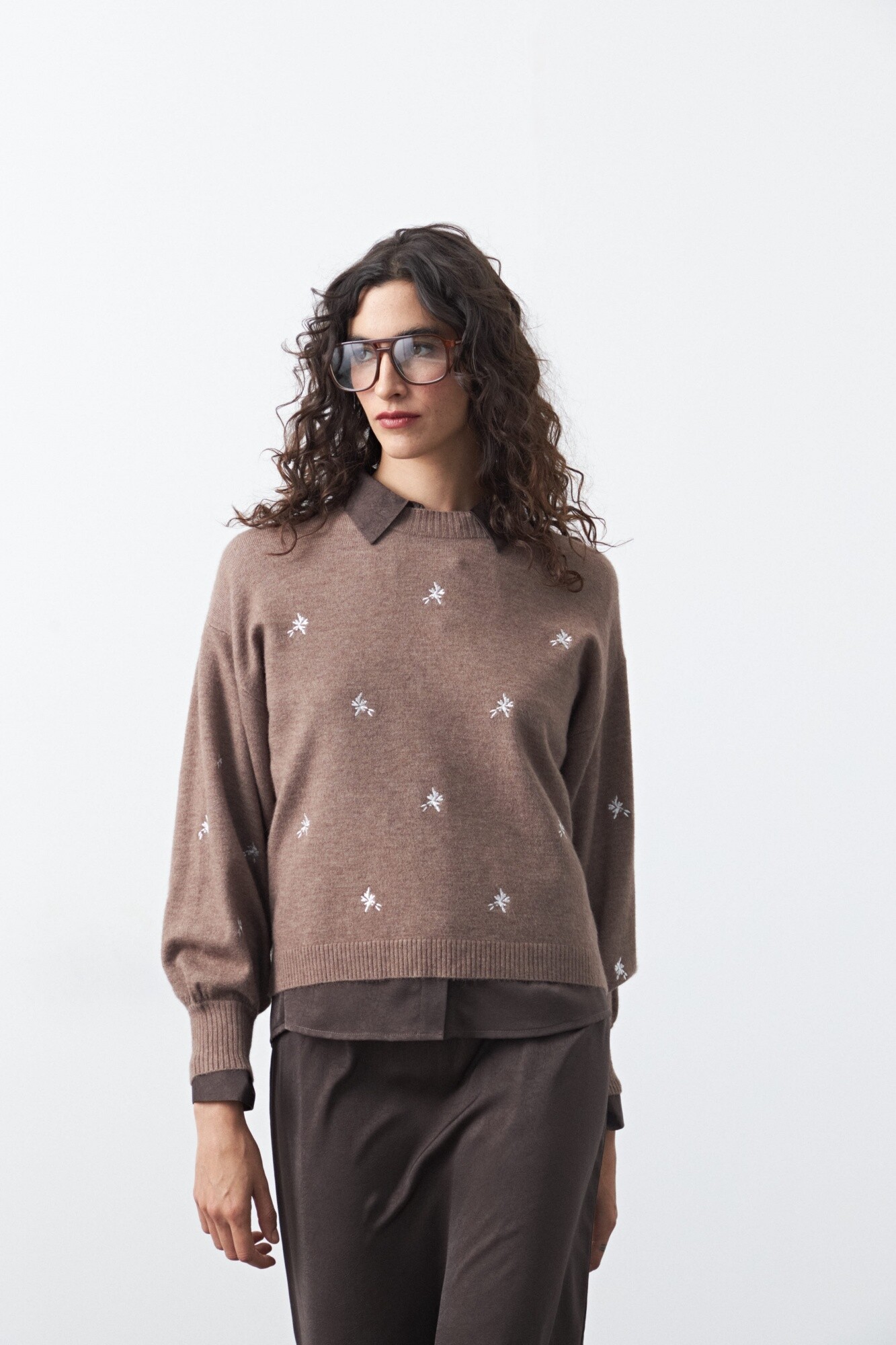 Sweater tejido de silueta relajada y cuello redondo, con delicados bordados distribuidos en toda la prenda que aportan un detalle sutil y distintivo. Las mangas largas con puños acanalados y el ruedo tejido brindan estructura al calce, manteniendo un aspecto prolijo y cómodo. El bordado genera un efecto visual delicado que suma textura y personalidad al diseño, convirtiéndolo en una pieza versátil para el día a día. Ideal para combinar con pantalones sastreros, denim o prendas más casuales, logrando looks actuales y en tendencia.