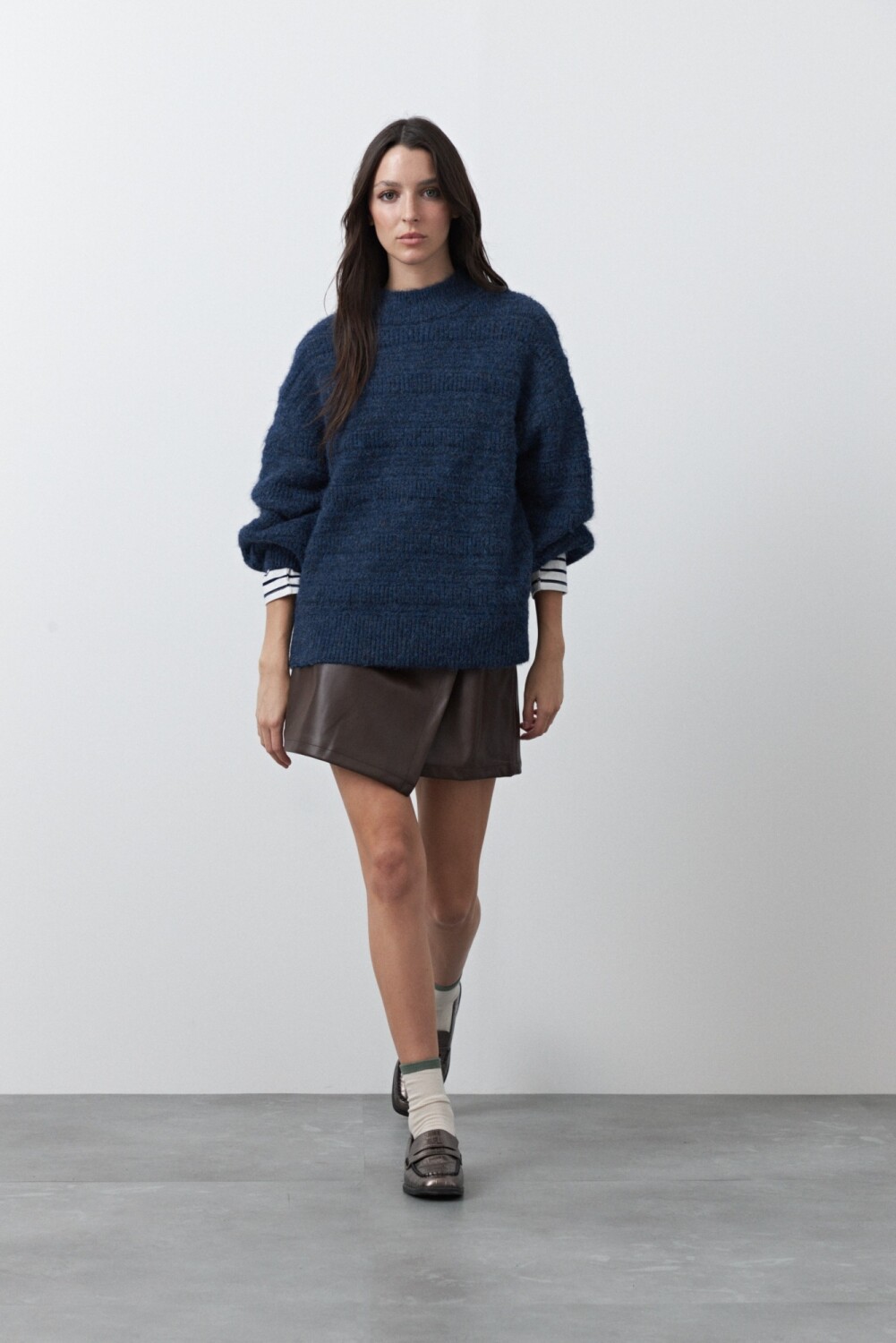 Sweater tramado de silueta relajada con mangas abullonadas que aportan volumen y un aire moderno. El tejido con textura suma interés visual mientras que los puños ajustados y elastizados equilibran la prenda, generando un calce cómodo y favorecedor. Ideal para elevar looks cotidianos con una pieza en tendencia y de impronta acogedora.