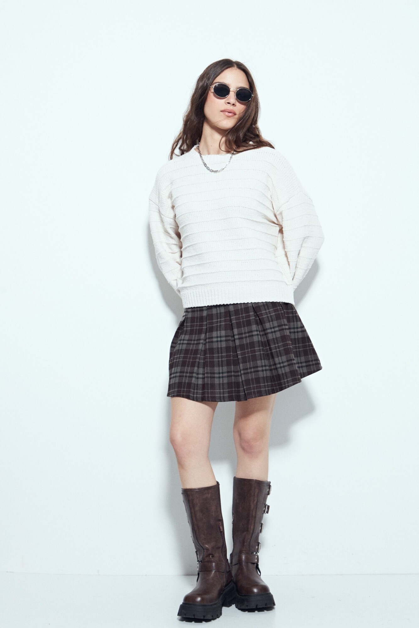 Sweater de tejido texturizado con líneas horizontales en relieve que aportan estructura y un detalle diferencial. De silueta levemente holgada y hombros caídos, es ideal para jugar con superposiciones y lograr un look preppy o urbano en tendencia.