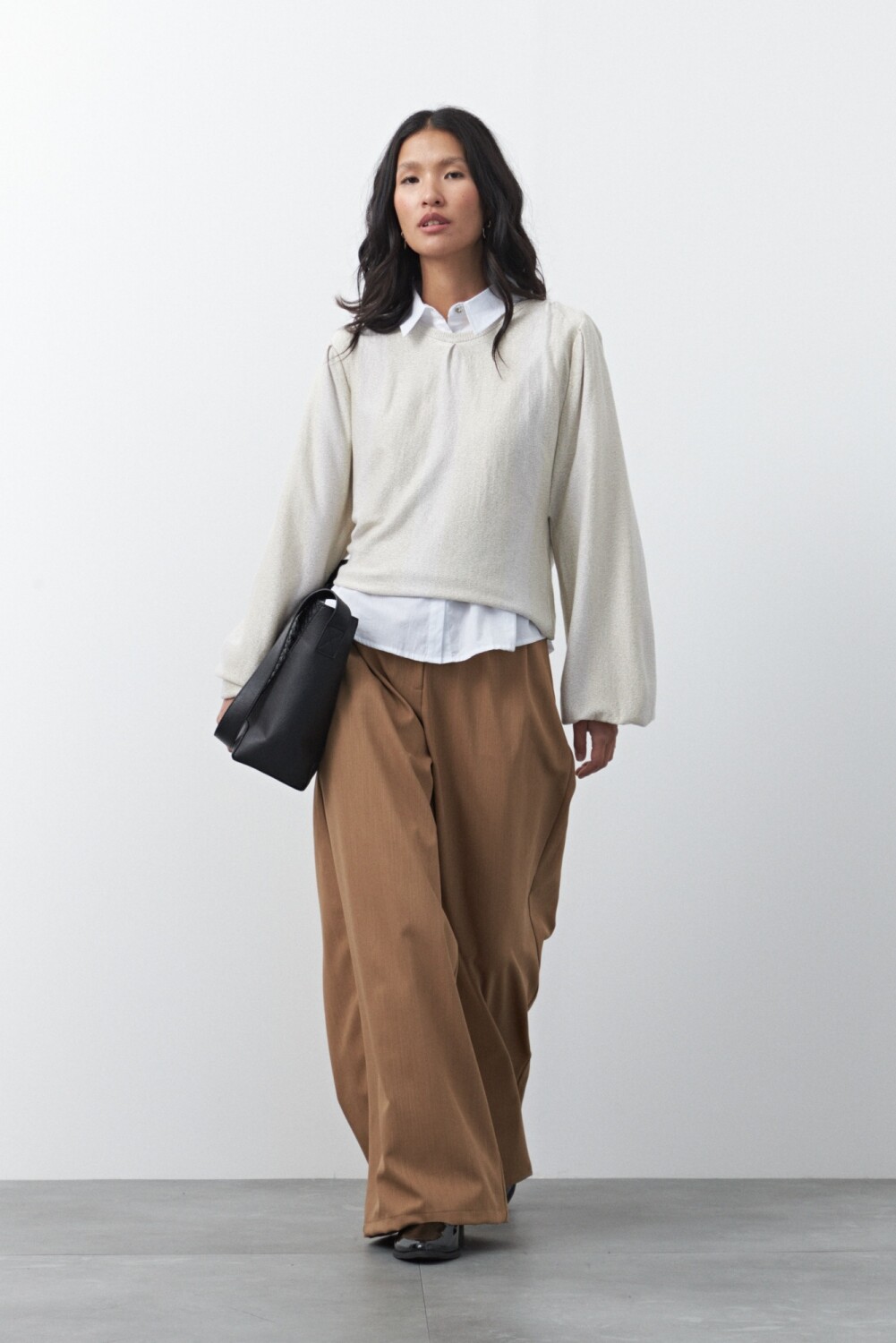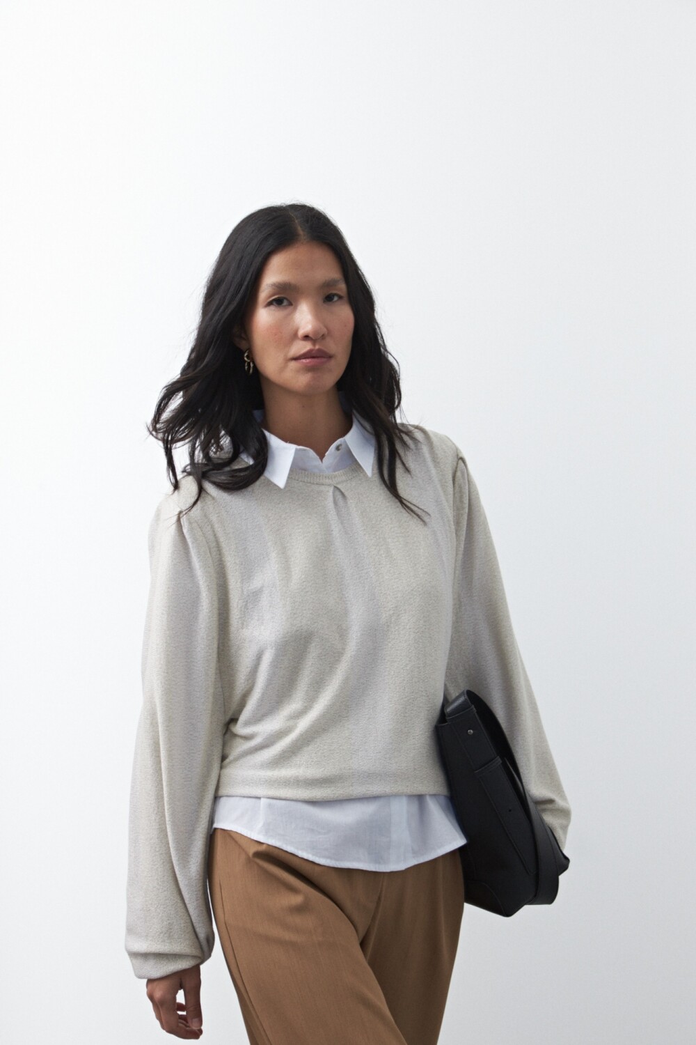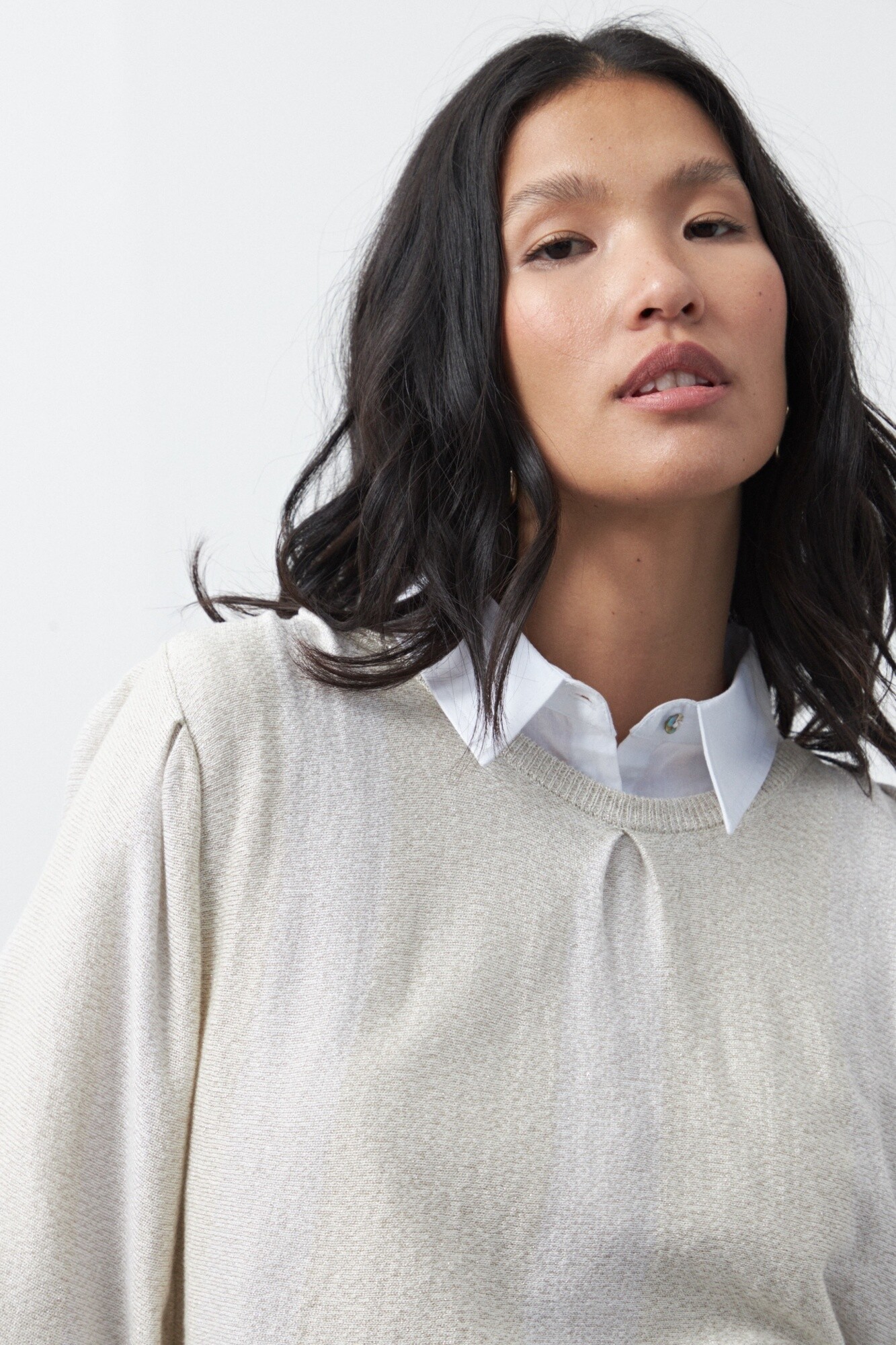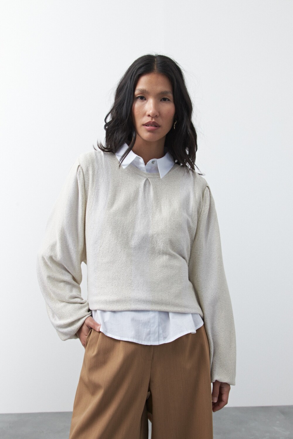 Sweater tejido a rayas que combina diferentes texturas para lograr un efecto visual sutil y moderno. Su diseño presenta cuello redondo y mangas amplias que aportan movimiento y una silueta relajada, mientras que el tejido con hilo metalizado suma un brillo delicado que eleva la prenda y la convierte en una opción ideal para looks de día o de noche.