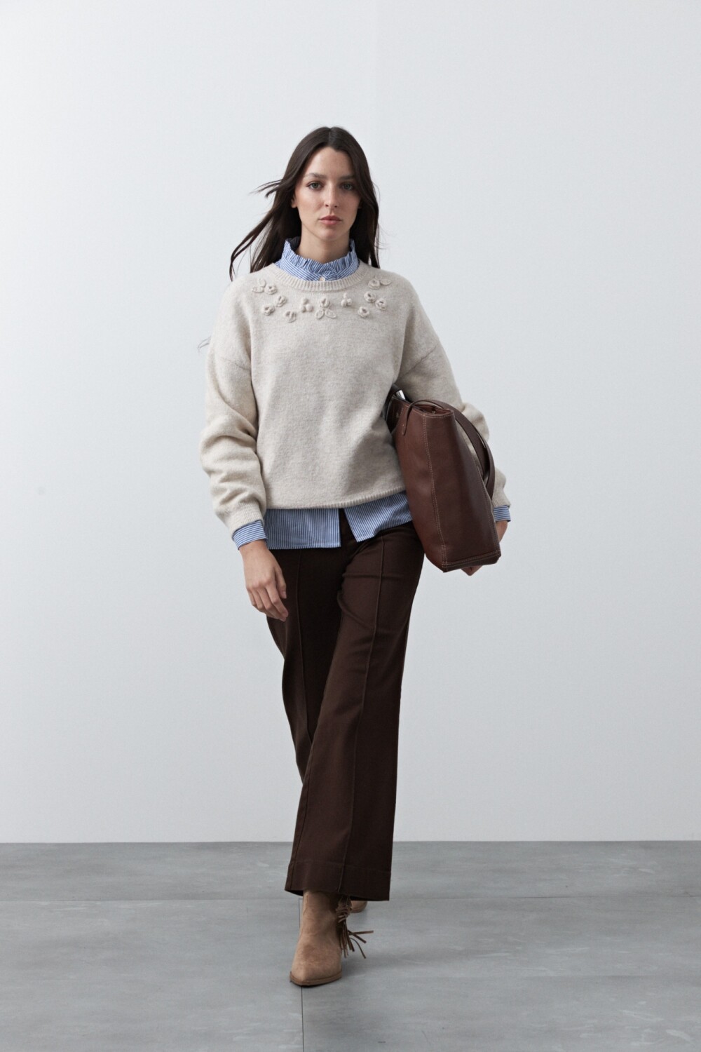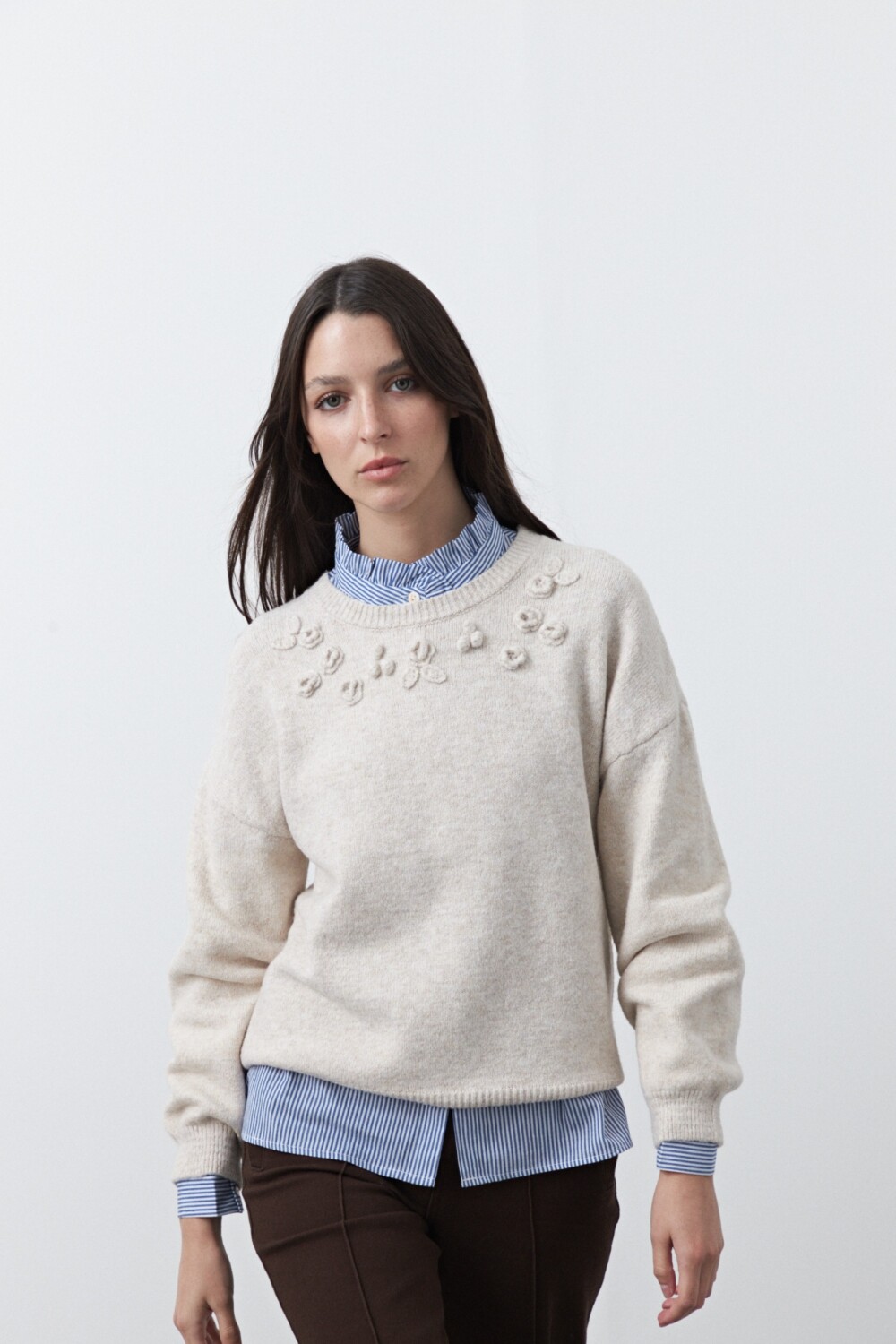 Sweater de tejido suave con bordado floral aplicado, que aporta textura y un detalle artesanal sutil a la prenda. Su silueta relajada y cuello a la base lo convierten en una opción versátil para sumar interés a looks de todos los días, elevando combinaciones clásicas con un guiño romántico y en tendencia.
