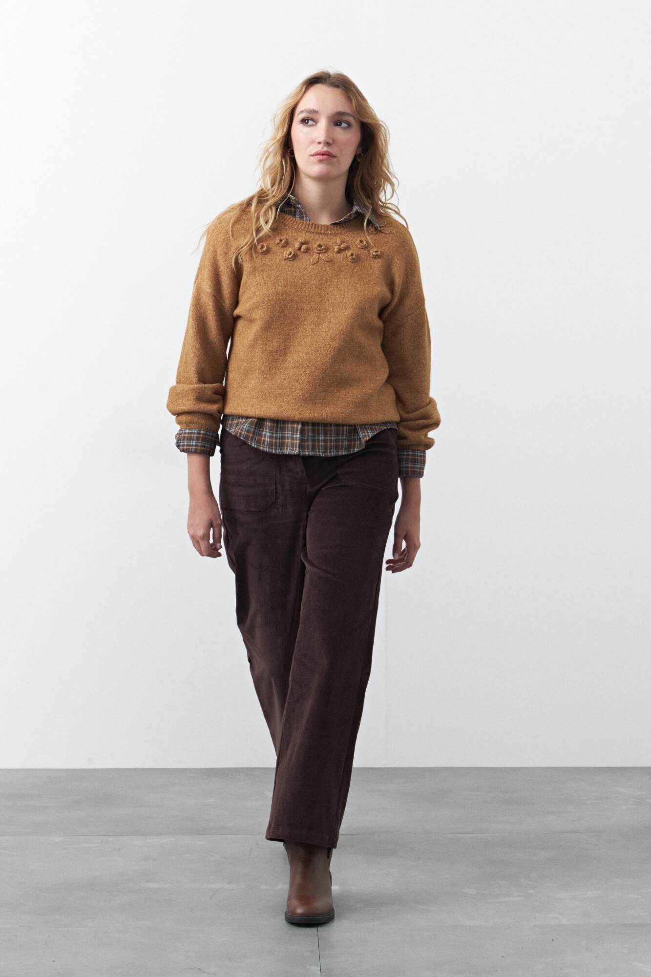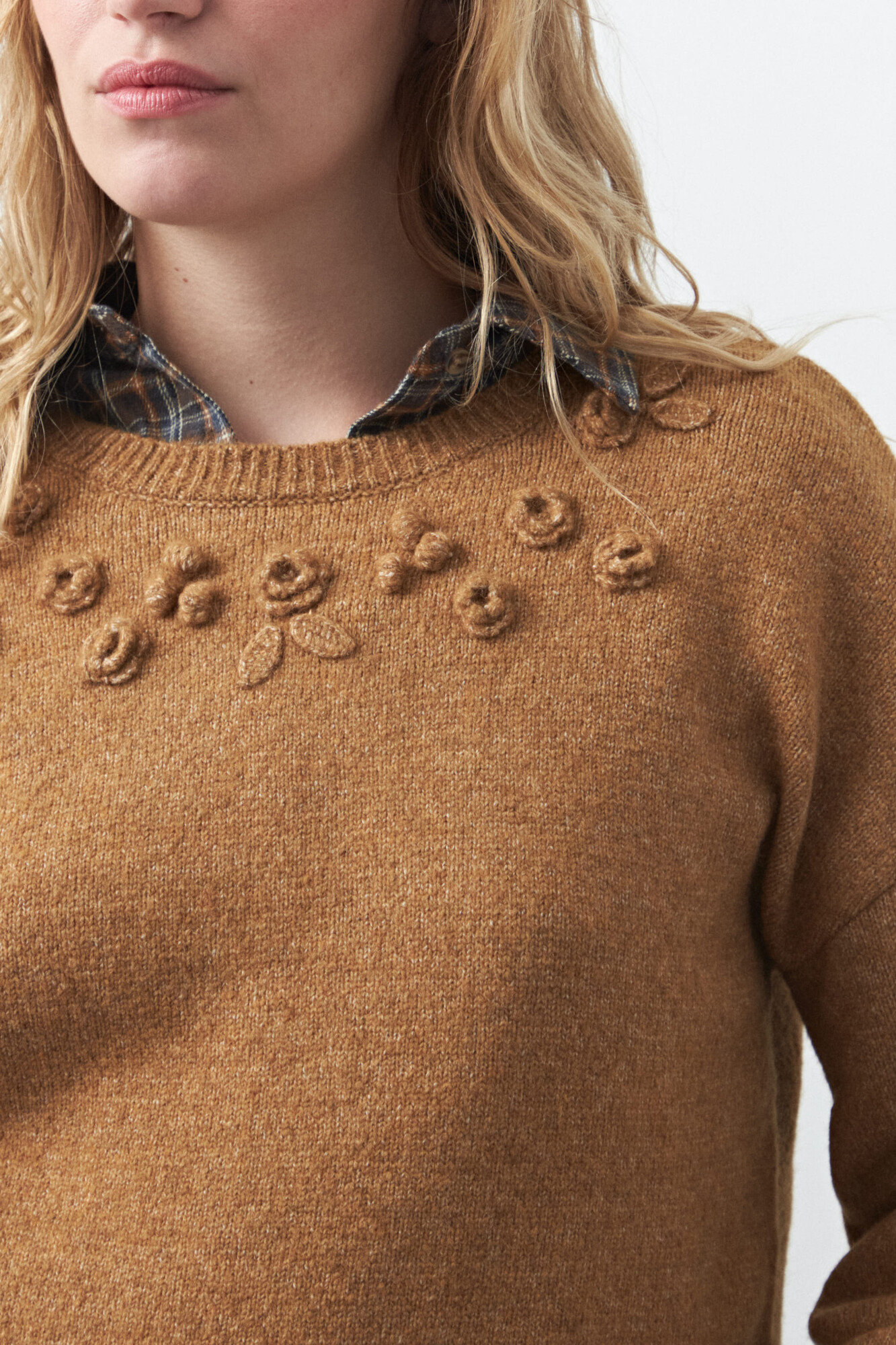 Sweater de tejido suave con bordado floral aplicado, que aporta textura y un detalle artesanal sutil a la prenda. Su silueta relajada y cuello a la base lo convierten en una opción versátil para sumar interés a looks de todos los días, elevando combinaciones clásicas con un guiño romántico y en tendencia.