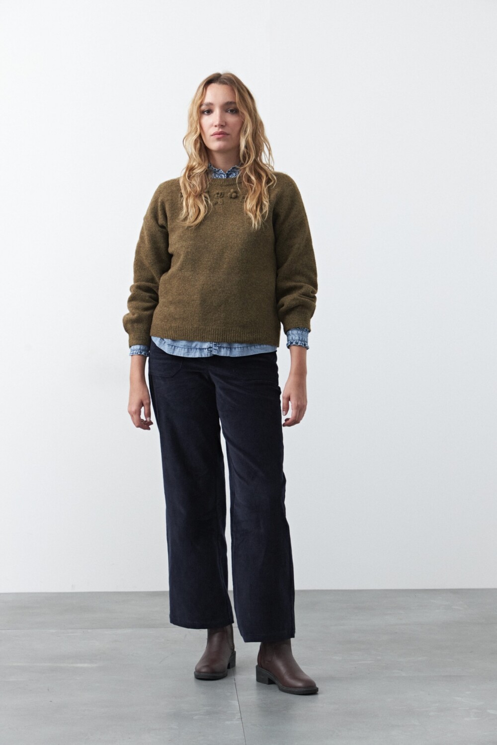 Sweater de tejido suave con bordado floral aplicado, que aporta textura y un detalle artesanal sutil a la prenda. Su silueta relajada y cuello a la base lo convierten en una opción versátil para sumar interés a looks de todos los días, elevando combinaciones clásicas con un guiño romántico y en tendencia.