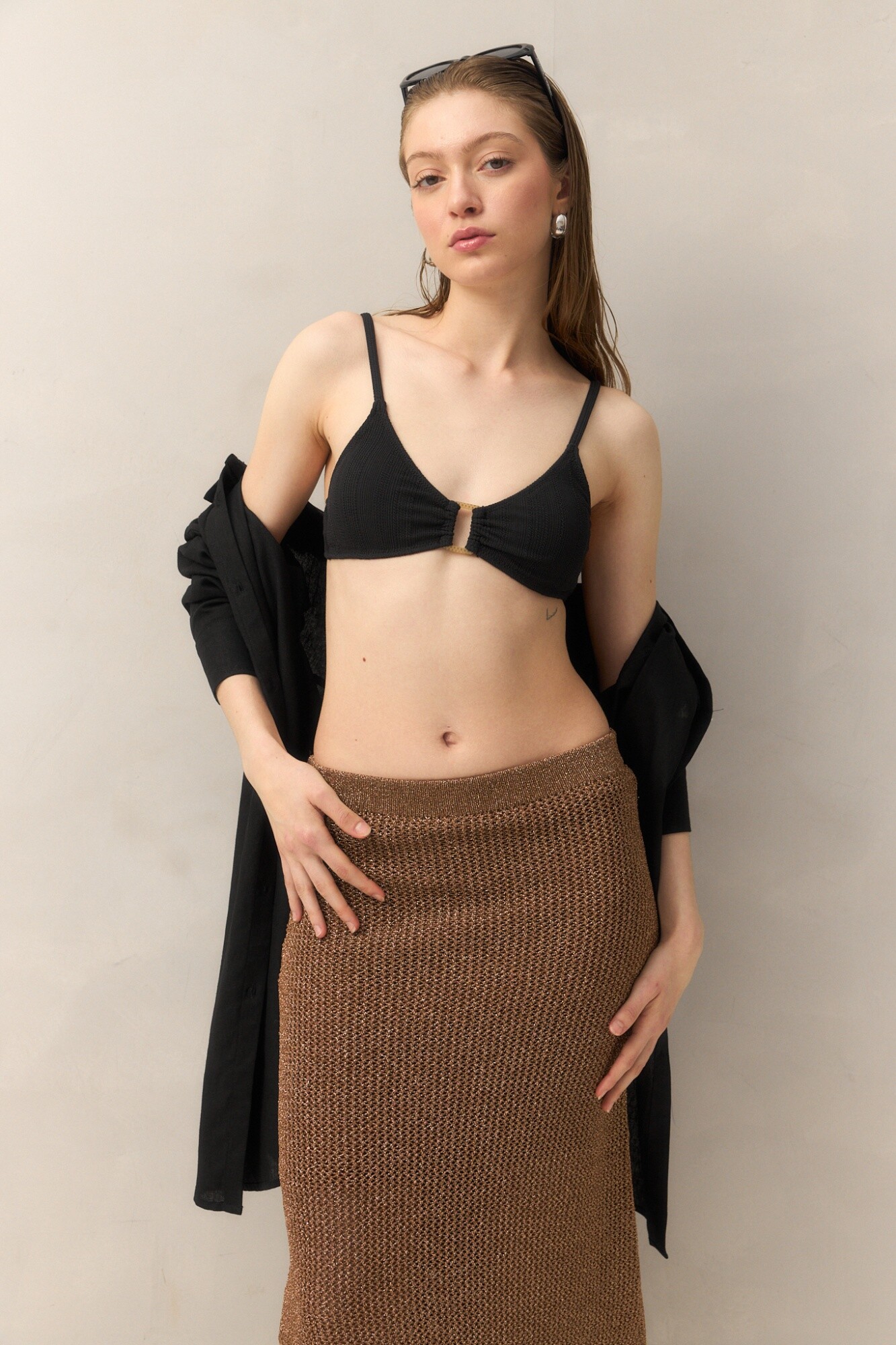 Top de bikini confeccionado en tela diferenciada con textura sutil que eleva su diseño. Presenta un aro rectangular al centro que aporta un toque moderno y sofisticado, realzando el escote con equilibrio y estilo. Sus breteles finos y líneas limpias garantizan un calce cómodo y favorecedor. Ideal para combinar con el bottom a juego o contrastar con otras piezas de la colección.