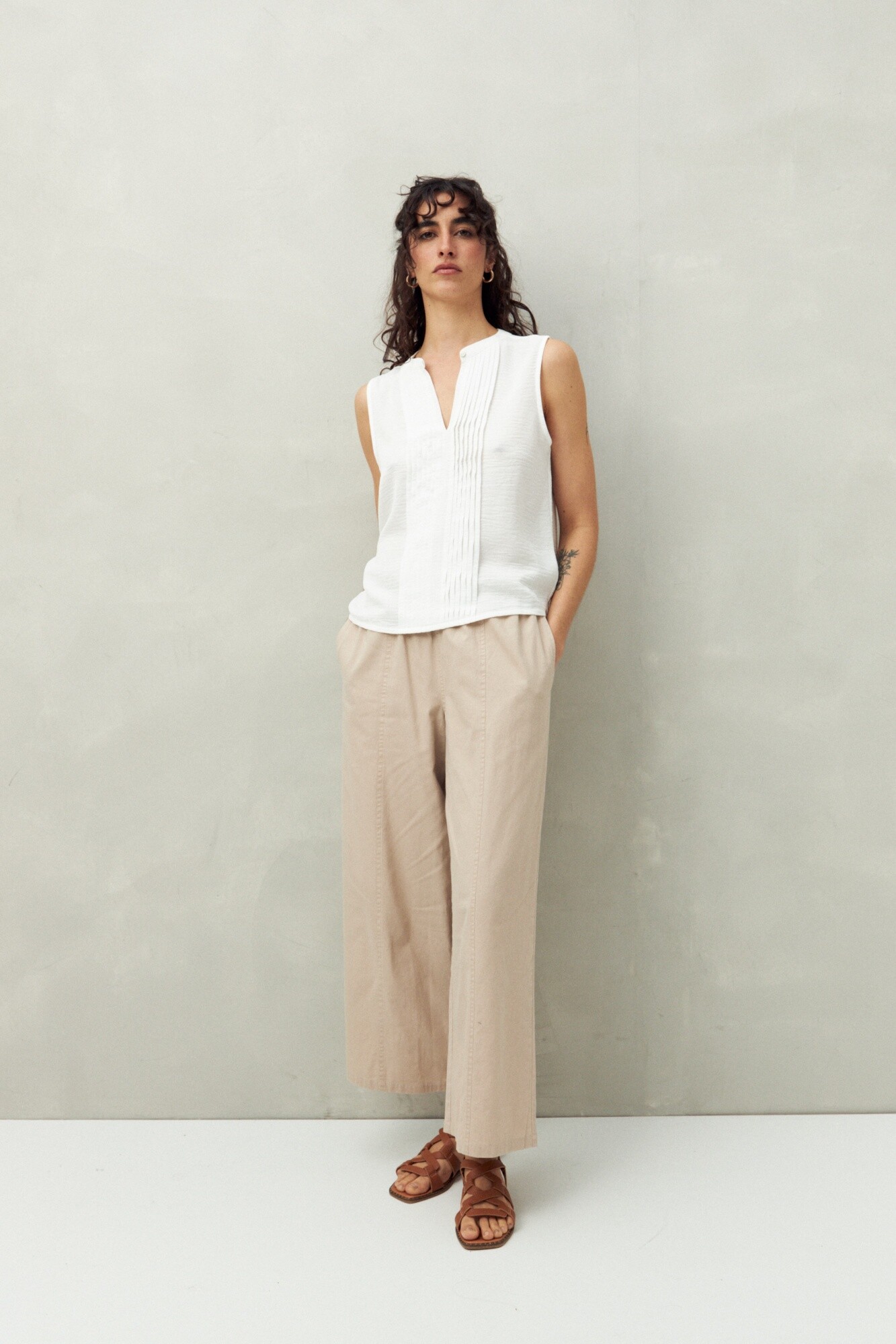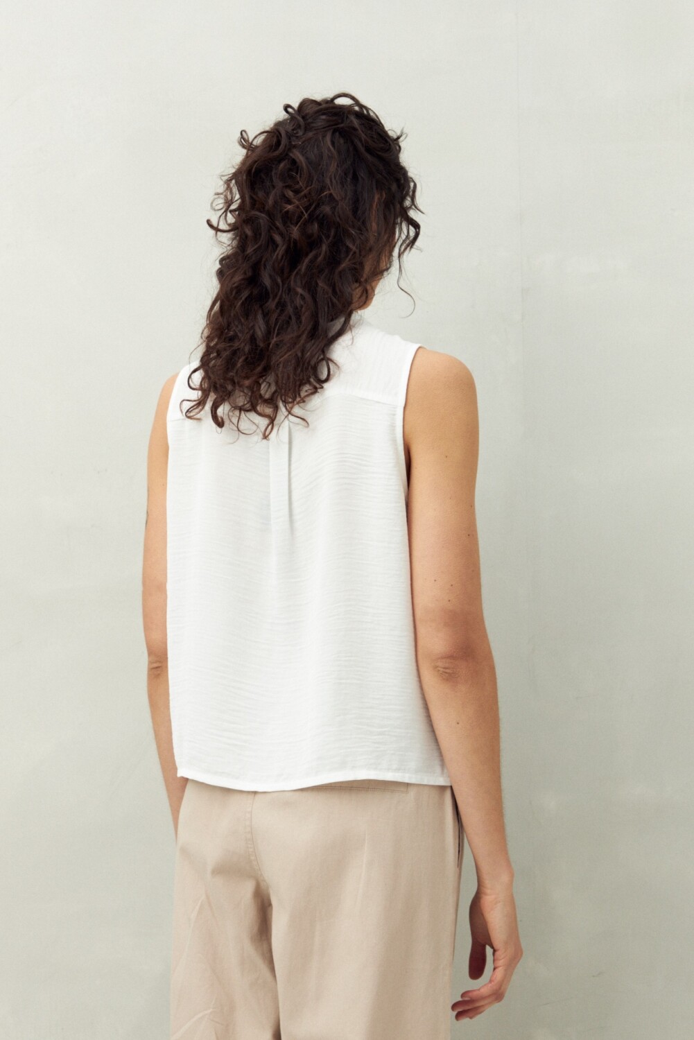 Top sin mangas con detalle de alforzas en el frente y escote redondo con pequeña abertura y botón. Su caída liviana y textura sutil lo convierten en ese esencial que combina estilo y comodidad. Perfecto para looks de oficina o para elevar conjuntos más relajados con un toque pulido.