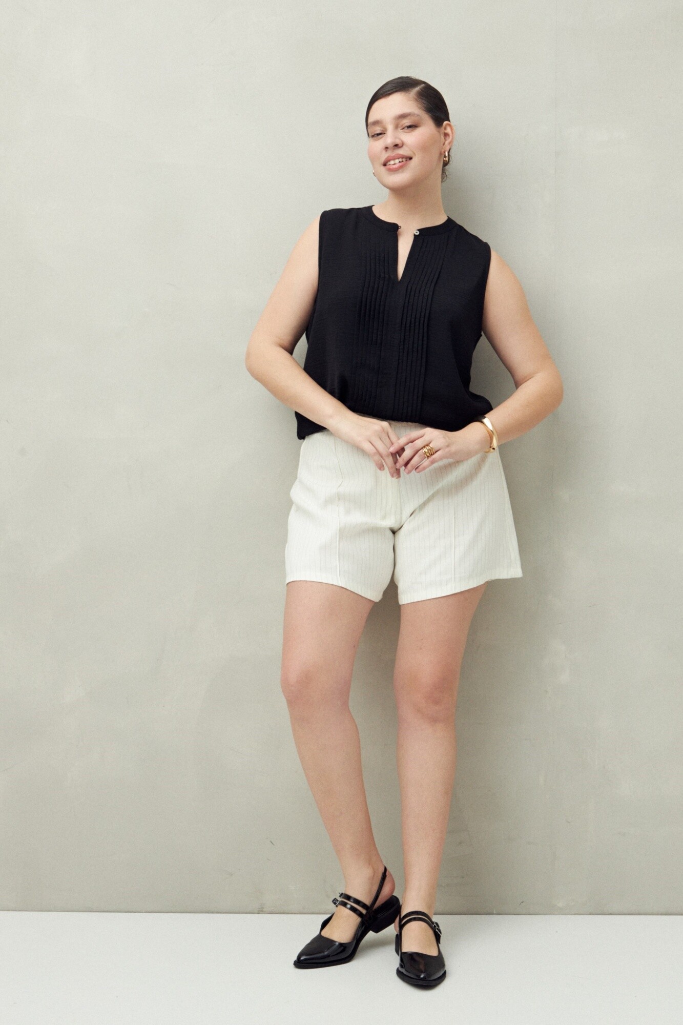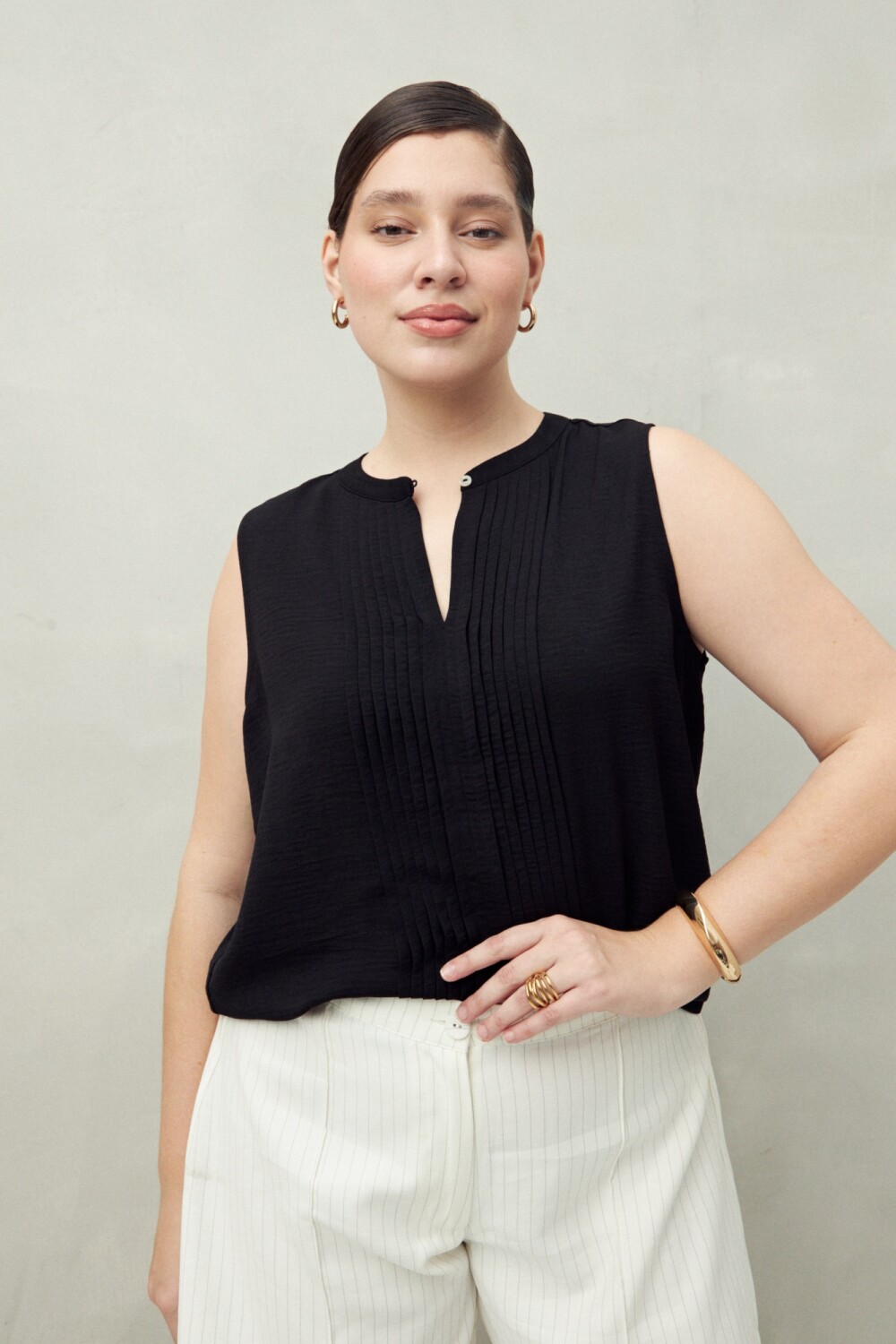 Top sin mangas con detalle de alforzas en el frente y escote redondo con pequeña abertura y botón. Su caída liviana y textura sutil lo convierten en ese esencial que combina estilo y comodidad. Perfecto para looks de oficina o para elevar conjuntos más relajados con un toque pulido.