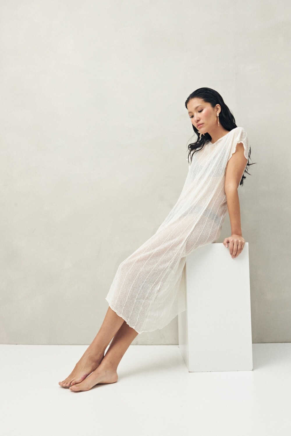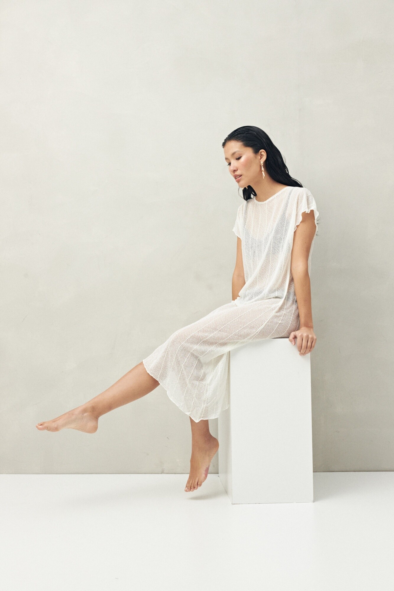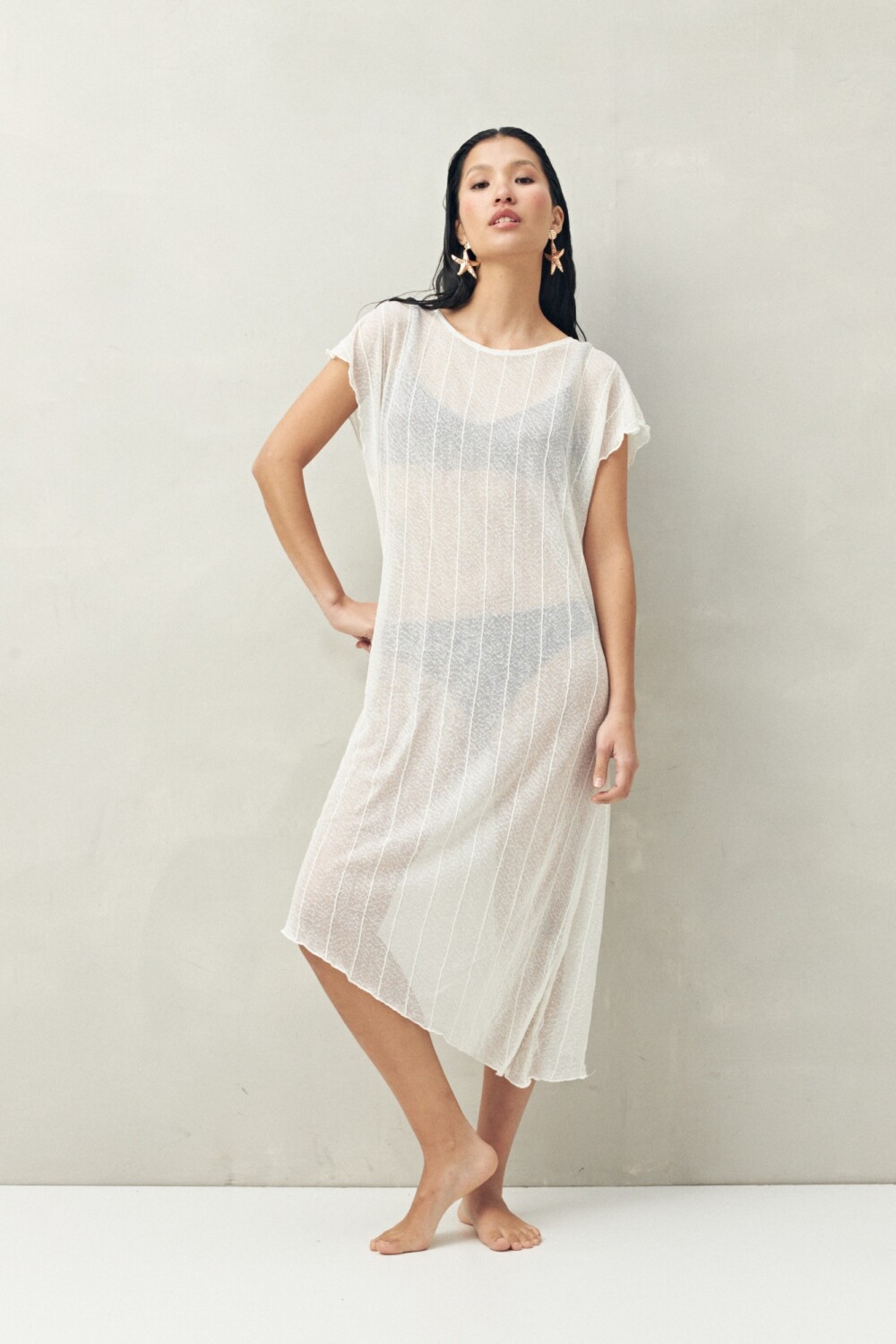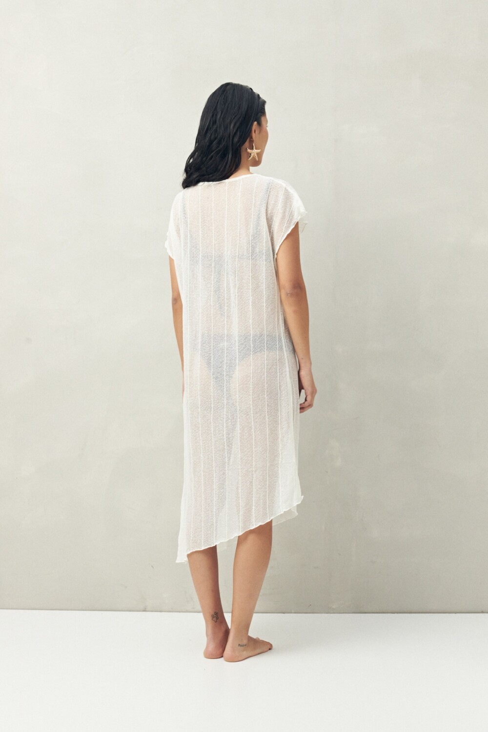 Top largo confeccionado en tejido liviano con transparencia y caída fluida. Su textura delicada y el diseño holgado lo hacen perfecto tanto como salida de playa sobre el traje de baño, como para un look de noche con short o falda al tono. Una prenda versátil que combina ligereza, movimiento y un toque sensual.