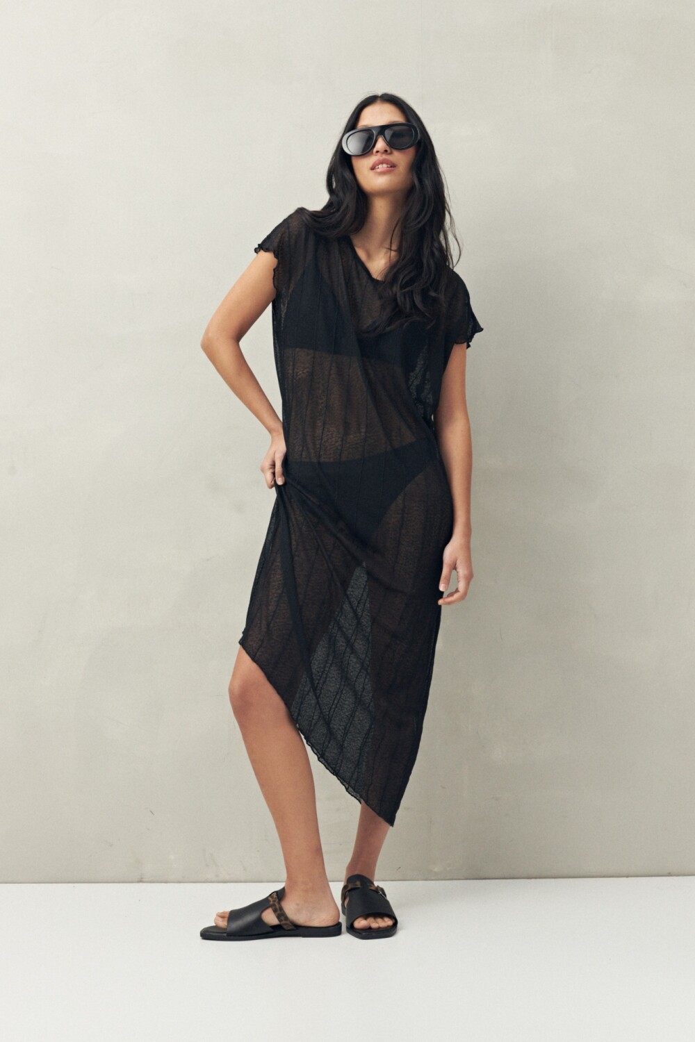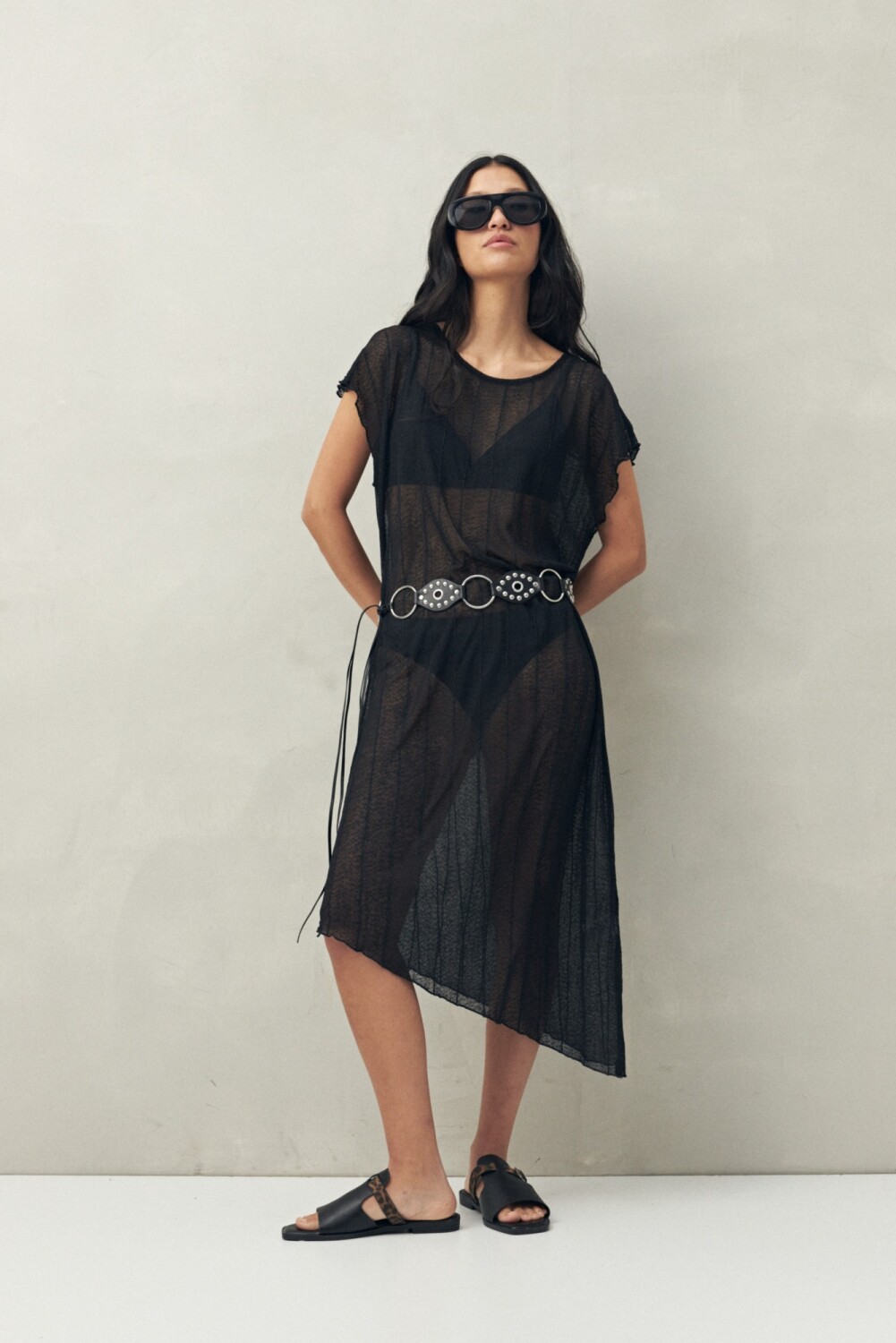 Top largo confeccionado en tejido liviano con transparencia y caída fluida. Su textura delicada y el diseño holgado lo hacen perfecto tanto como salida de playa sobre el traje de baño, como para un look de noche con short o falda al tono. Una prenda versátil que combina ligereza, movimiento y un toque sensual.