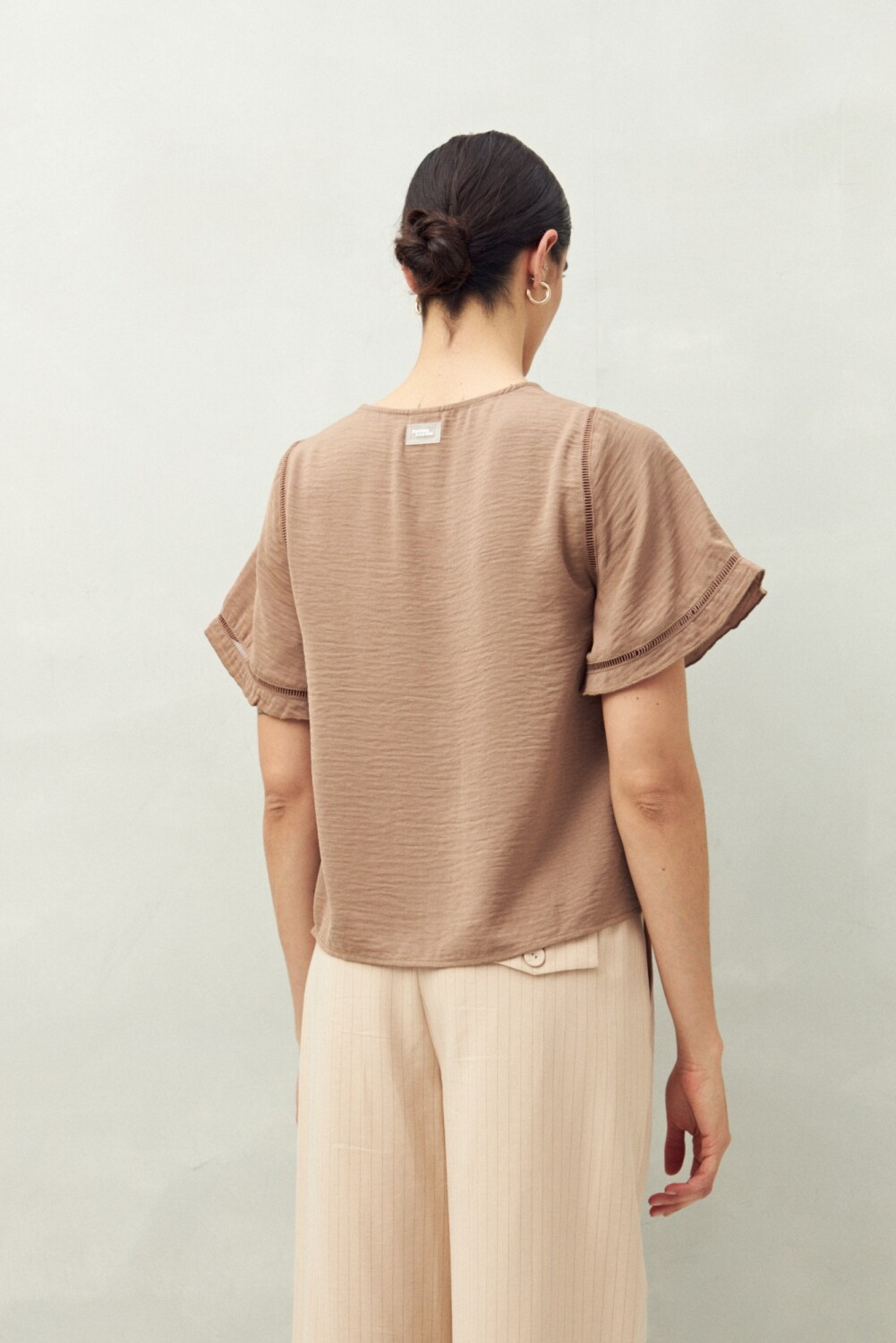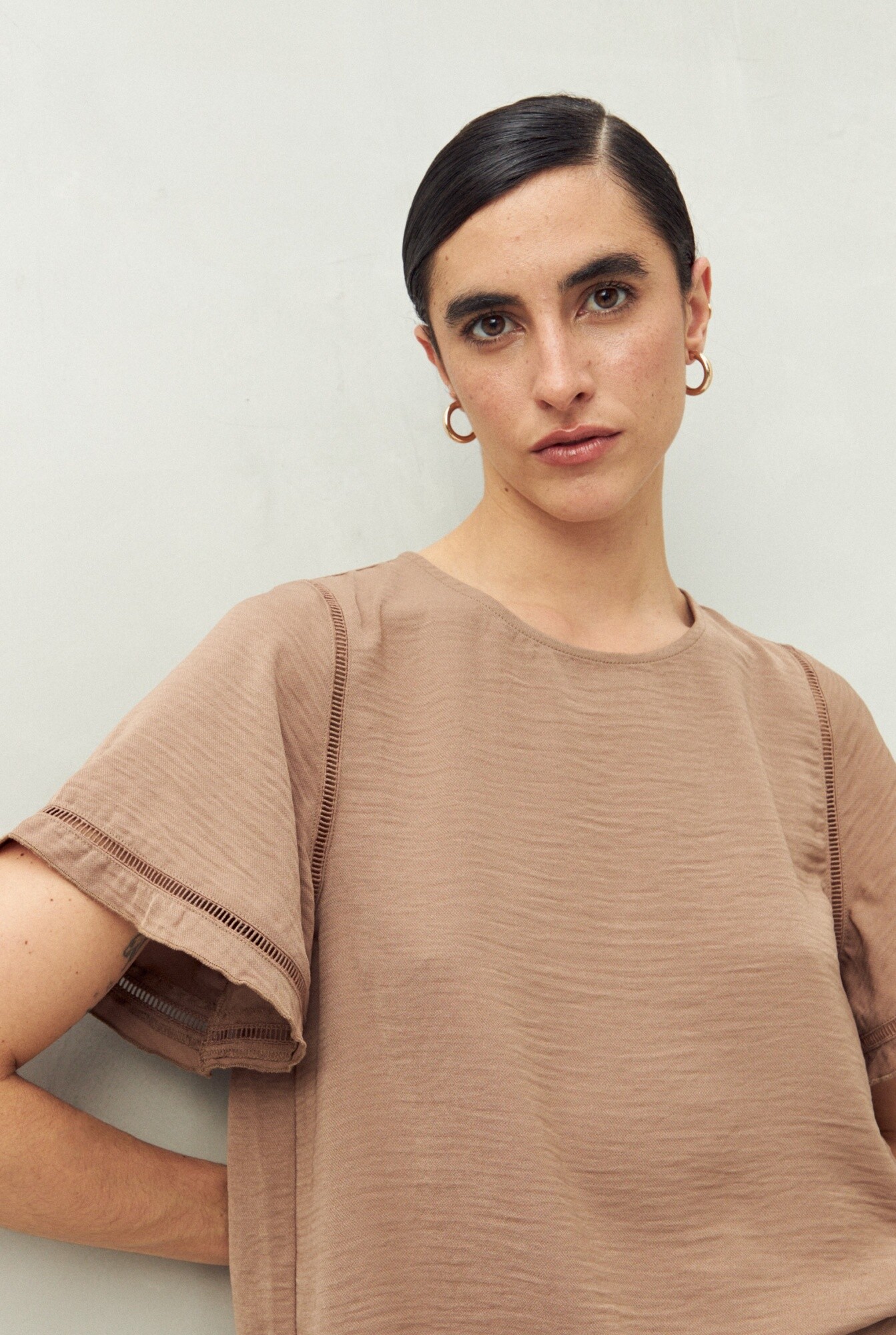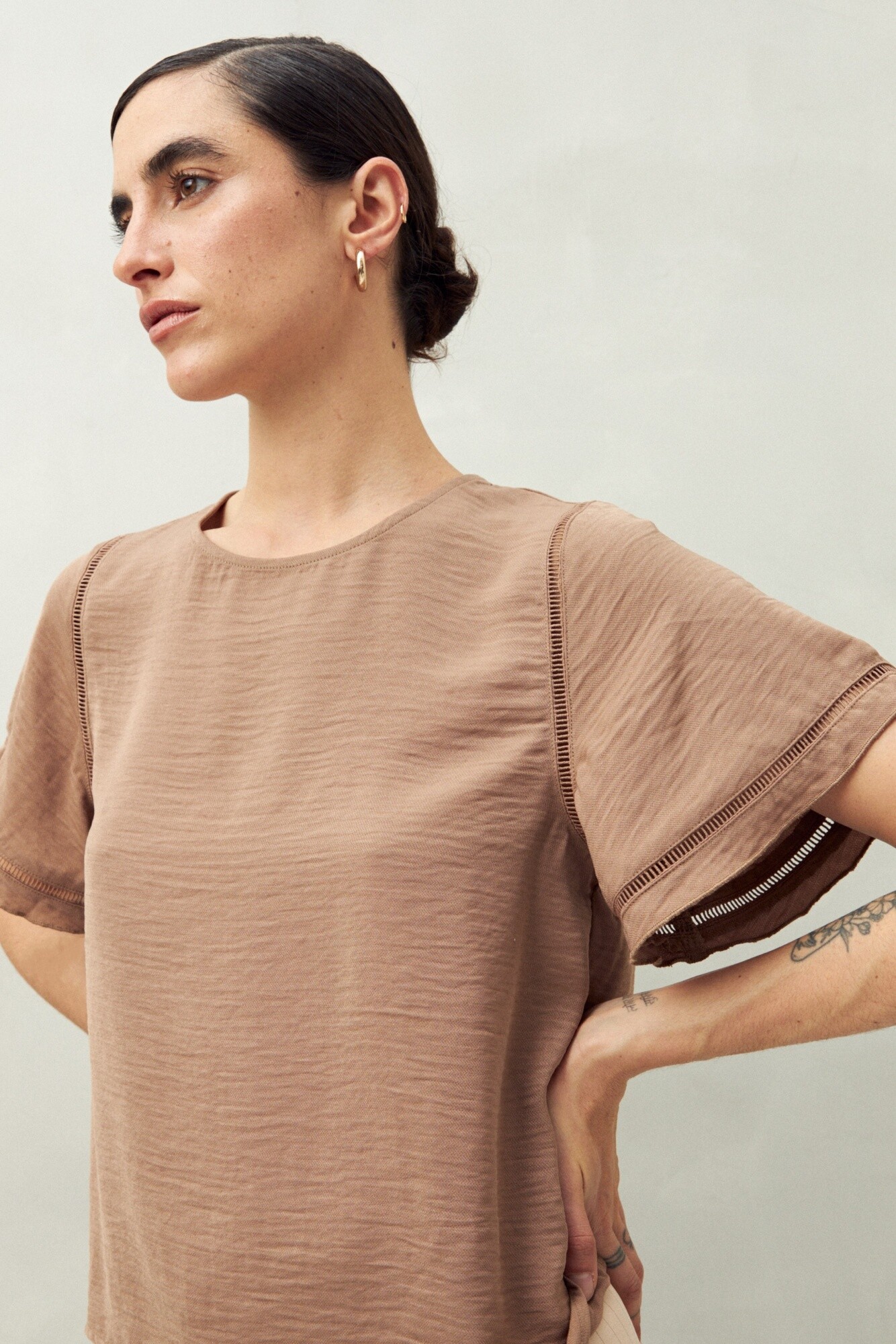 Top de manga corta con delicado trabajo calado sobre las costuras y ruedo de mangas. Su textura liviana y fluida aporta movimiento, mientras que el diseño minimalista lo vuelve un comodín infalible para combinar tanto con pantalones amplios como con faldas más estructuradas.