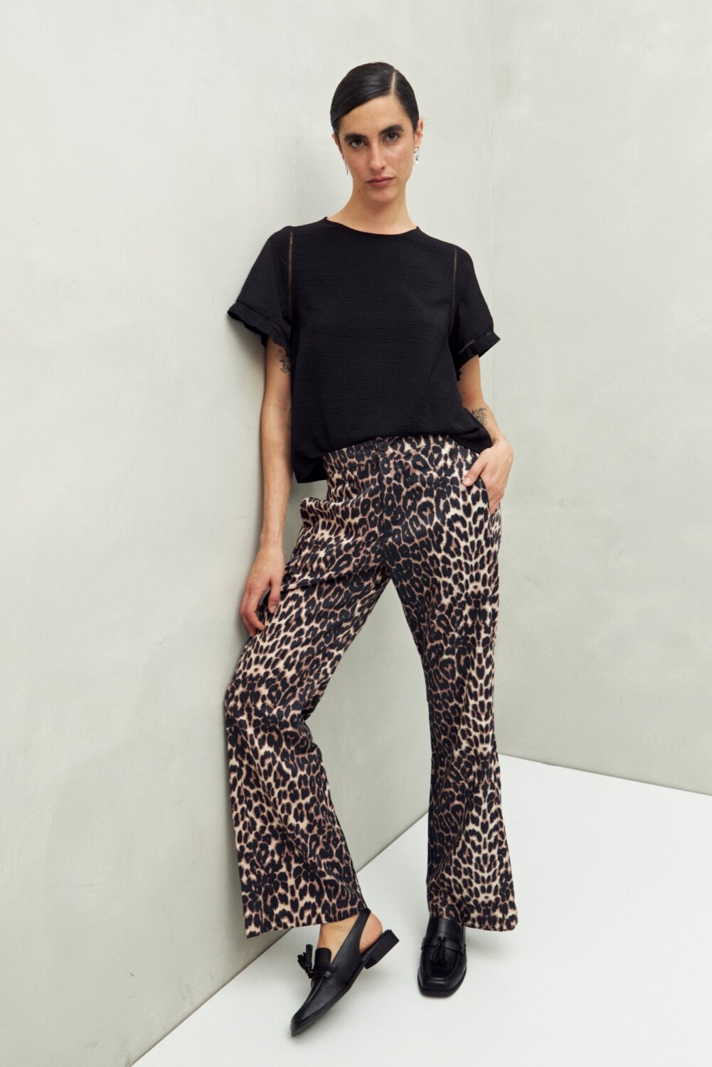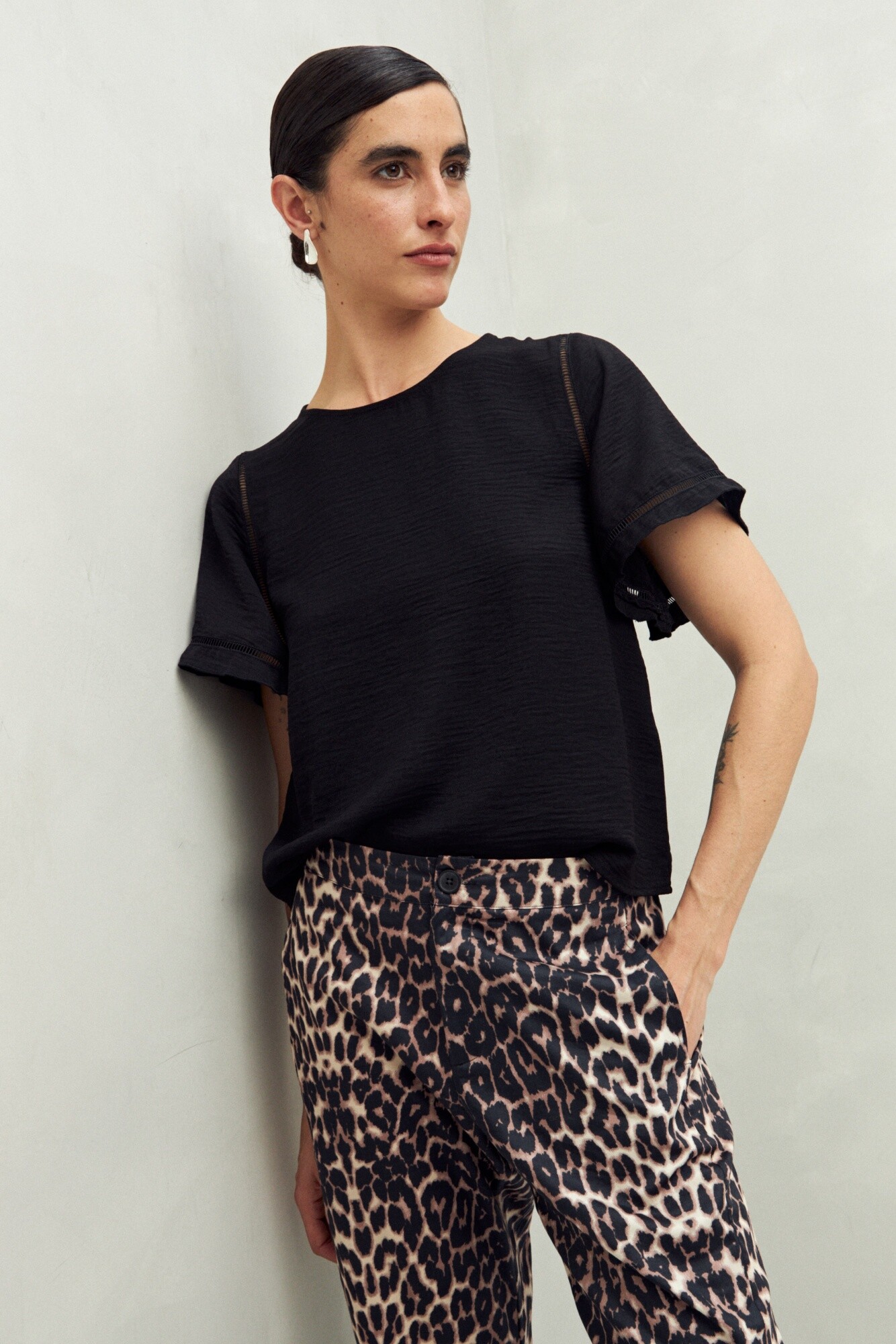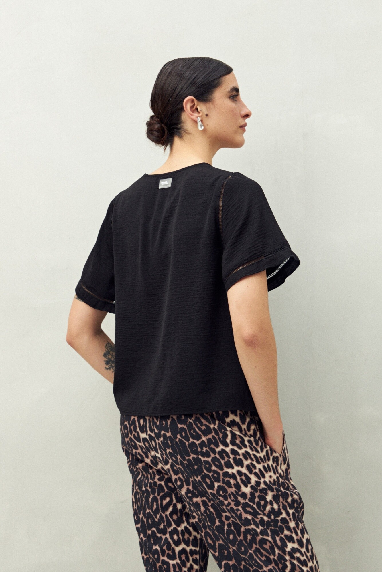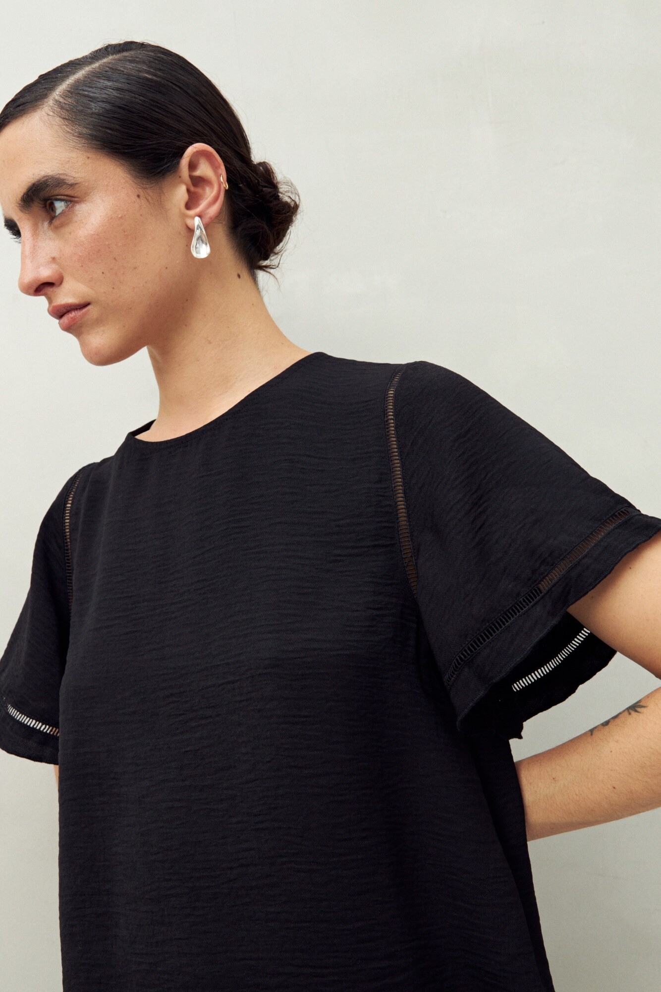 Top de manga corta con delicado trabajo calado sobre las costuras y ruedo de mangas. Su textura liviana y fluida aporta movimiento, mientras que el diseño minimalista lo vuelve un comodín infalible para combinar tanto con pantalones amplios como con faldas más estructuradas.