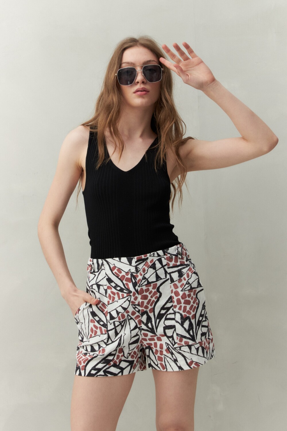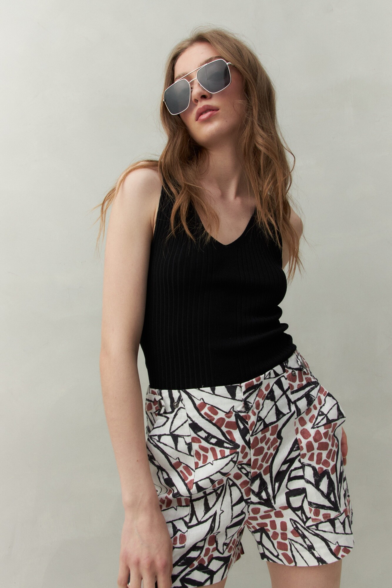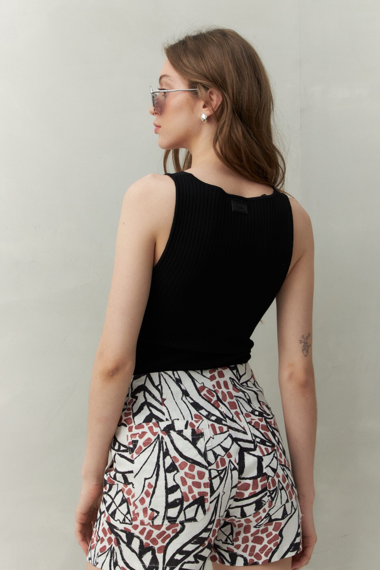 Top sin mangas de tejido acanalado con escote en “V” y calce al cuerpo que realza la silueta con naturalidad. Su textura elástica aporta comodidad y un acabado prolijo, ideal para usar solo o como base en looks de capas. Un esencial versátil para elevar cualquier look.