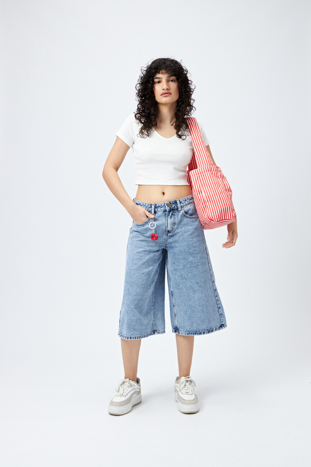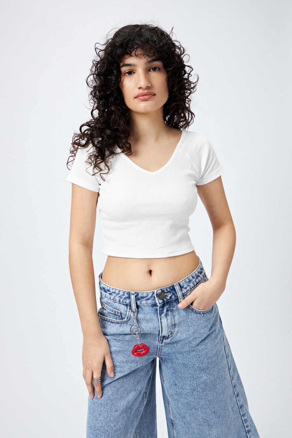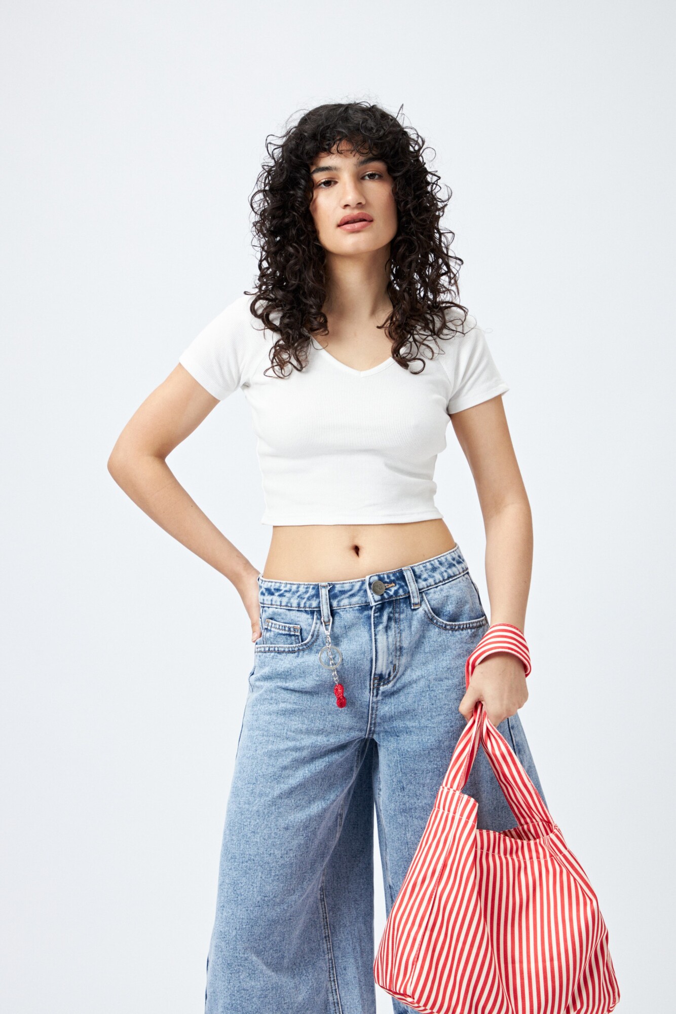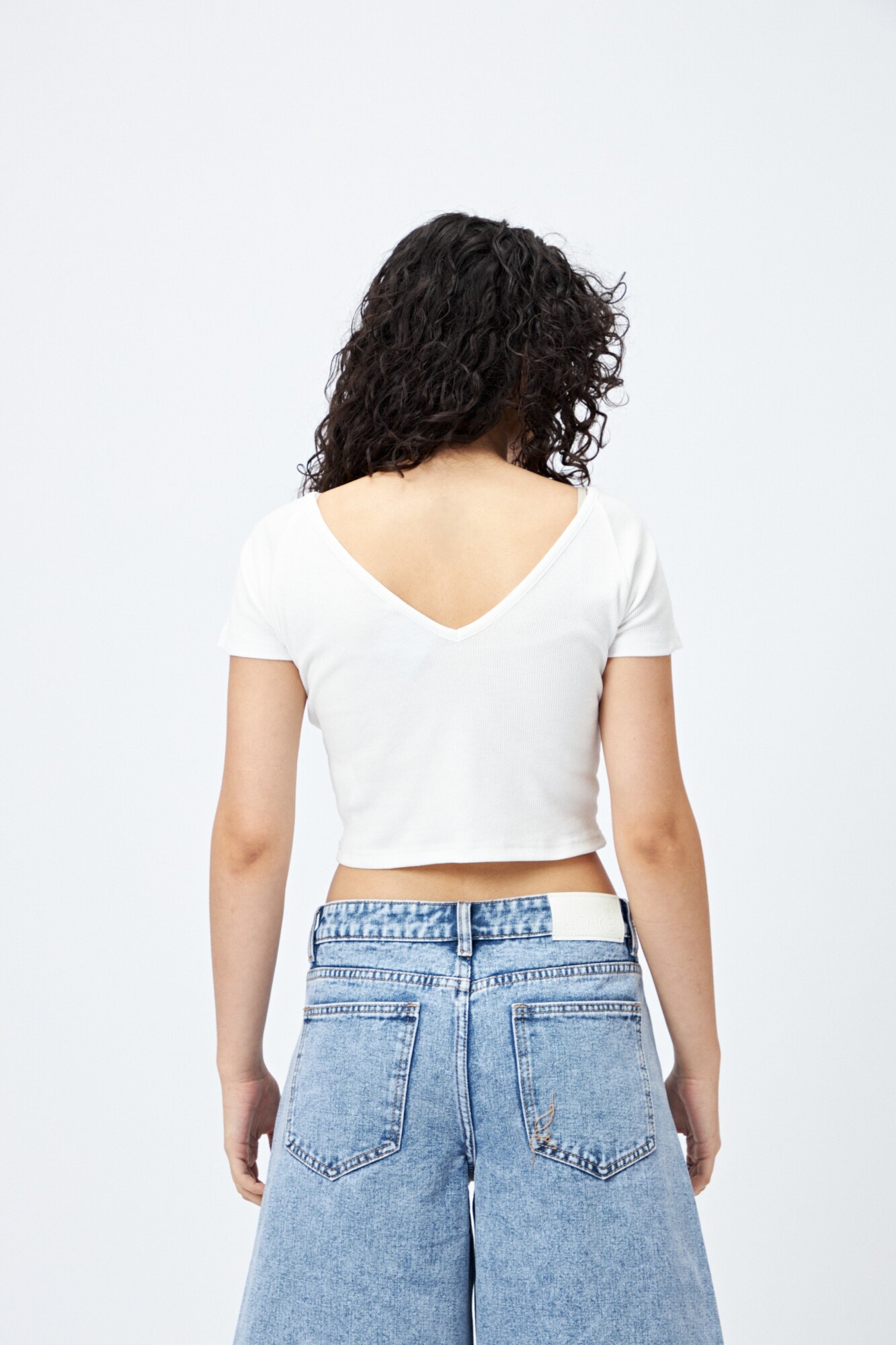Realizado en un tejido de algodón con mezcla de poliéster y elastano, este top combina suavidad, elasticidad y un calce cómodo. Su diseño con escote en V delantero y trasero resalta el cuello y la espalda de manera sutil.
