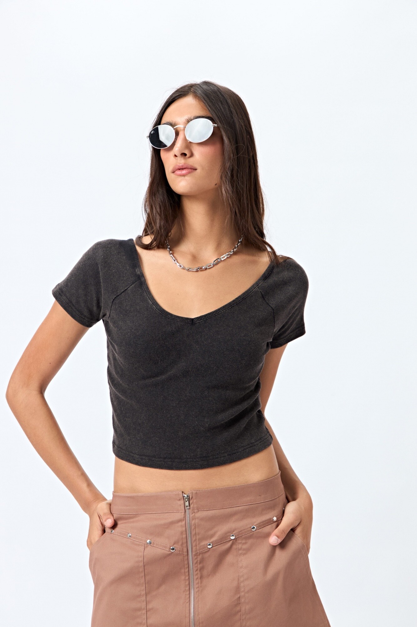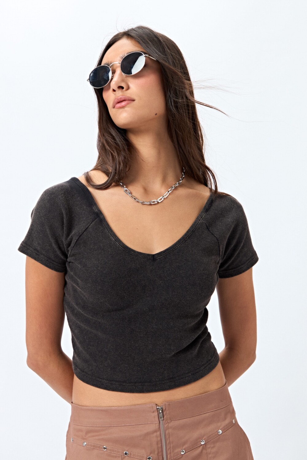 Realizado en un tejido de algodón con mezcla de poliéster y elastano, este top combina suavidad, elasticidad y un calce cómodo. Su diseño con escote en V delantero y trasero resalta el cuello y la espalda de manera sutil.