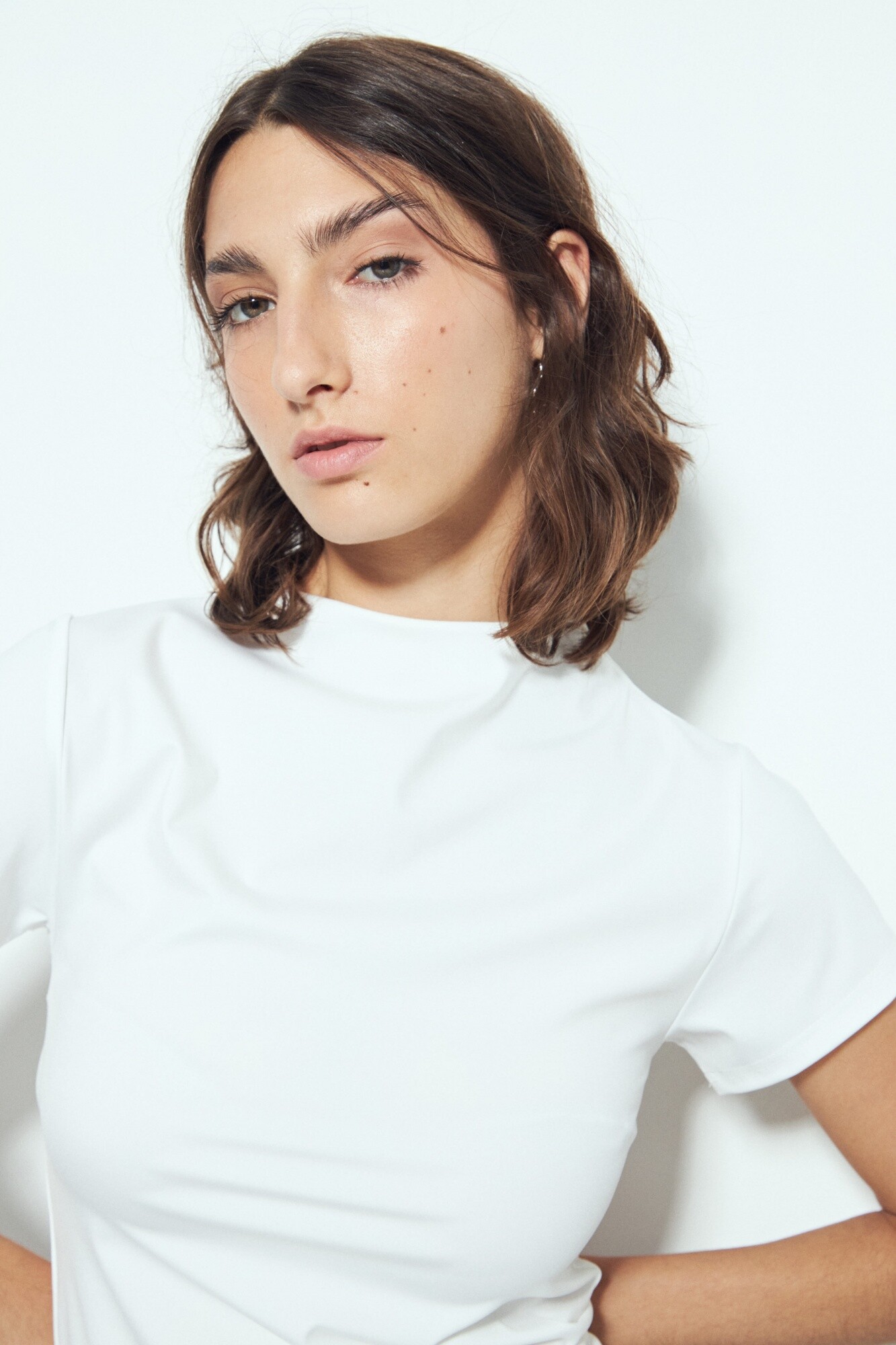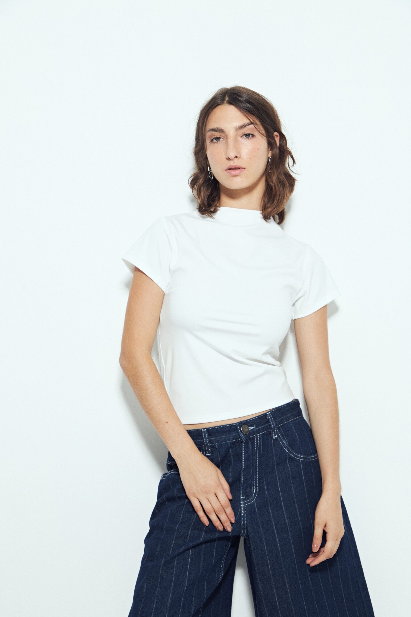 Top de manga corta con cuello alto, una prenda esencial de líneas limpias que se adapta con facilidad a distintos estilismos. Su calce ajustado acompaña la silueta con comodidad, mientras que el tejido con alto contenido de elastano aporta elasticidad, suavidad y una sensación de segunda piel.