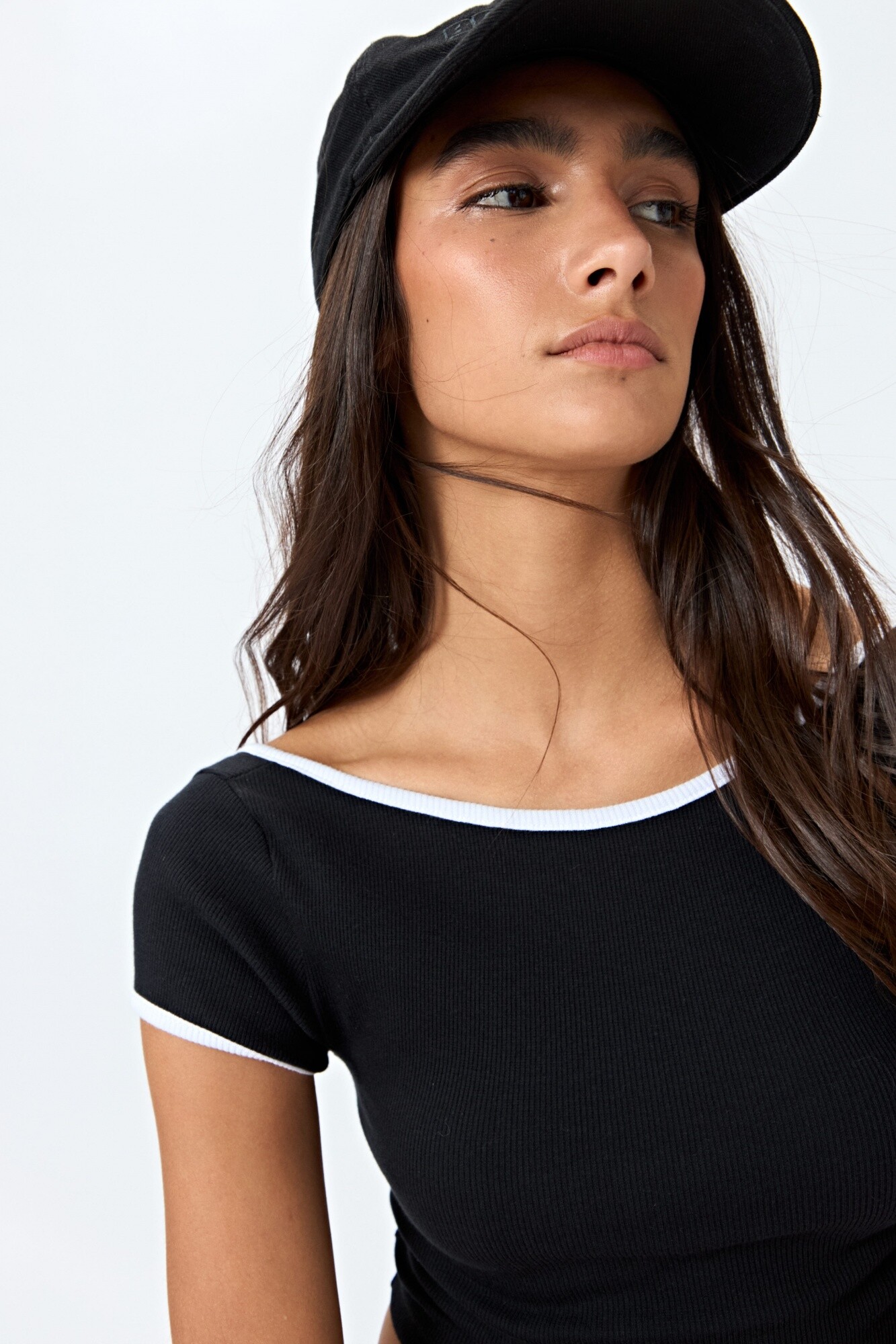 Top de silueta ajustada y largo crop, confeccionado en punto acanalado de algodón con elastano. Con escote profundo en la espalda y ribetes contrastantes, aporta un toque trendy a cualquier look casual.