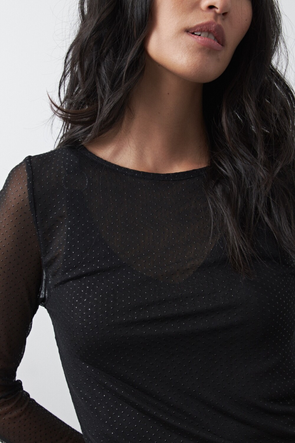 Top de manga larga confeccionado en tejido translúcido con micro textura que aporta profundidad visual y un efecto delicado al diseño. Su silueta ajustada y liviana acompaña el cuerpo con suavidad, mientras que la transparencia sutil suma un aire sofisticado ideal para estilismos nocturnos. Una prenda en tendencia que funciona como pieza protagonista y se integra fácilmente en looks urbanos o más elegantes.