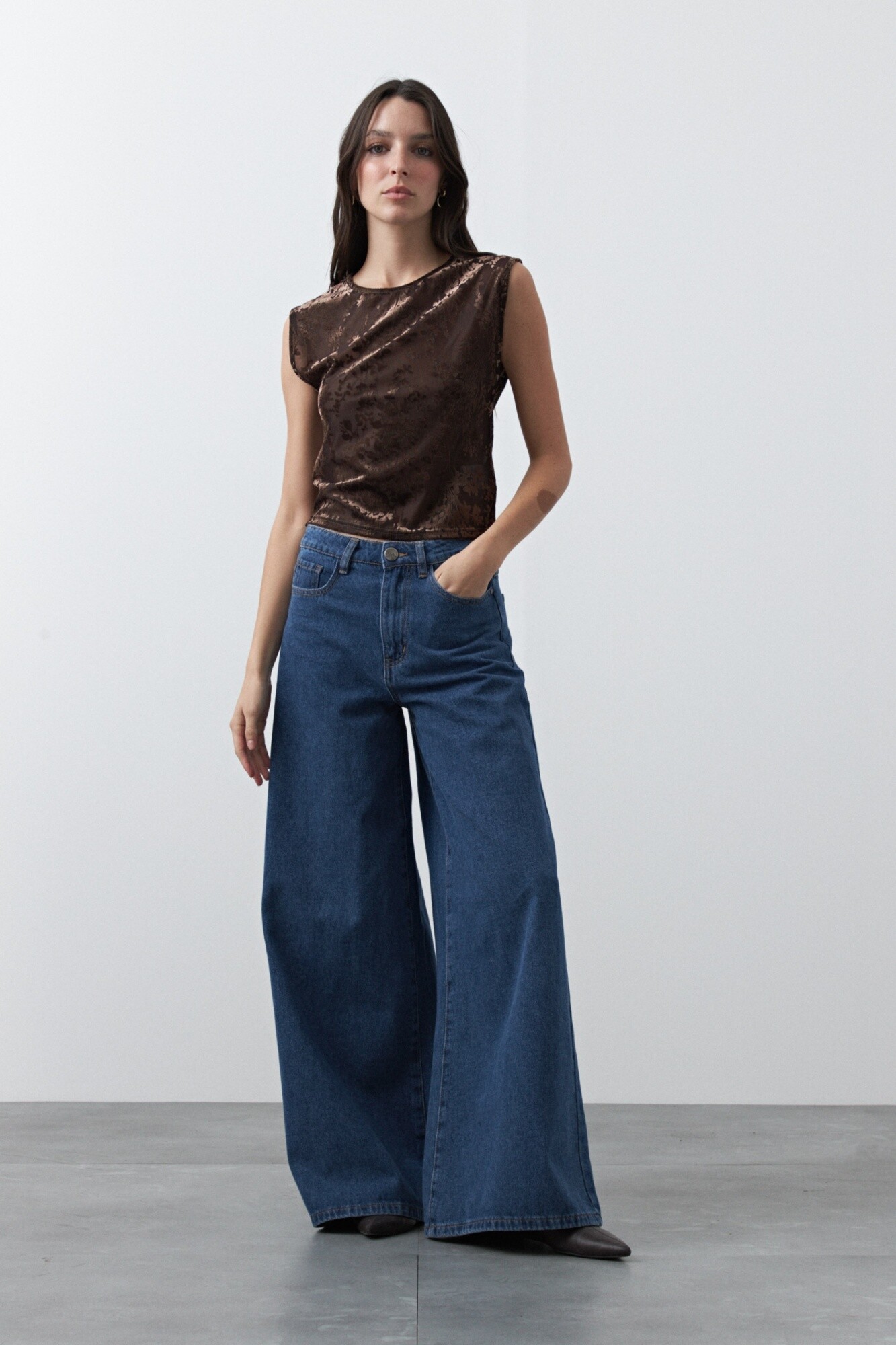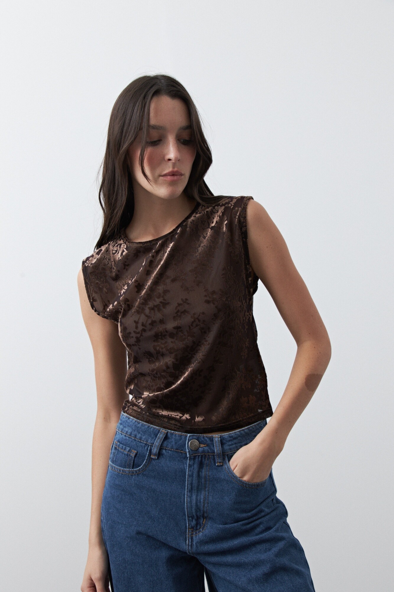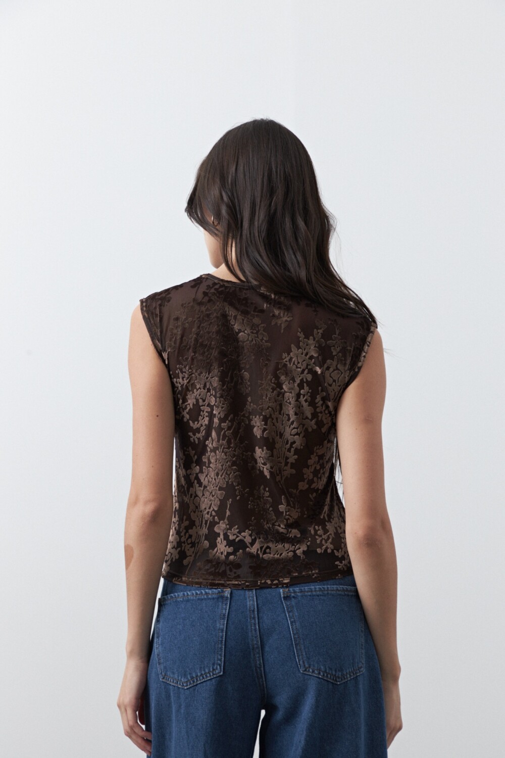 Top de tul con estampa aterciopelada que aporta textura y un efecto visual sutil. De calce al cuerpo y mangas cortas, es una prenda liviana y versátil que funciona tanto sola como en capas, ideal para elevar looks básicos y un gran aliado para un look de noche.