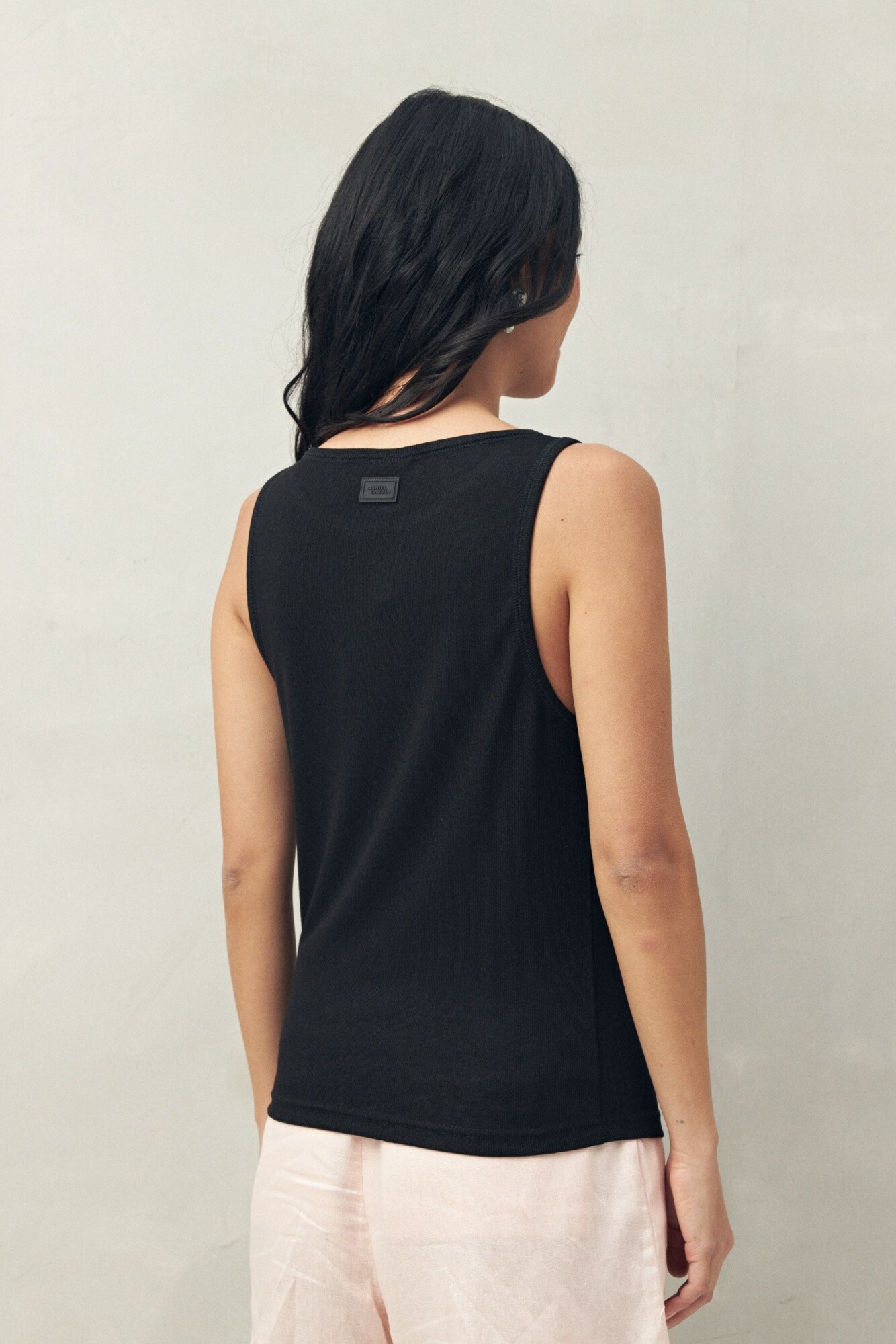 Un básico atemporal que se adapta a cualquier look. Su tejido de viscosa con toque de elasticidad aporta suavidad, caída y un calce cómodo que realza la silueta sin ajustar. Ideal para combinar con jeans, faldas o shorts, tanto en versiones casuales como más arregladas. Un infaltable del guardarropa que se renueva cada temporada por su versatilidad y estilo minimalista.