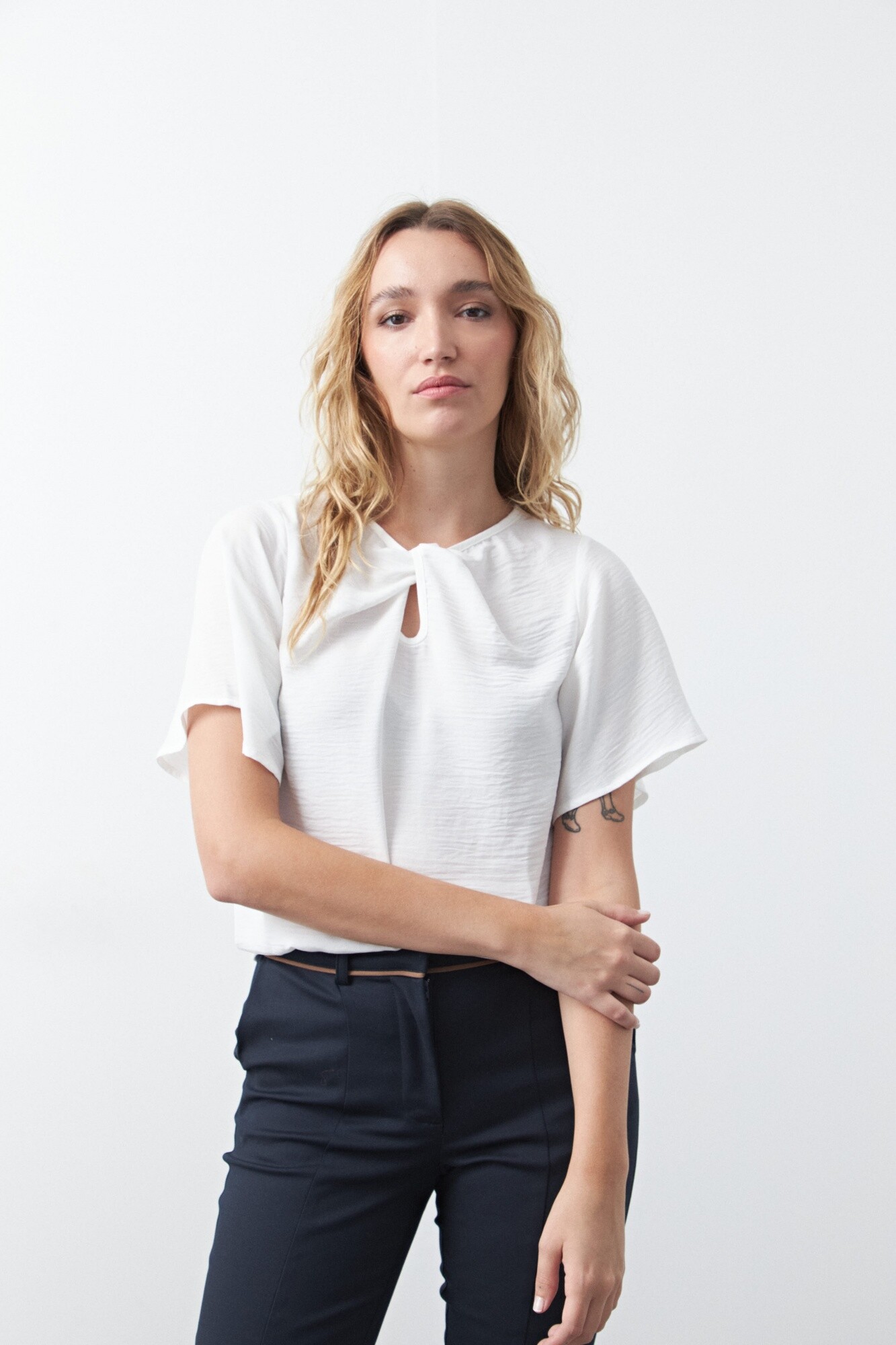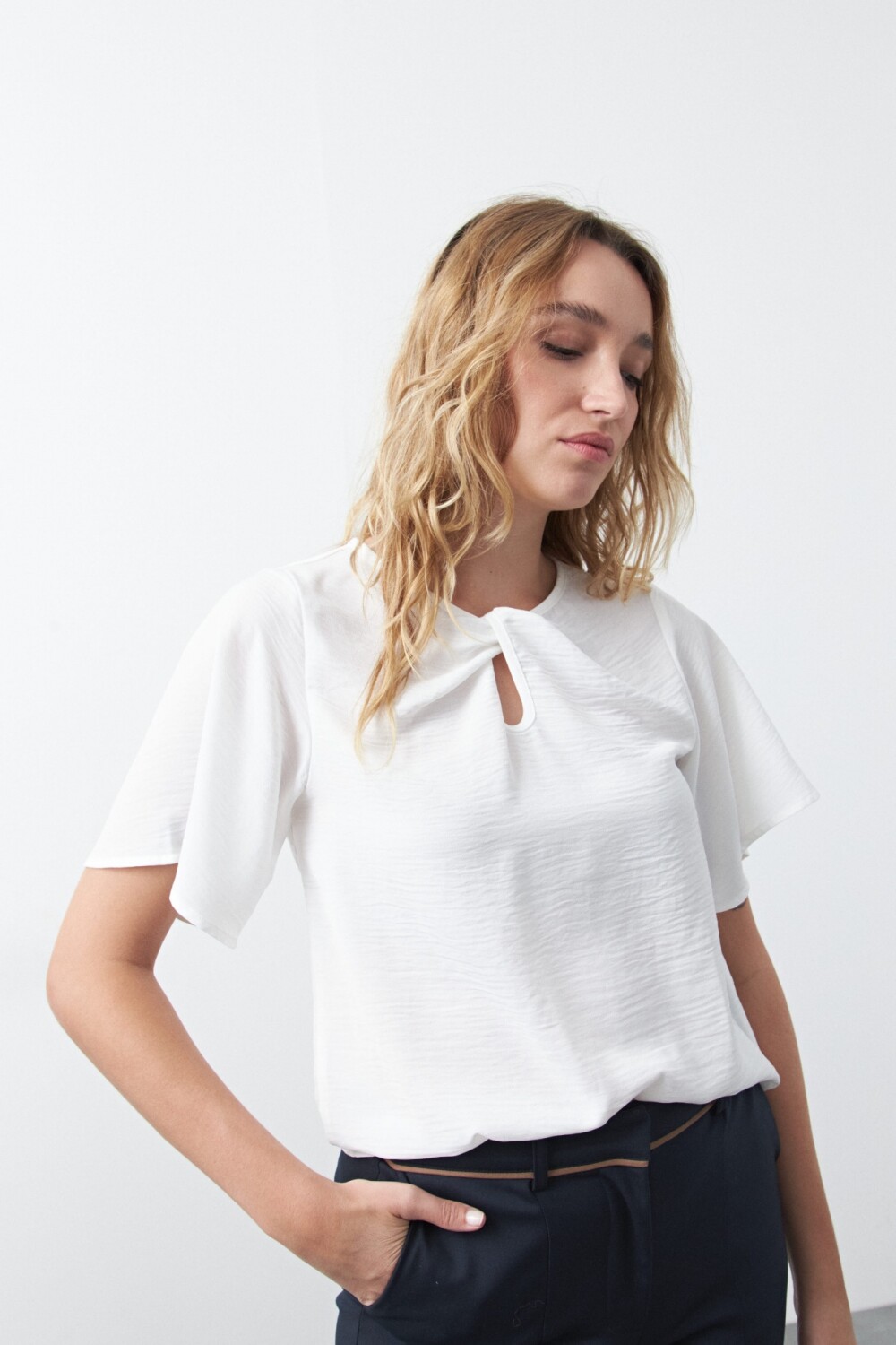 Top de manga corta con nudo frontal, pensado como una prenda clave para looks de oficina. El detalle de nudo en el escote aporta diseño y sofisticación sin perder sobriedad, mientras que la silueta relajada garantiza un calce cómodo y prolijo. Ideal para combinar con sastrería y lograr un look profesional con un diferencial sutil.