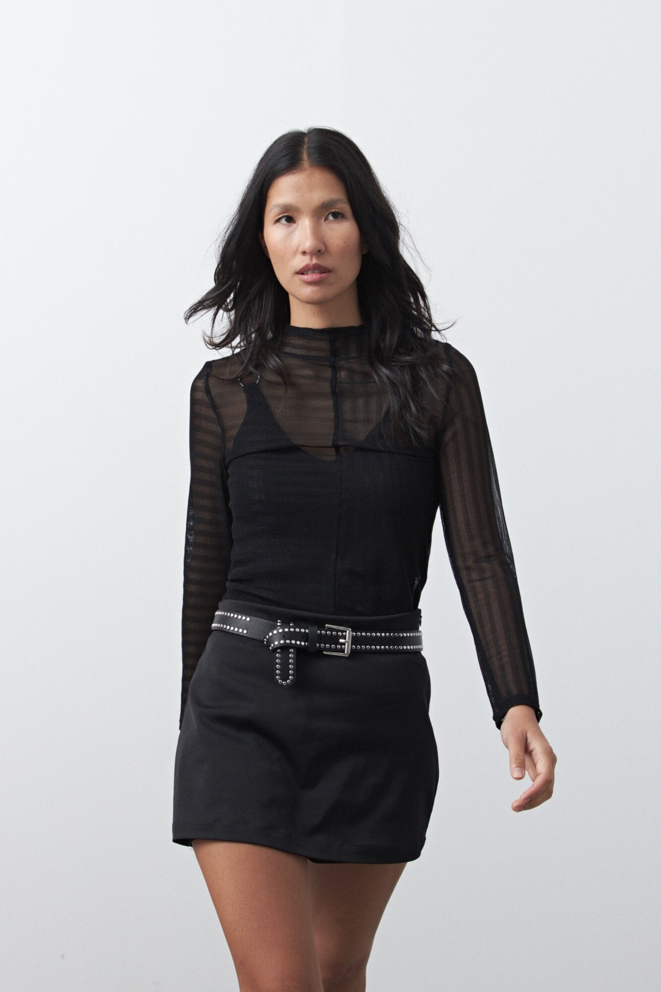 Top de mangas largas confeccionado en tejido translúcido con textura sutil a rayas, que aporta profundidad visual y un efecto moderno al diseño. Su silueta ajustada y cuello alto realzan la figura, mientras la transparencia controlada suma un aire sofisticado y actual. Una prenda en tendencia que funciona como pieza protagonista en looks nocturnos o combinada con capas para estilismos más urbanos.