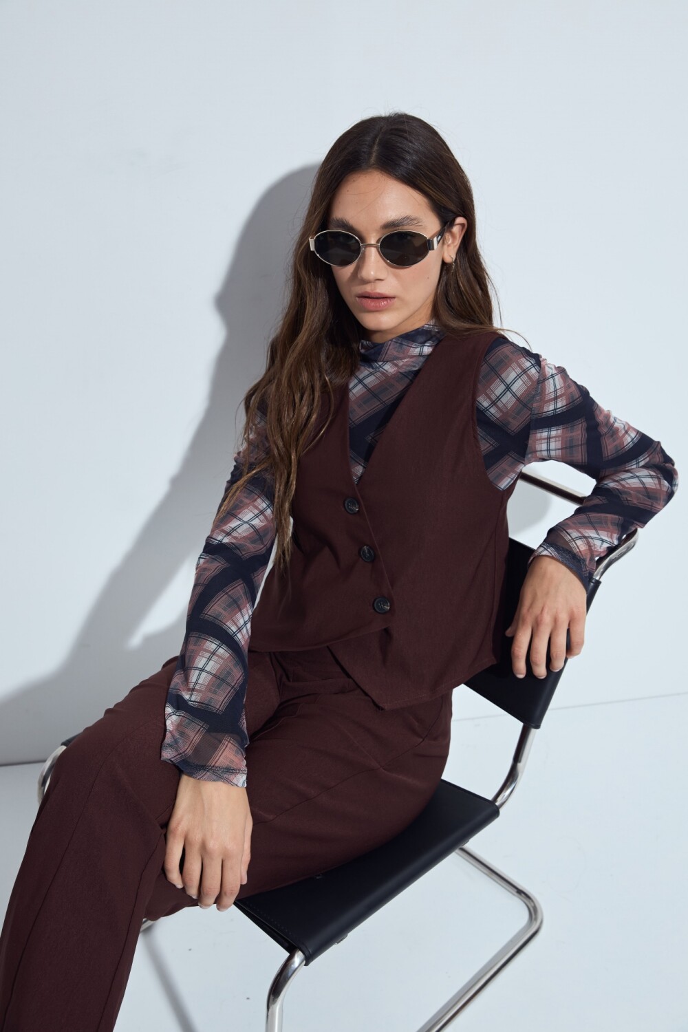 Top tipo chaleco con escote en V y frente abotonado que aporta un aire sastrero moderno. De calce entallado, es una prenda versátil que se adapta tanto a looks formales como a combinaciones más relajadas, ideal para sumar estructura y estilo sin perder comodidad.