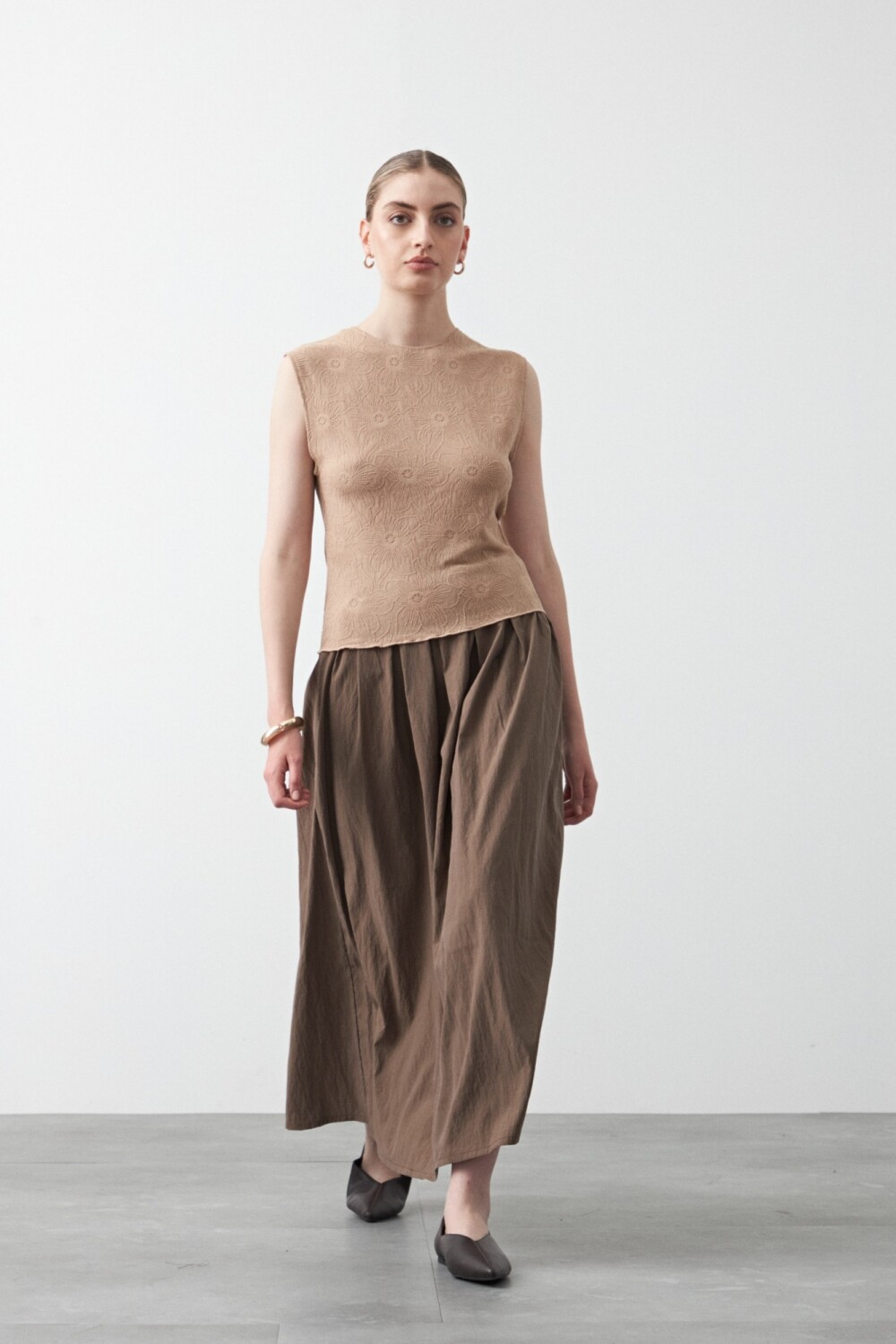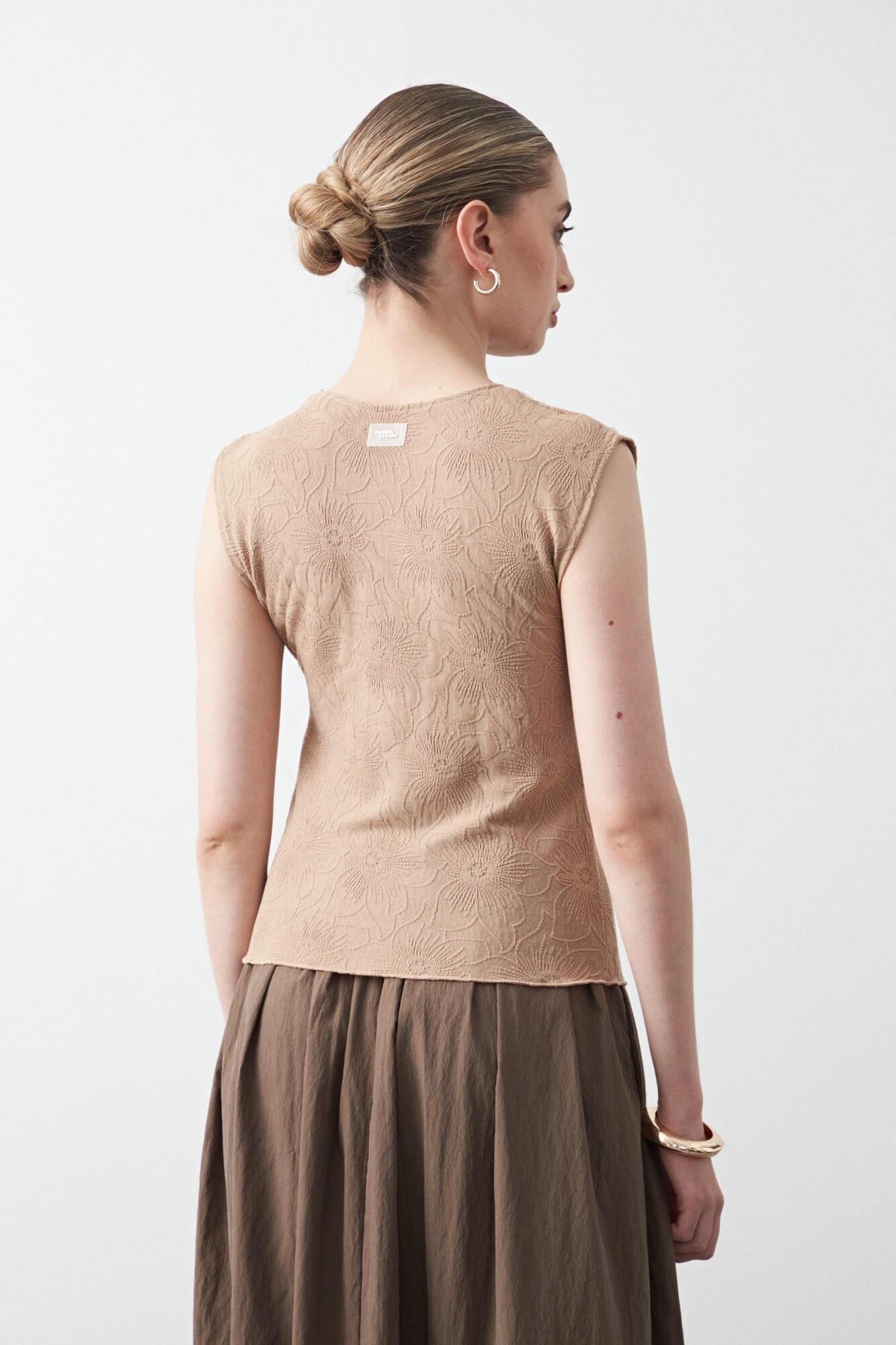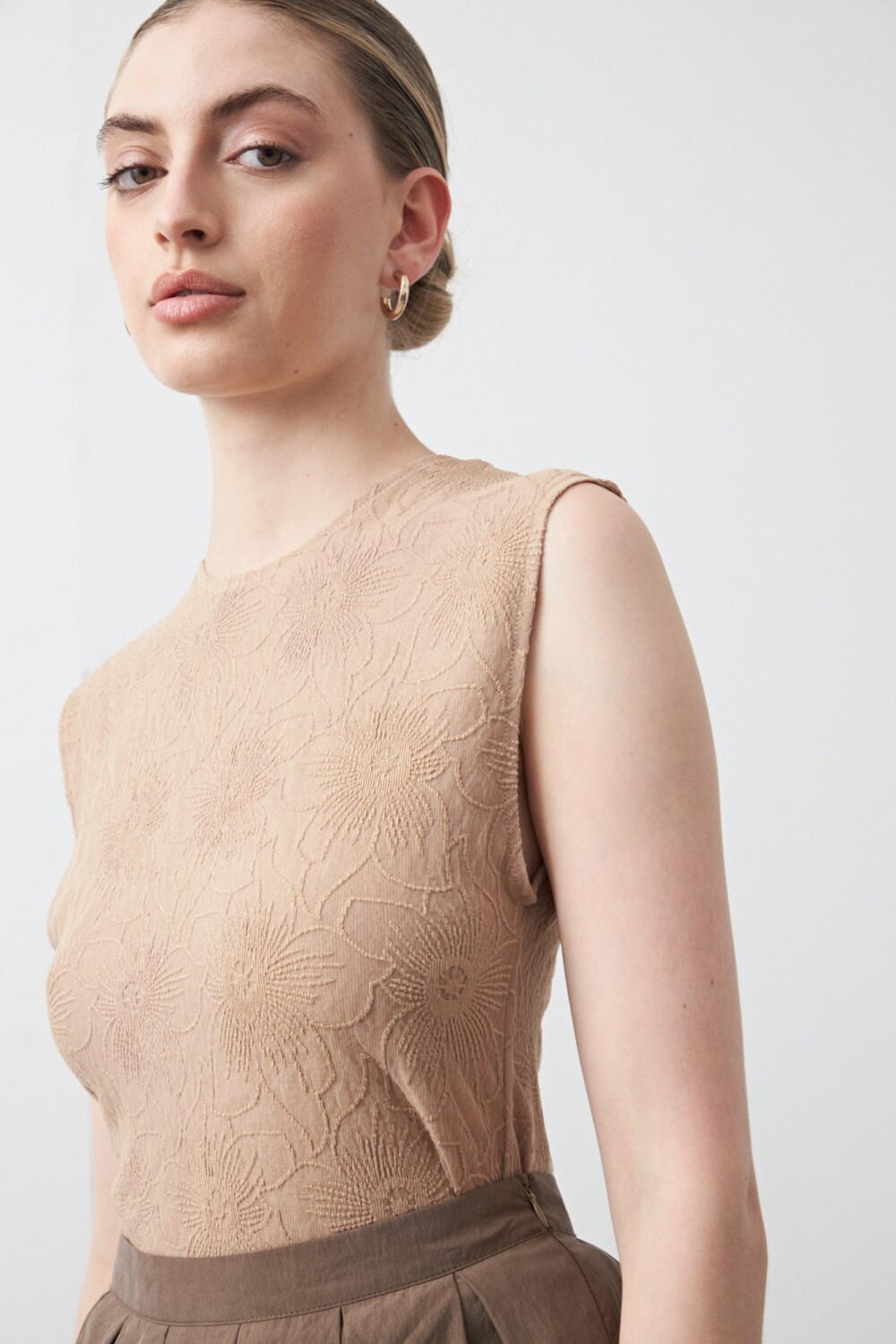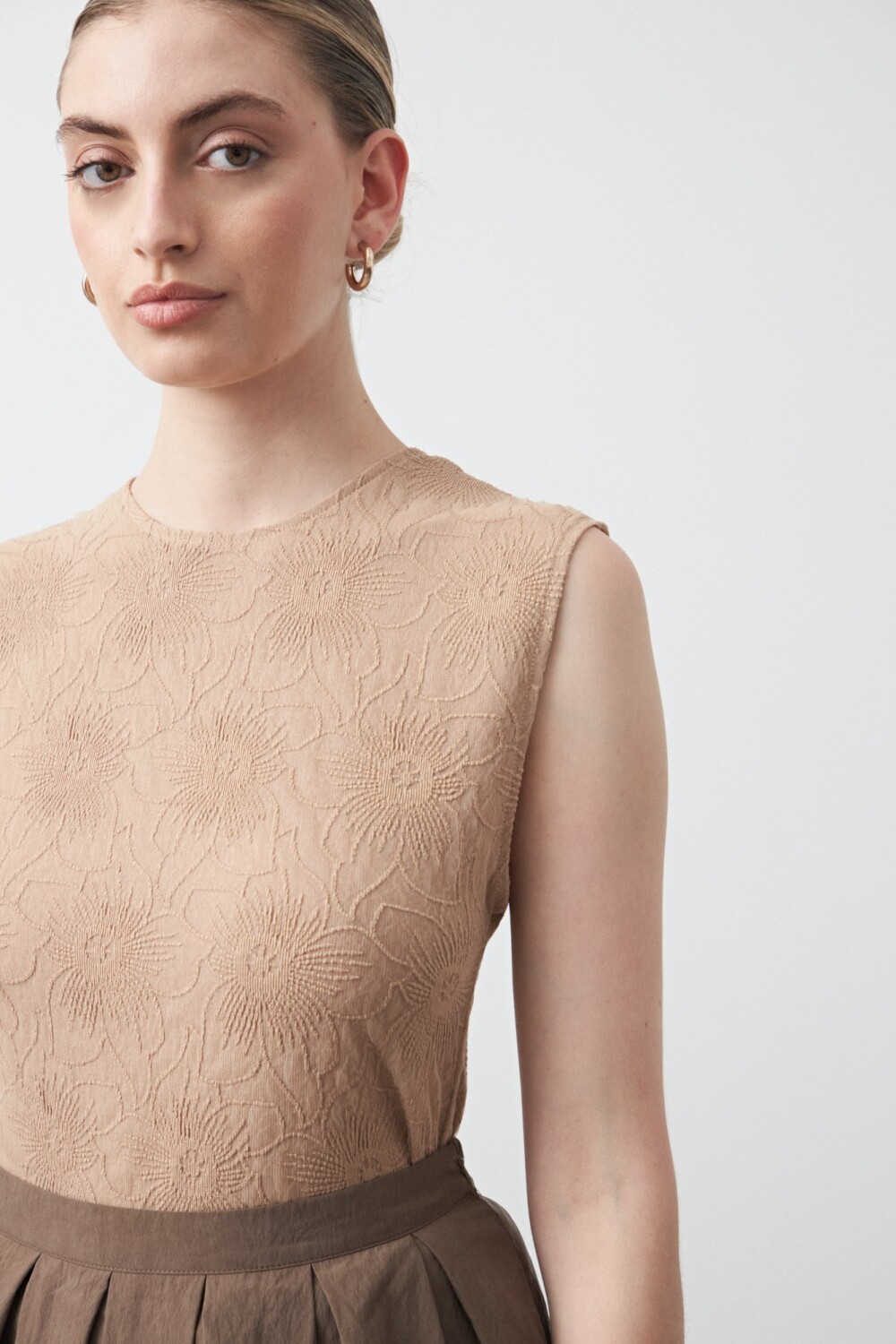 Top sin mangas de textura floral en relieve, una pieza sofisticada que eleva cualquier look desde el detalle. El diseño limpio y estructurado realza la silueta, mientras que el tejido con dibujo aporta profundidad y un carácter distintivo sin necesidad de excesos.