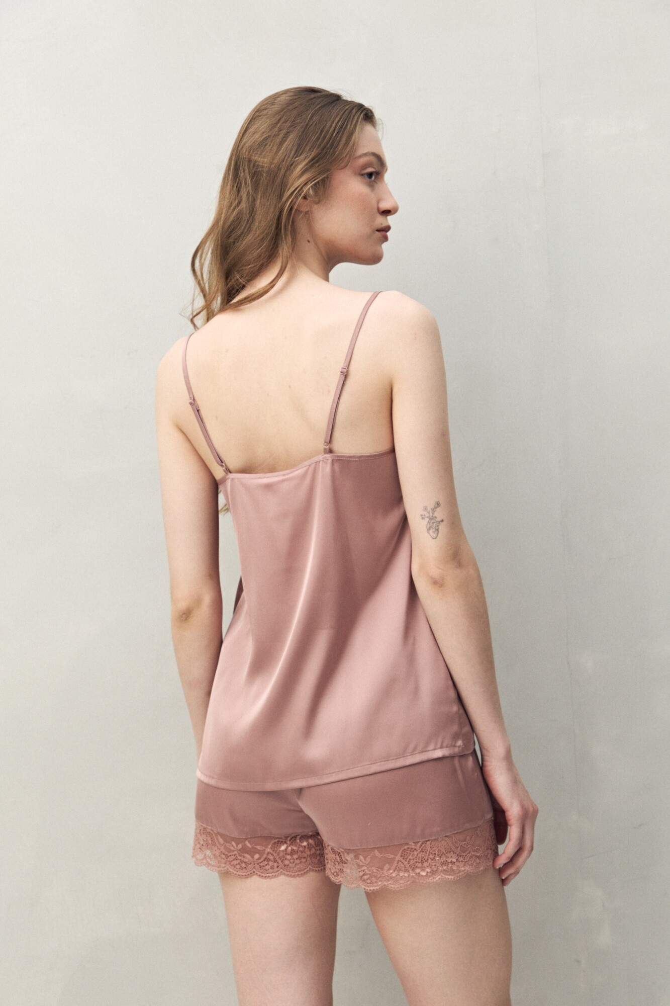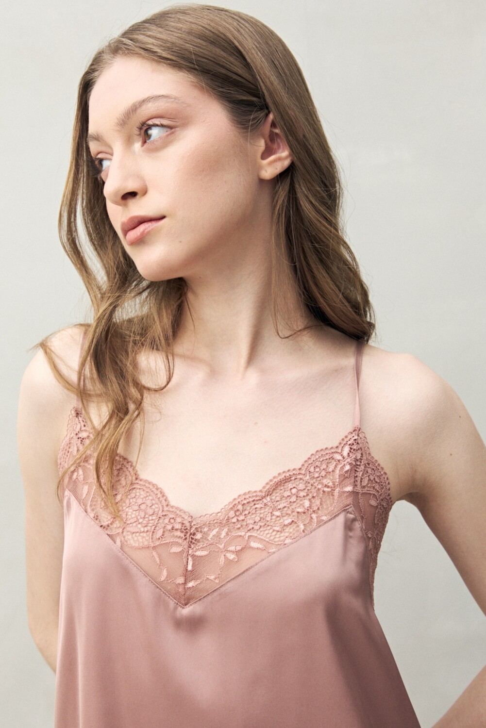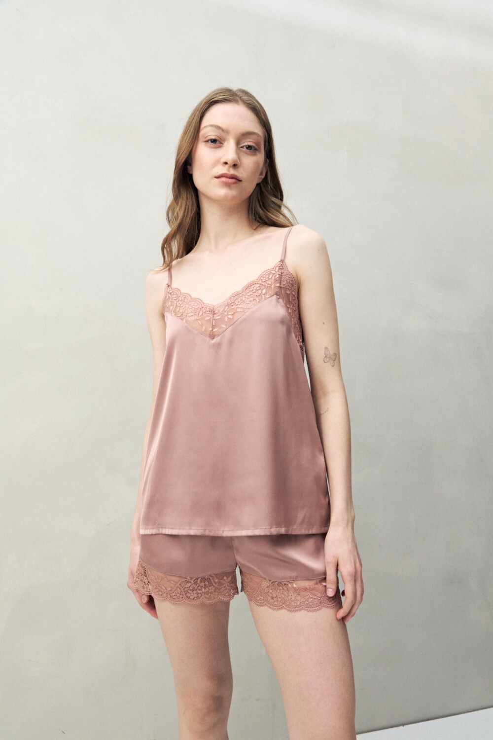 Confeccionado en tejido satinado con leve elasticidad, se distingue por su escote en V trabajado con encaje floral, un detalle característico que aporta textura, feminidad y un acabado sofisticado. Las tiras finas regulables aseguran un calce cómodo, mientras que la caída fluida acompaña el cuerpo con suavidad. Una prenda liviana y elegante, ideal para sumar un diferencial al descanso.