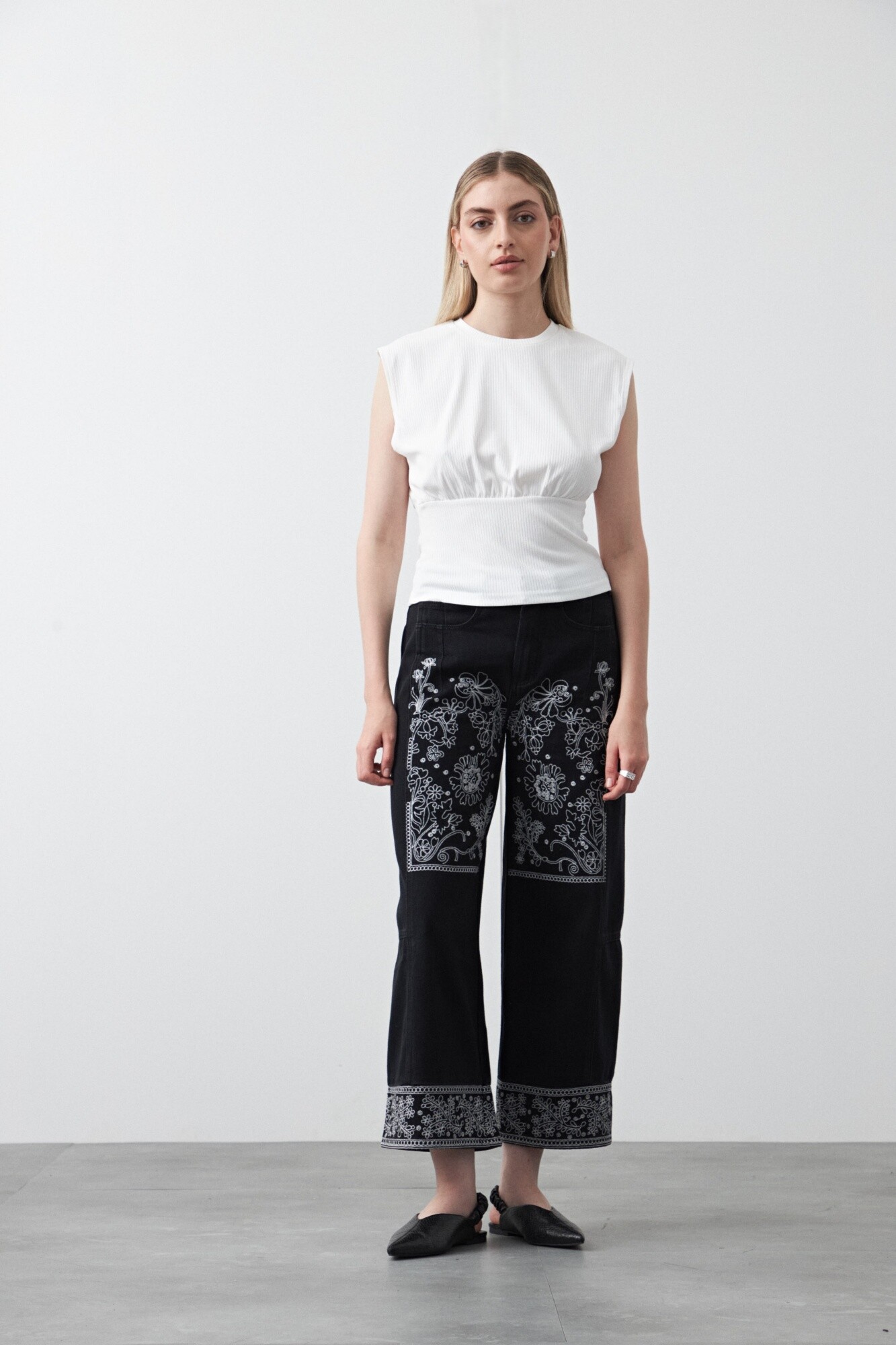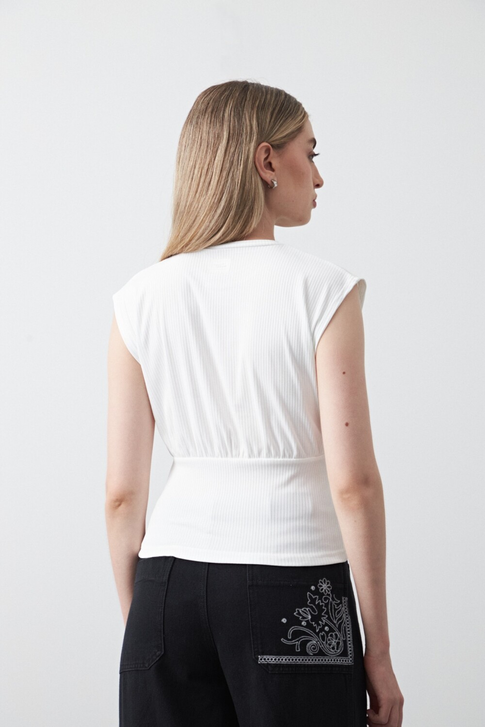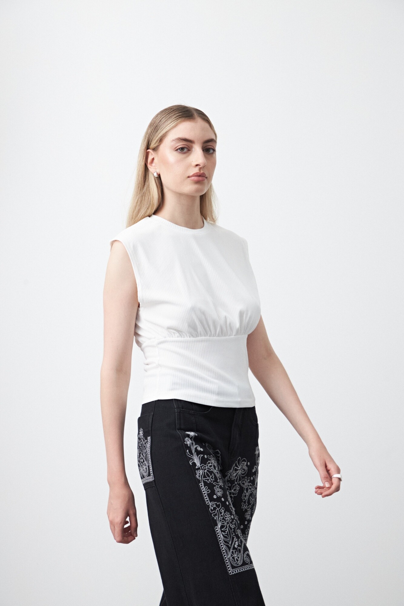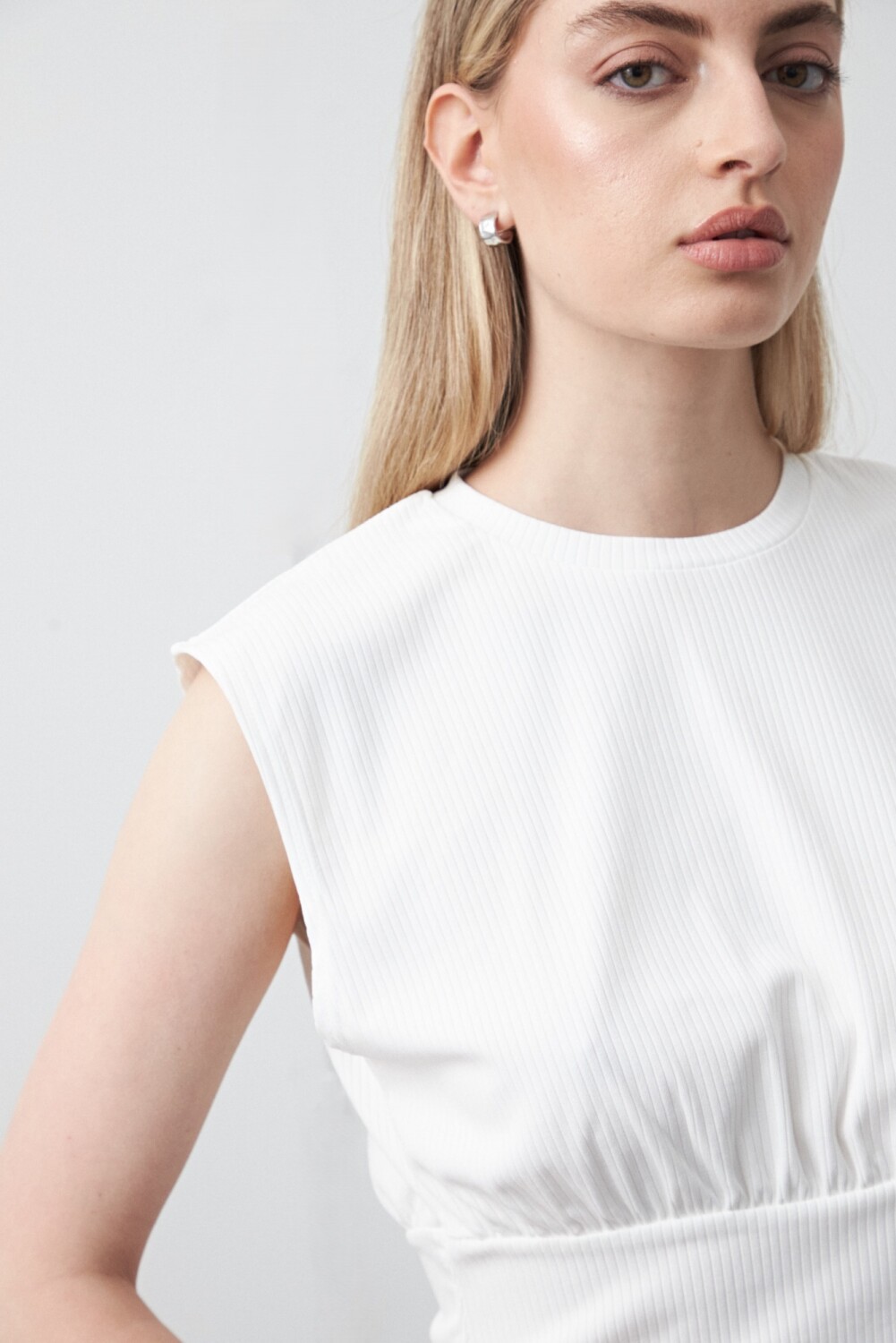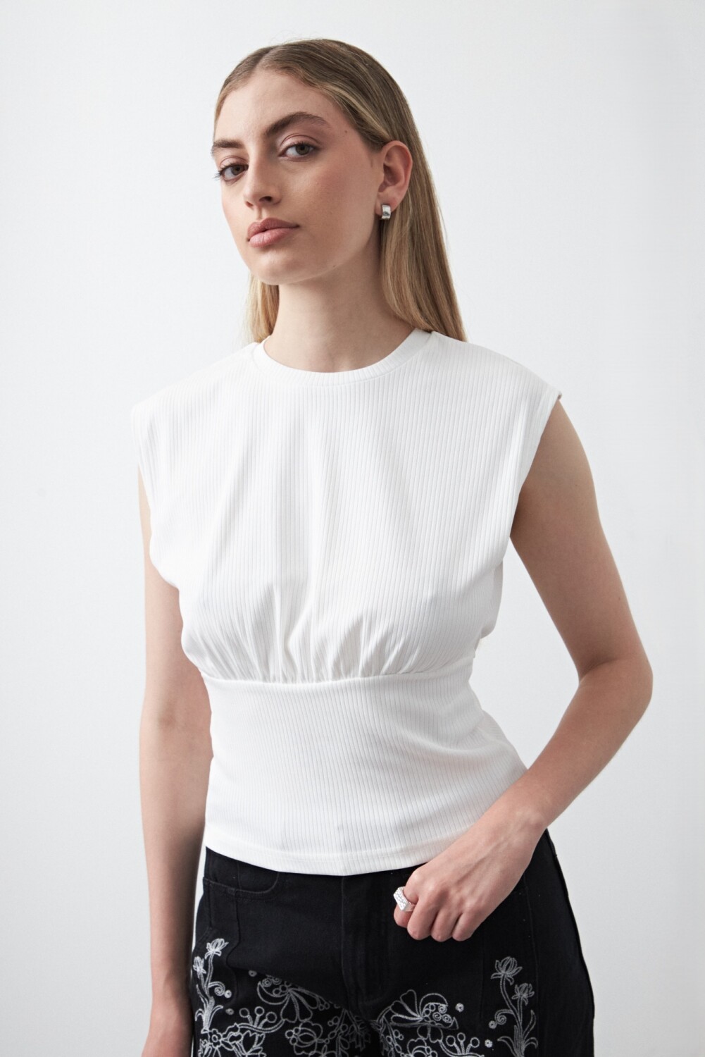 Top sin mangas confeccionado en tejido acanalado con elasticidad, que acompaña la silueta de forma cómoda y prolija. El diseño suma hombros definidos y un recorte bajo el busto que realza la forma y aporta estructura, logrando un equilibrio entre minimalismo y detalle. Una prenda versátil, ideal para looks urbanos o más sofisticados, clave para elevar cualquier look desde una silueta limpia y actual.