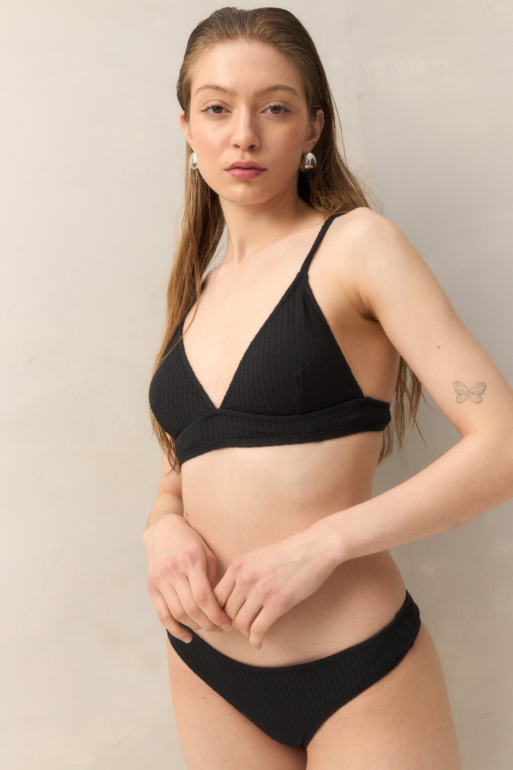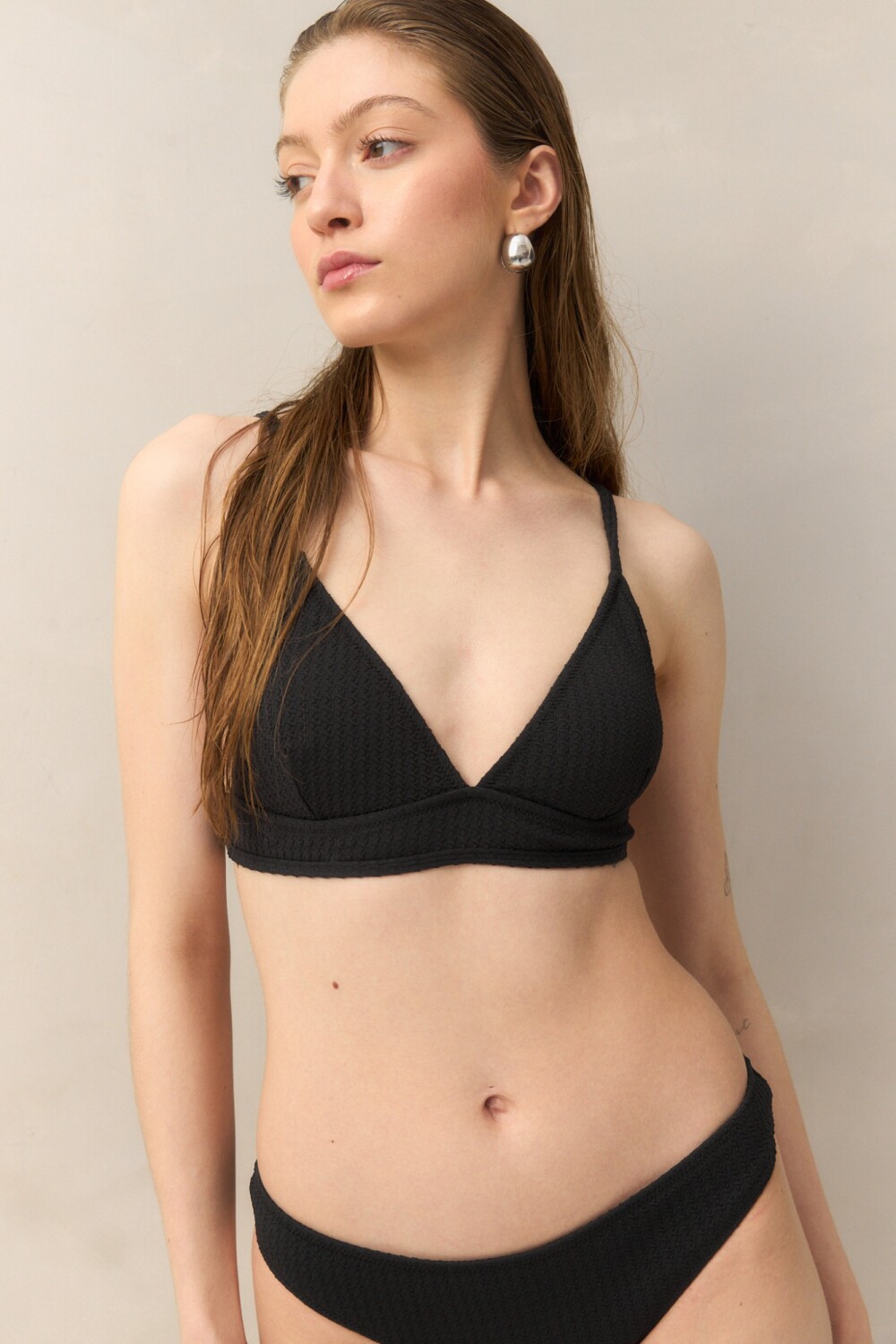 Diseño de top triangulo con breteles finos regulables. Confeccionado en tejido texturado con elasticidad, ofrece un calce cómodo y favorecedor que acompaña el movimiento. Su textura distintiva le aporta un toque moderno y femenino, ideal para disfrutar del verano con estilo. Una apuesta fresca para el look de playa o pileta.