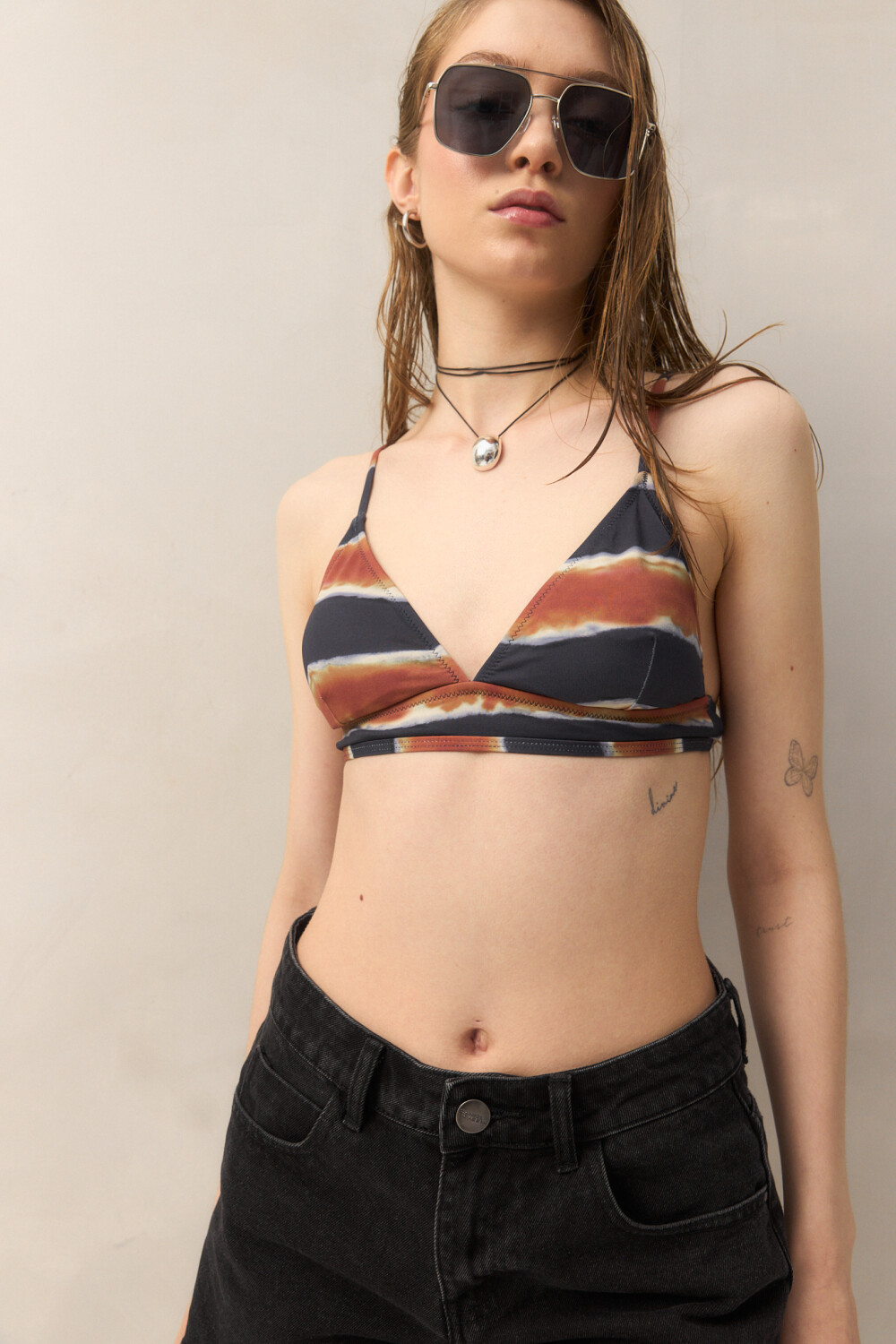 Bikini tipo triángulo con breteles finos regulables y base ancha bajo el busto que brinda soporte y comodidad. Su tejido con elastano aporta flexibilidad y un calce adaptable, mientras que el estampado le da un aire veraniego y moderno. Ideal para combinar con prendas de lino o denim y crear un look de playa o festival con actitud relajada.