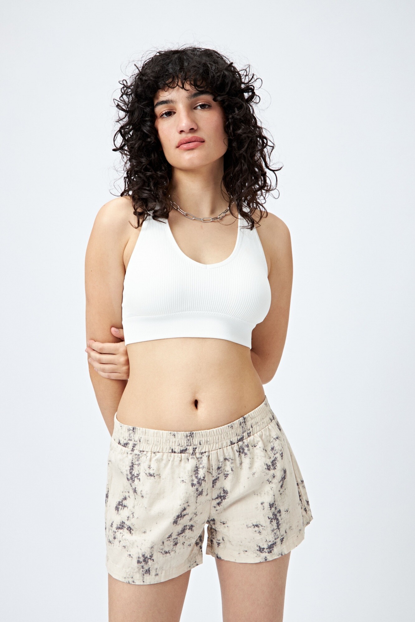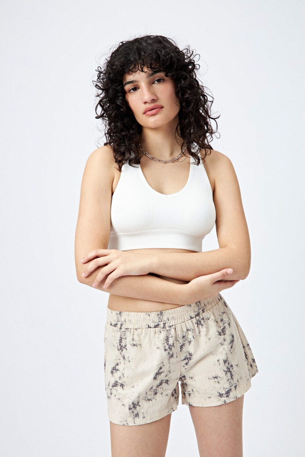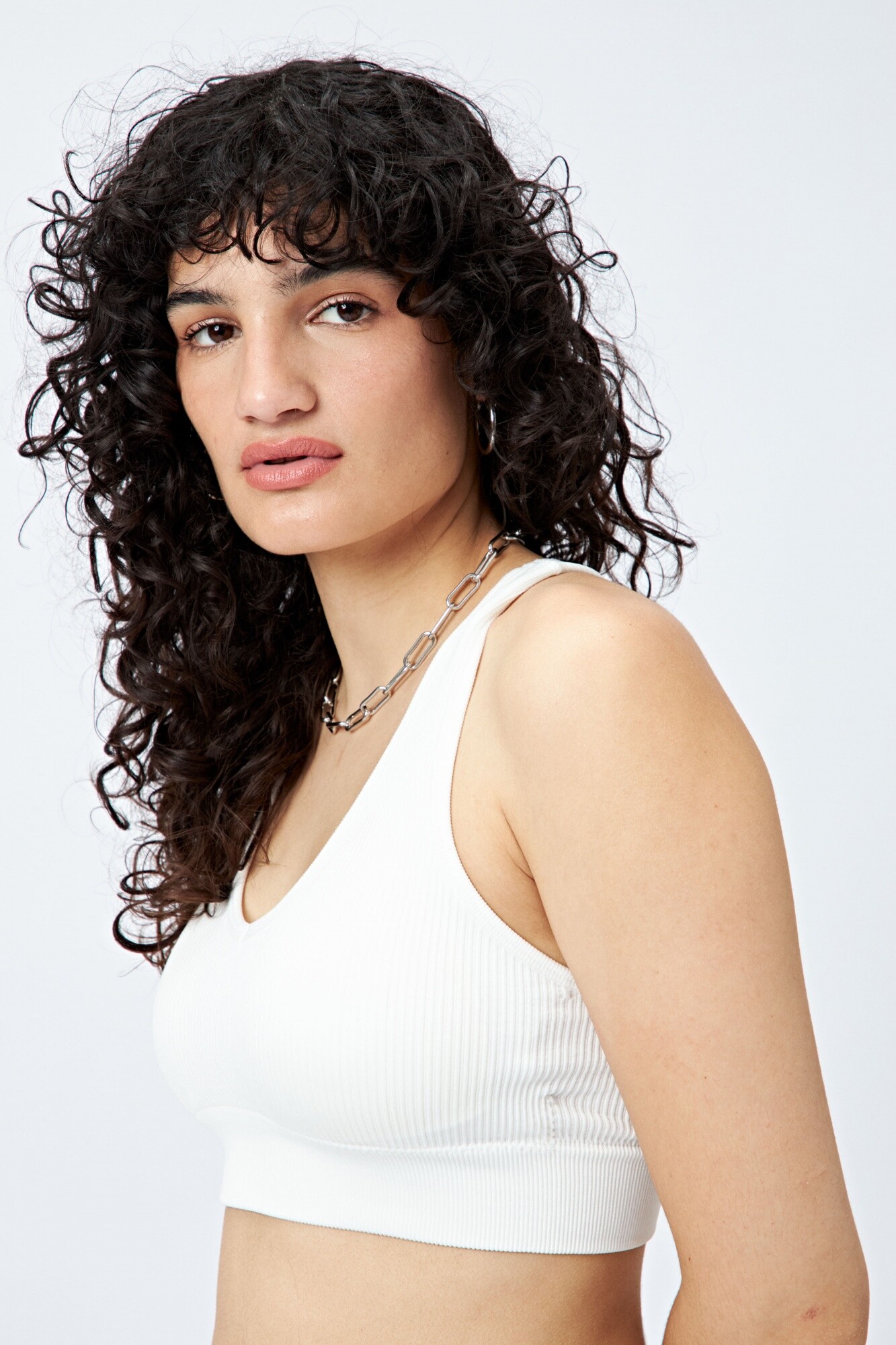 Top estilo deportivo de diseño seamless que se adapta con suavidad al cuerpo. El escote en V y los breteles anchos le dan un aire atlético sin resignar estilo. Ideal para sumar contraste a un look urbano o llevar solo cuando sube la temperatura.