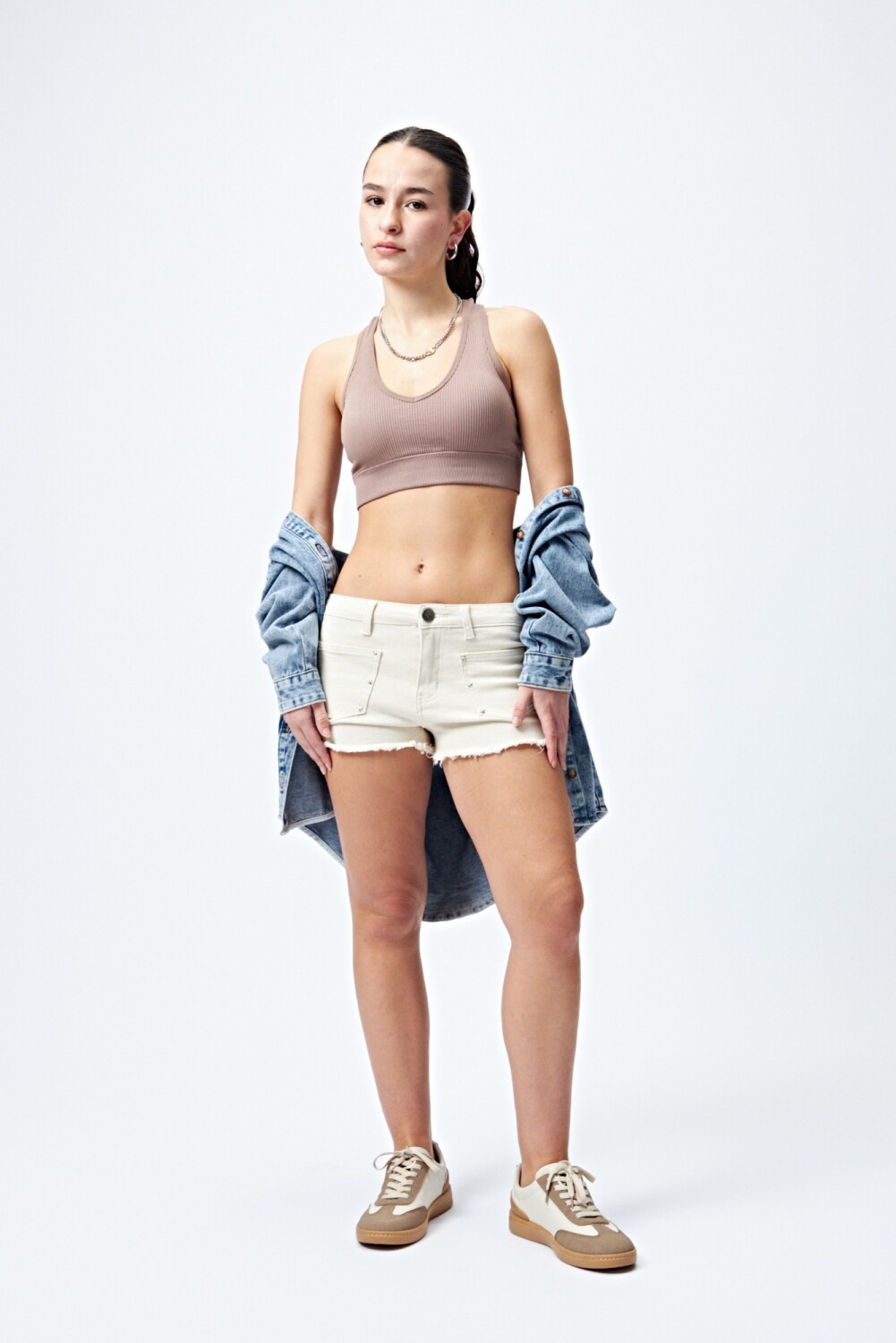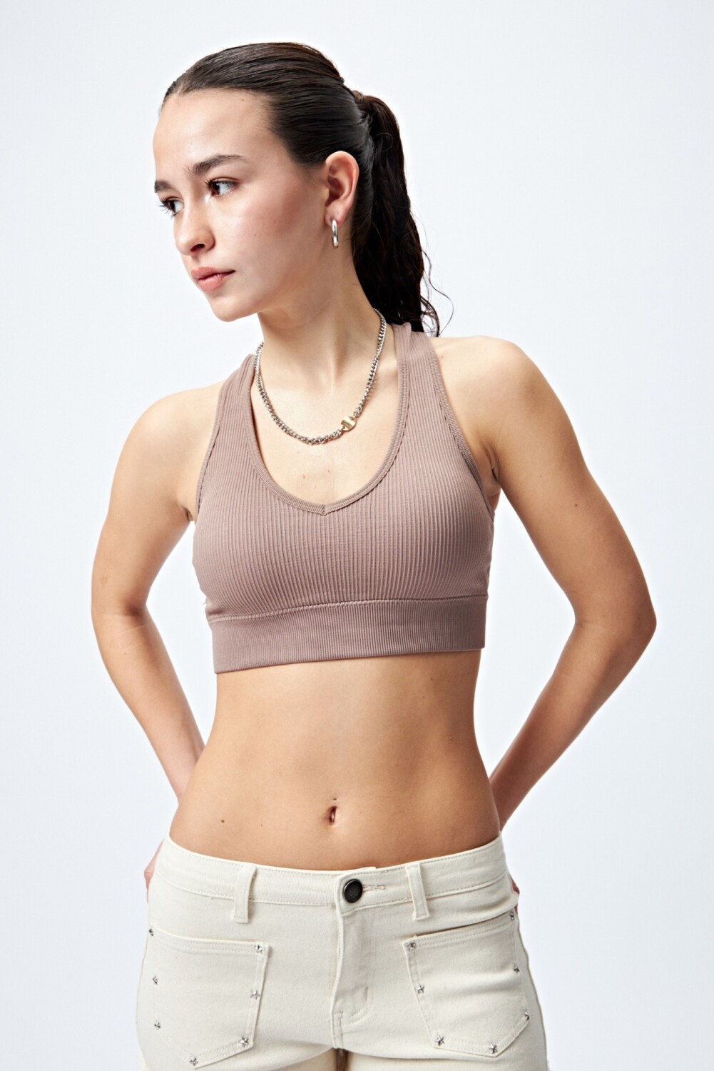 Top estilo deportivo de diseño seamless que se adapta con suavidad al cuerpo. El escote en V y los breteles anchos le dan un aire atlético sin resignar estilo. Ideal para sumar contraste a un look urbano o llevar solo cuando sube la temperatura.
