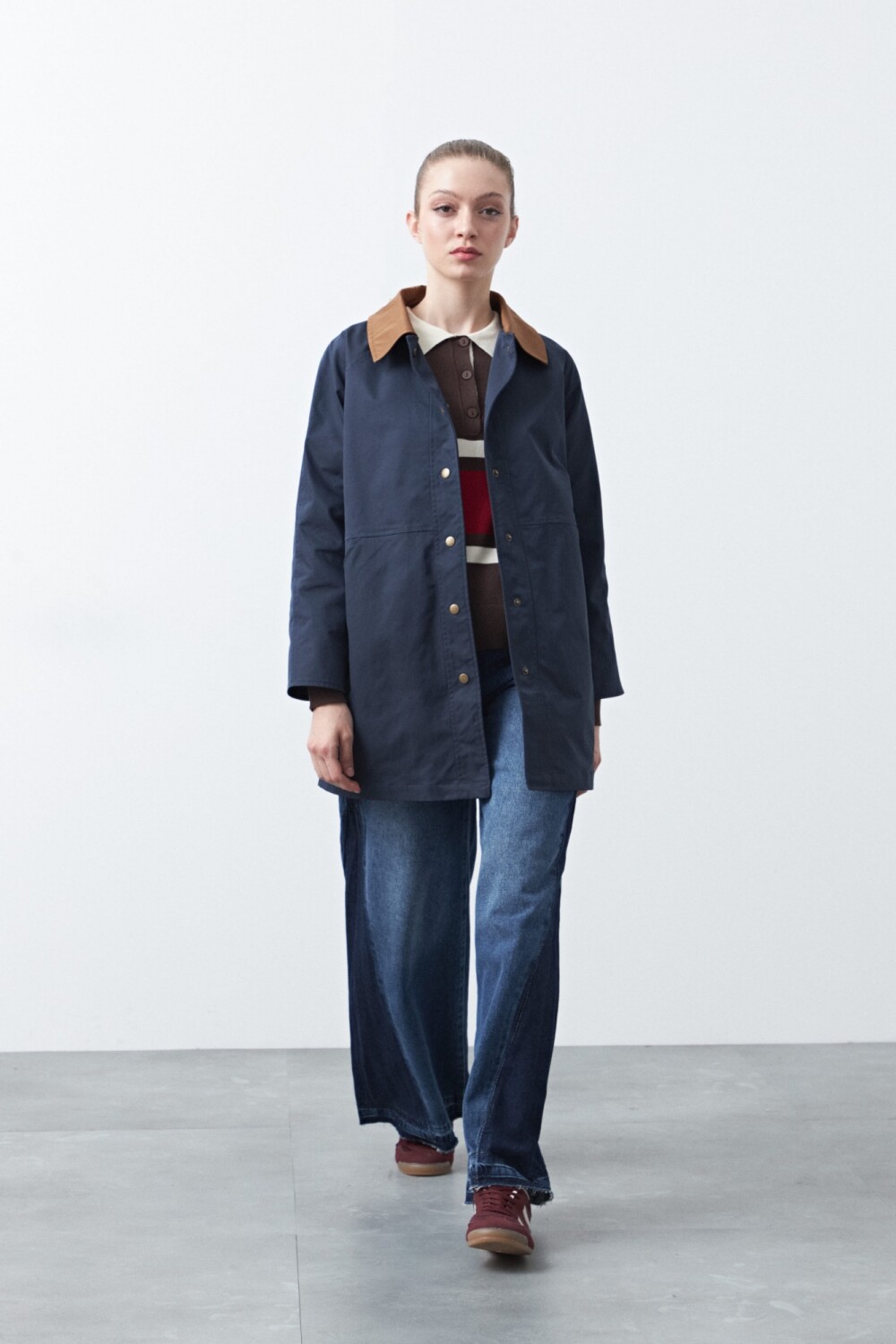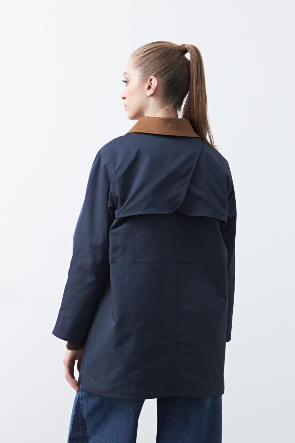 Trench tipo barn jacket, inspirado en las clásicas chaquetas de trabajo rural que, con el paso del tiempo, se consolidaron como un ícono del guardarropa funcional y urbano. De silueta recta y calce cómodo, presenta cuello camisero en contraste, cierre frontal con broches y bolsillos amplios que refuerzan su impronta práctica y atemporal.