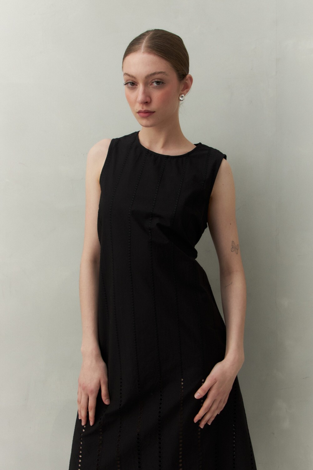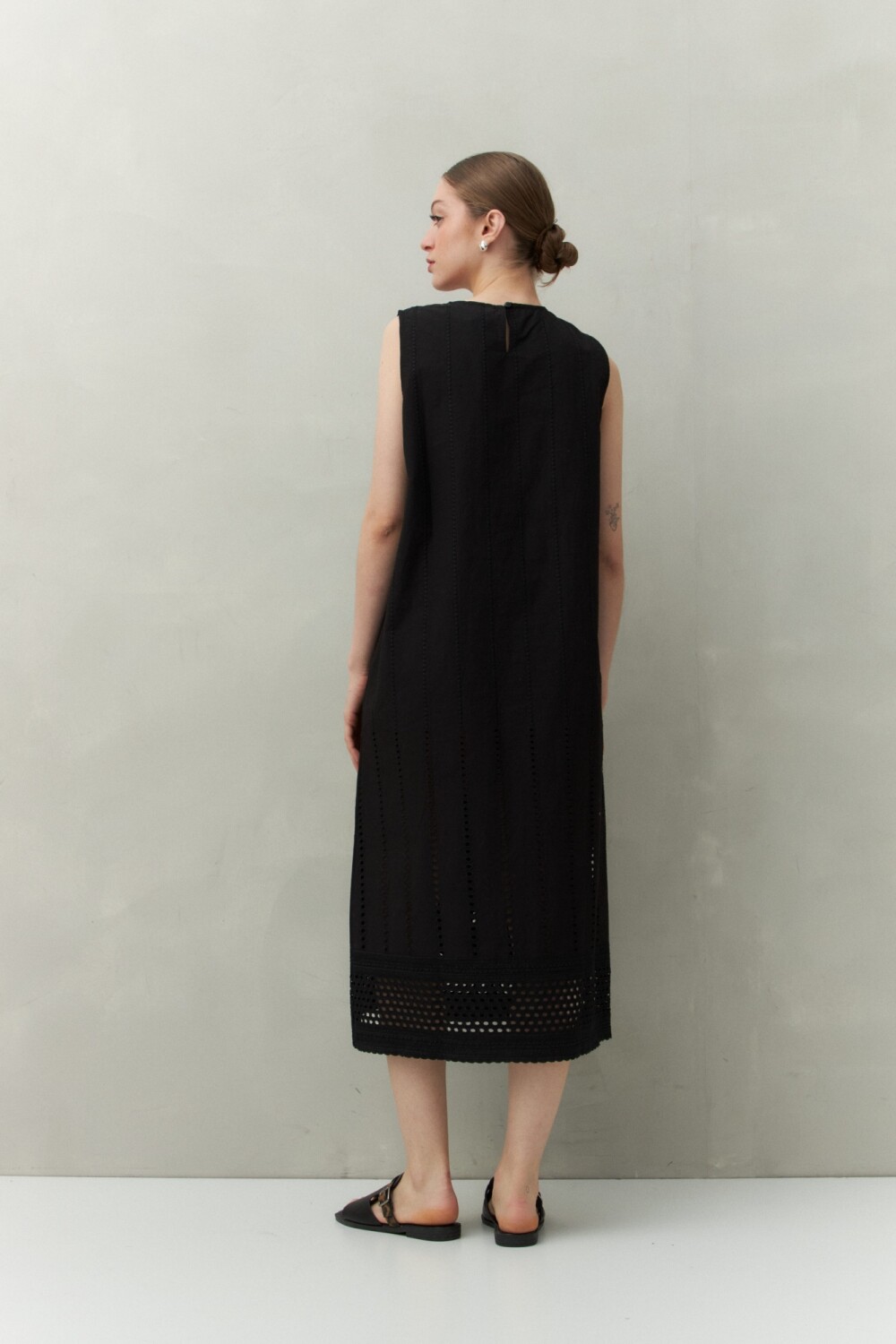 Vestido largo sin mangas confeccionado en algodón con delicados calados verticales y bordado tipo ojo de perdiz. Su silueta recta y liviana transmite frescura y elegancia natural, ideal para un look veraniego con esencia boho chic.