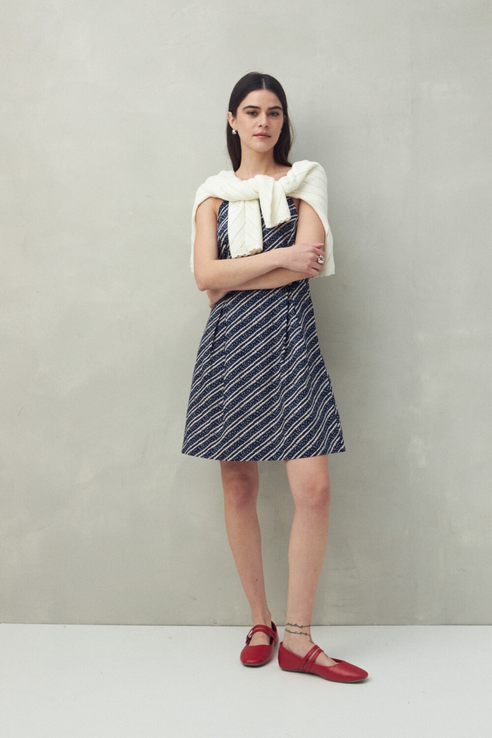 Vestido corto de algodón con breteles finos y escote recto. Su silueta ajustada con pinzas realza la figura y equilibra la frescura del tejido con un toque femenino. Ideal para looks de día con sandalias o para la noche con accesorios llamativos.