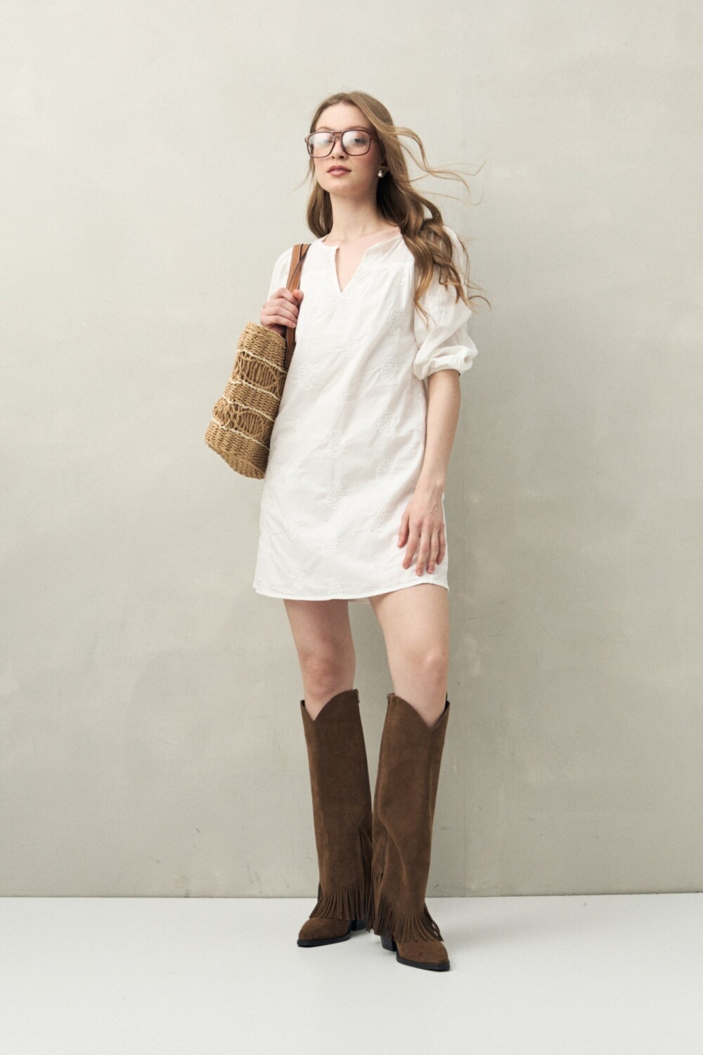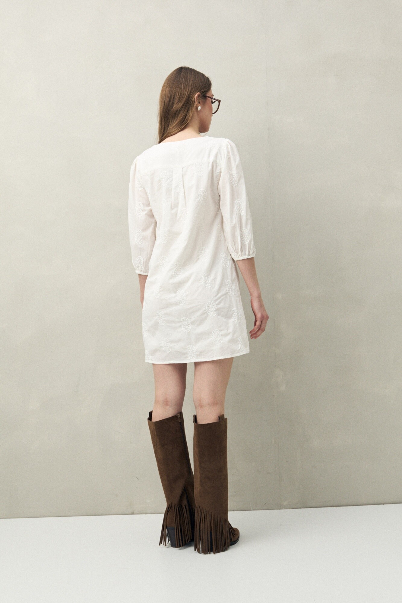 Vestido corto con bordado artesanal tipo paisley, confeccionado en algodón puro. Presenta escote en V, mangas 3/4 con elástico y una silueta relajada que aporta movimiento y frescura. Su textura liviana y natural lo convierte en un infaltable para los días cálidos o para un look boho chic en la ciudad. Ideal para combinar con sandalias planas o botas cortas, según la ocasión.