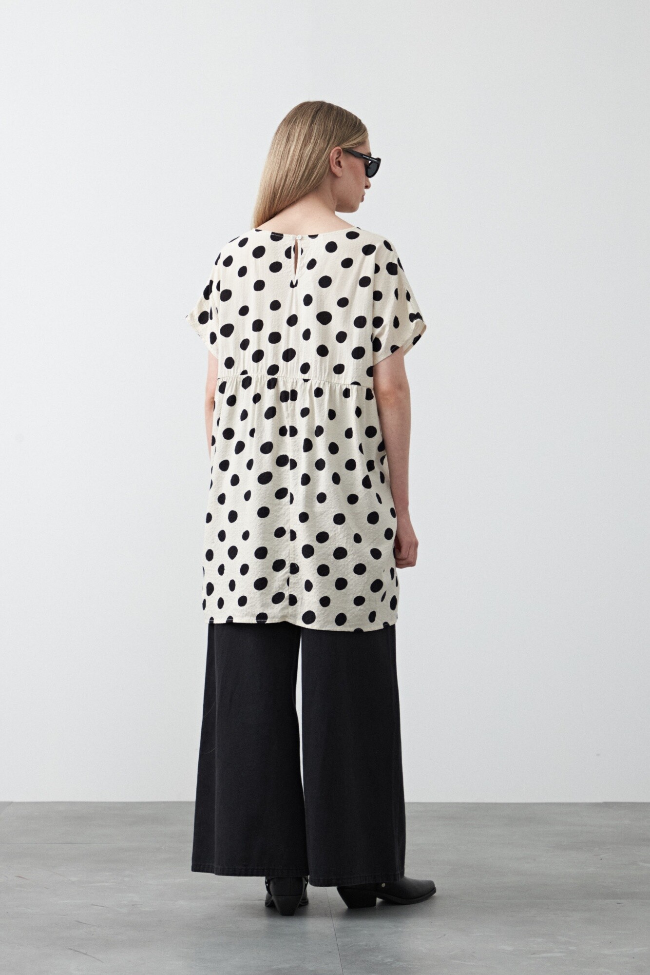 Vestido corto estampado de silueta amplia con corte bajo busto que aporta una caída suelta y movimiento natural. Presenta cuello a la base y mangas cortas con terminación relajada, logrando un diseño cómodo y actual. El tejido liviano acompaña el cuerpo sin ajustar, ideal para usar solo o en capas y sumar un toque trendy a looks de día, clave para elevar cualquier look con facilidad.