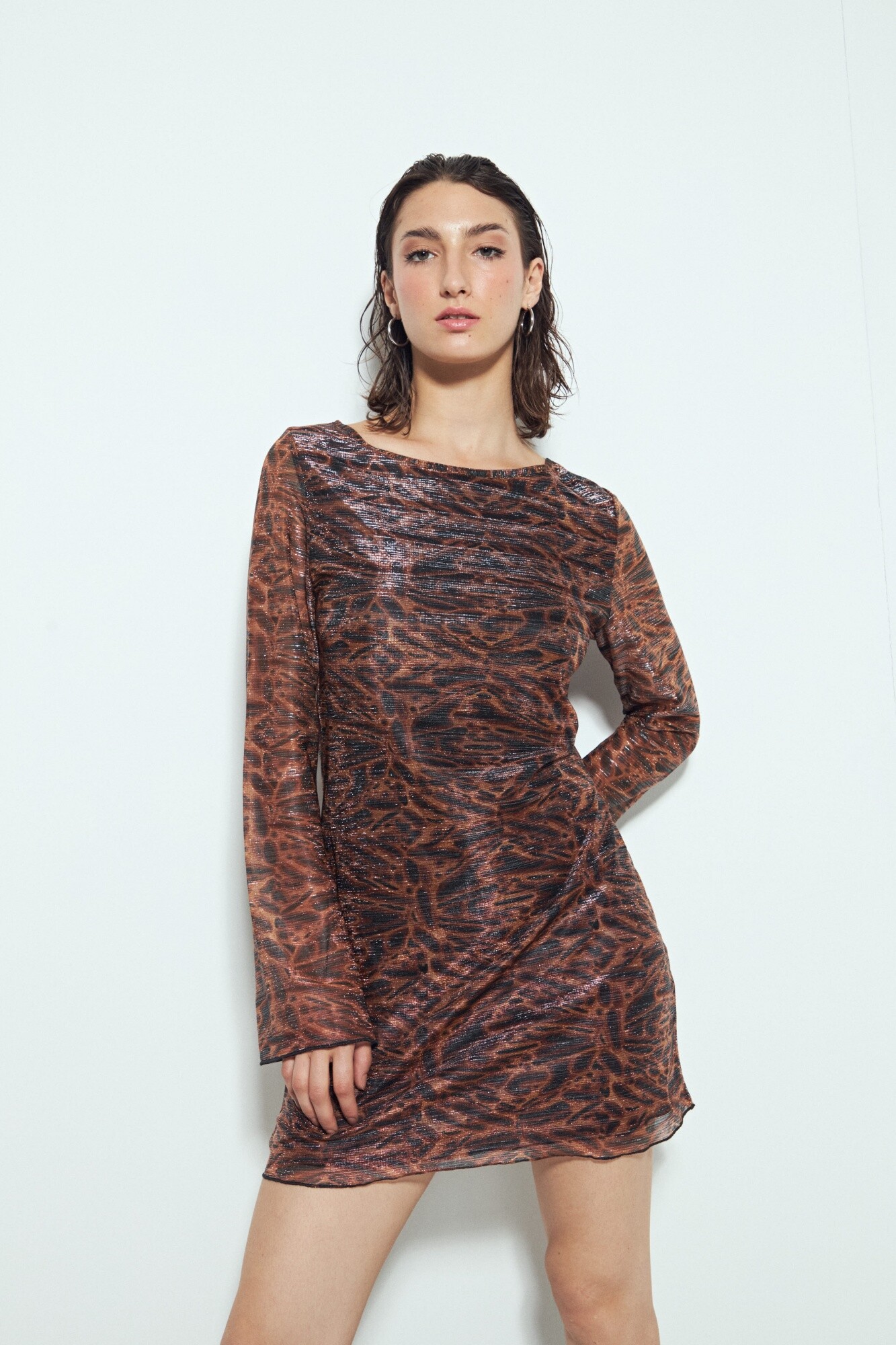 Vestido de manga larga con cuello redondo y estampa protagonista, una prenda pensada para looks de noche con actitud. El calce ajustado acompaña la silueta y realza la figura, mientras que el tejido liviano aporta una caída suave y un leve brillo que suma impacto visual. Ideal para combinar con botas o accesorios marcados, es una pieza que se luce por sí sola y funciona perfecto para estilismos nocturnos o festivales urbanos.