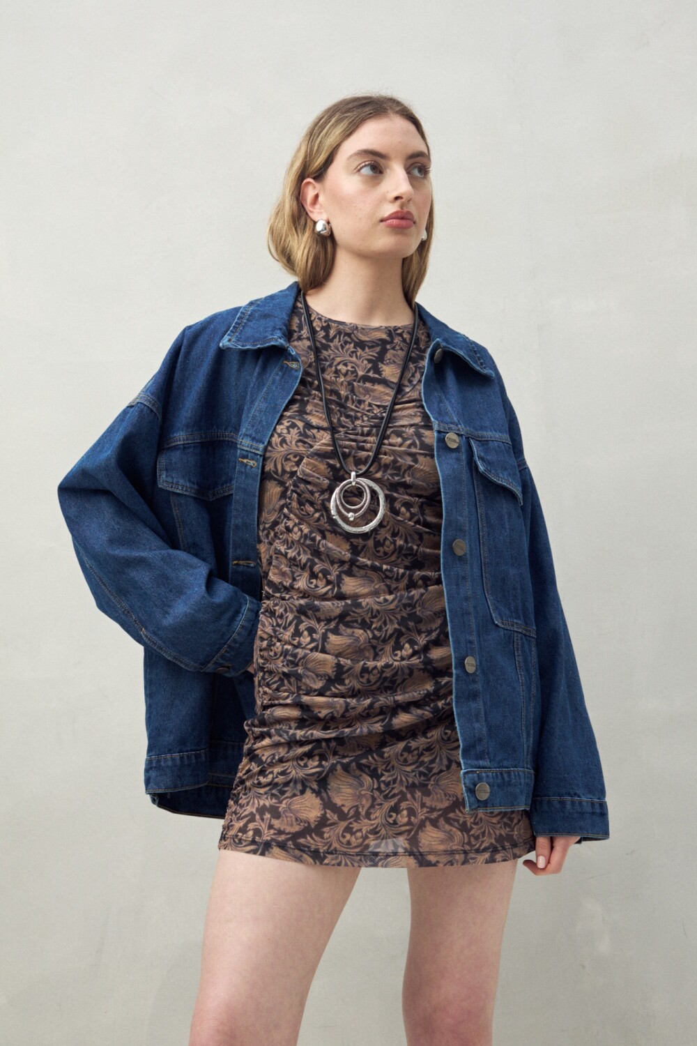 Vestido corto de mangas largas con estampado animal print en tonos tierra, una pieza trendy y audaz pensada para looks de noche o salidas especiales. El fruncido en el frente realza la silueta, aportando un toque femenino y favorecedor. Un diseño que fusiona actitud y estilo, perfecto para destacar.