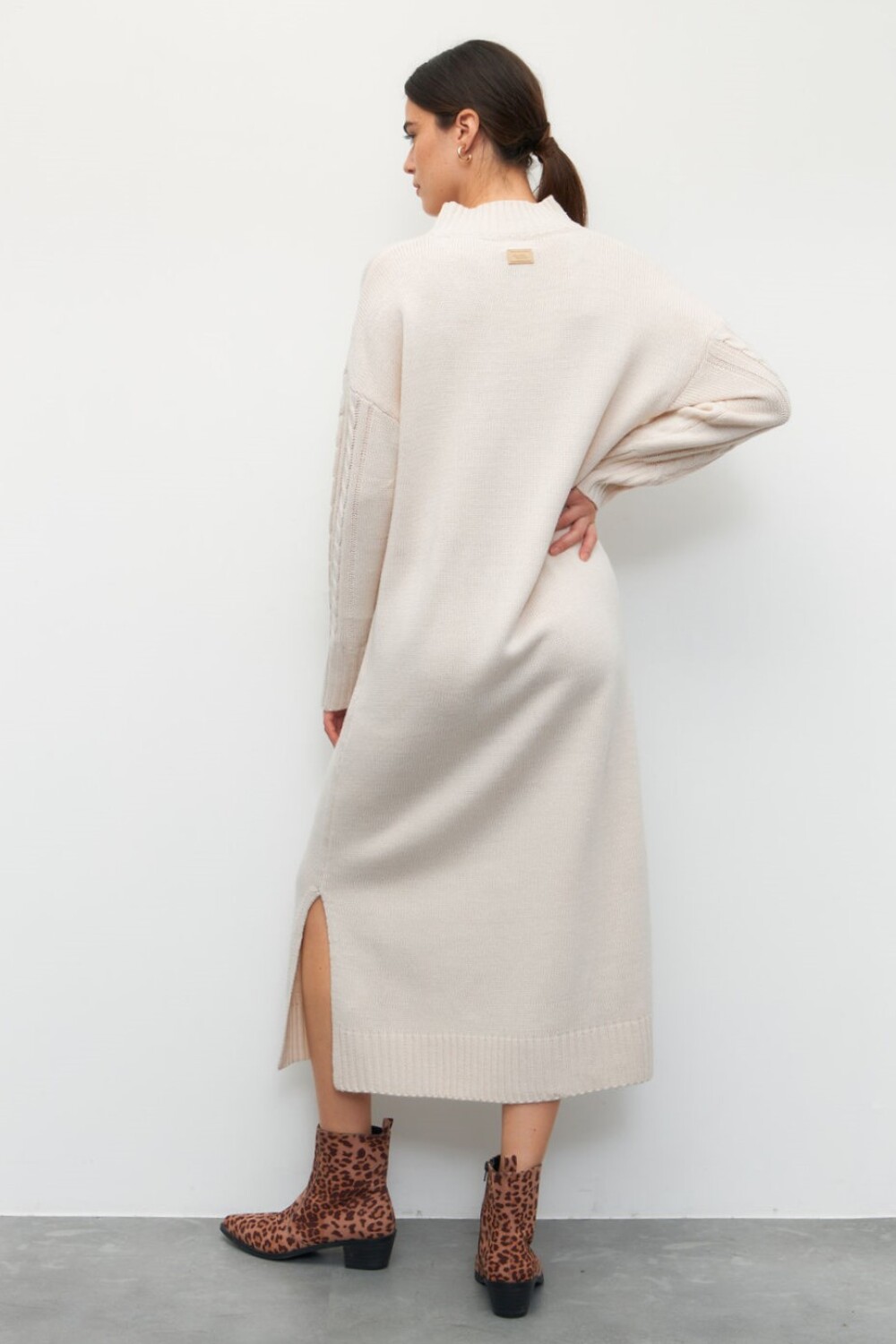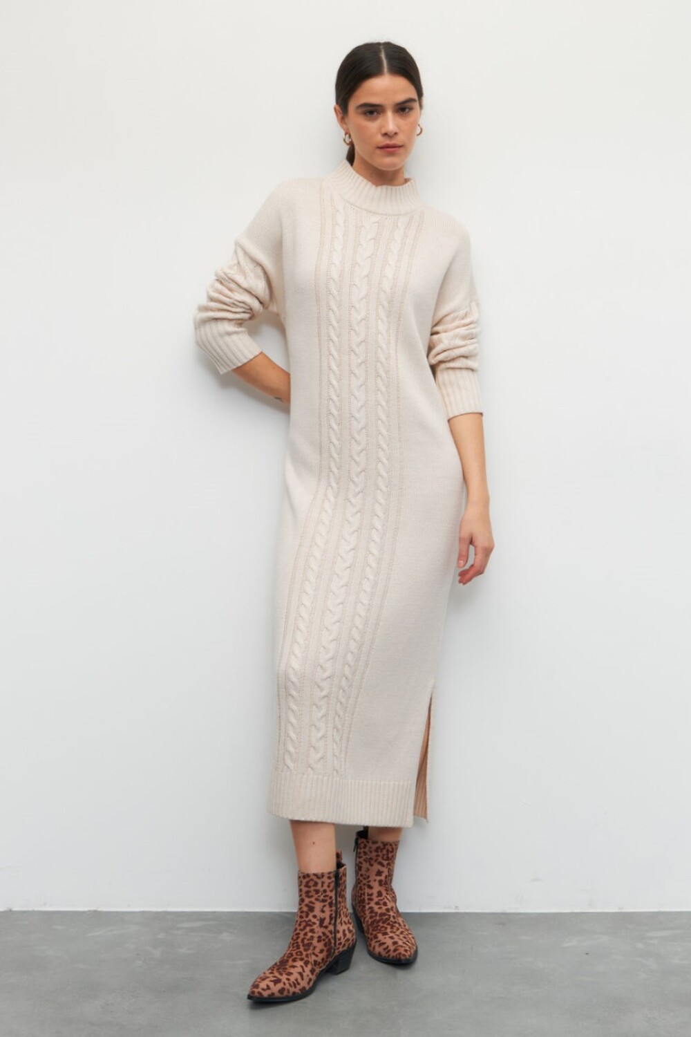 Maxivestido de punto, de manga larga y cuello alto, cuenta con aberturas en los laterales.