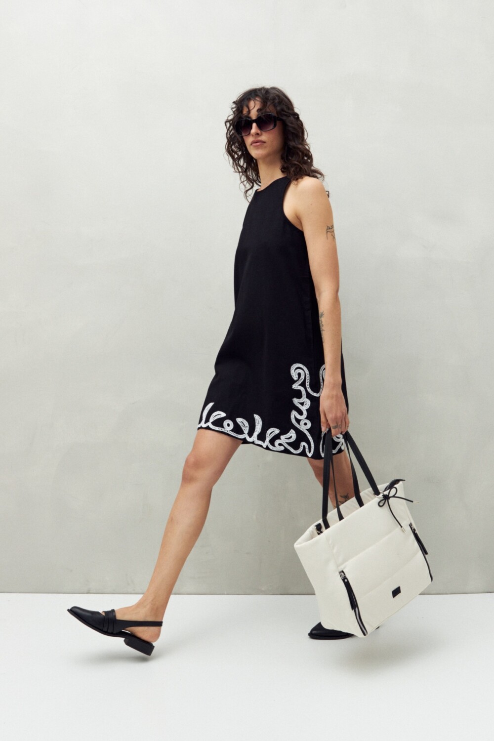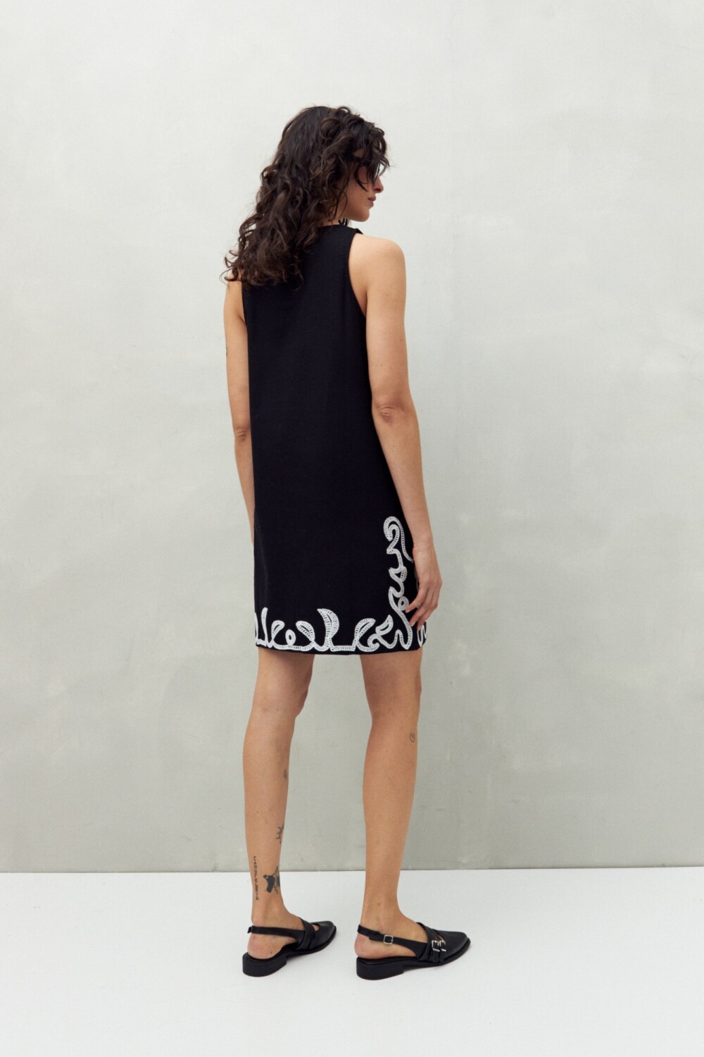 Vestido corto de algodón con bordado artesanal en el ruedo que aporta textura y detalle visual. Su silueta recta y cuello alto le dan un aire moderno y minimalista, ideal para lograr un look fresco con guiños bohemios.
