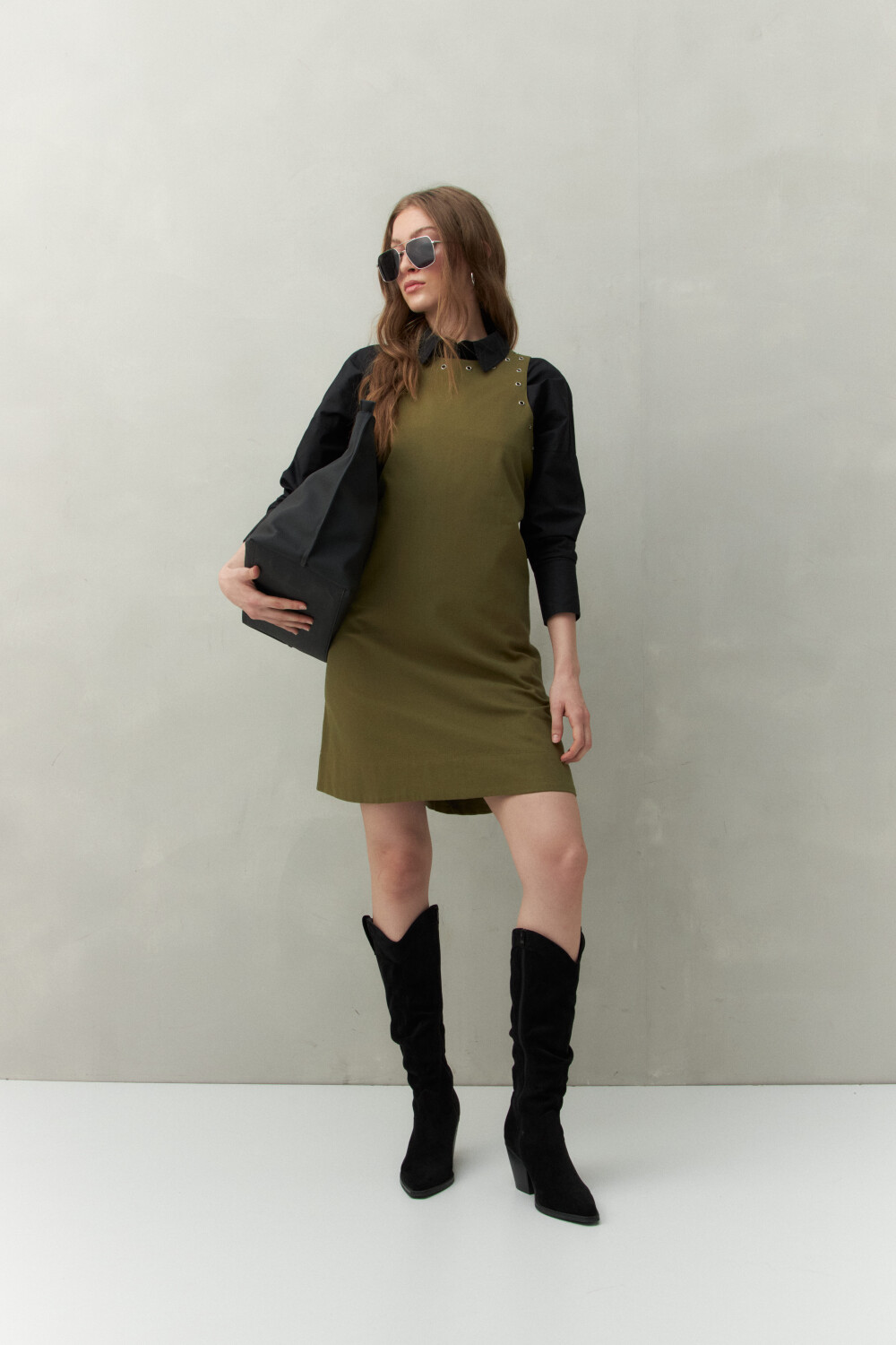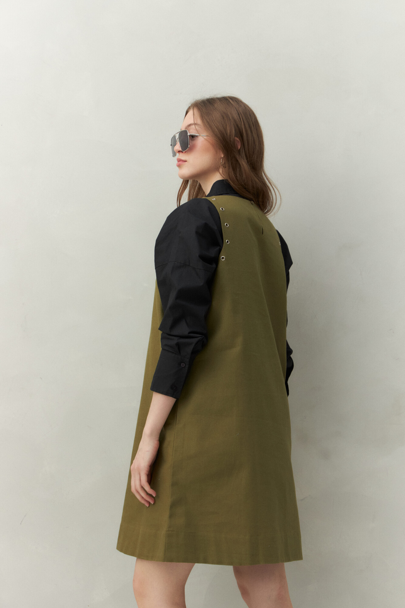 Vestido corto de silueta recta confeccionado en algodón con apliques metálicos que recorren el escote y las sisas, aportando un toque moderno y urbano. Su diseño minimalista se equilibra con este detalle diferencial, logrando una prenda versátil que puede acompañarte tanto de día como de noche con solo cambiar los accesorios.