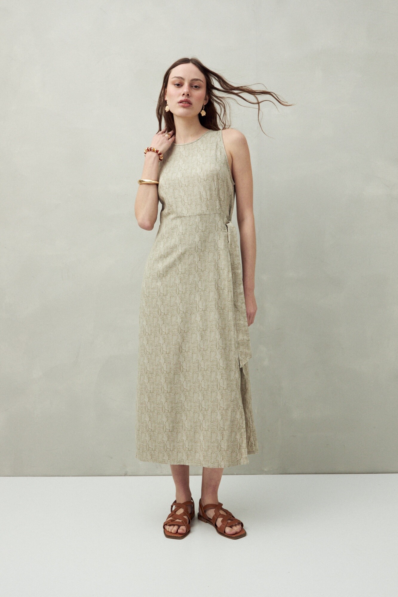 Vestido largo sin mangas con lazo lateral y estampa sutil, ideal para un look natural y elegante. Su confección en mezcla de lino y viscosa aporta una textura liviana con excelente caída, perfecta para los días de verano. El diseño con cruce y abertura frontal suma movimiento y un aire fresco que lo convierte en una pieza clave para outfits relajados o de ocasión.