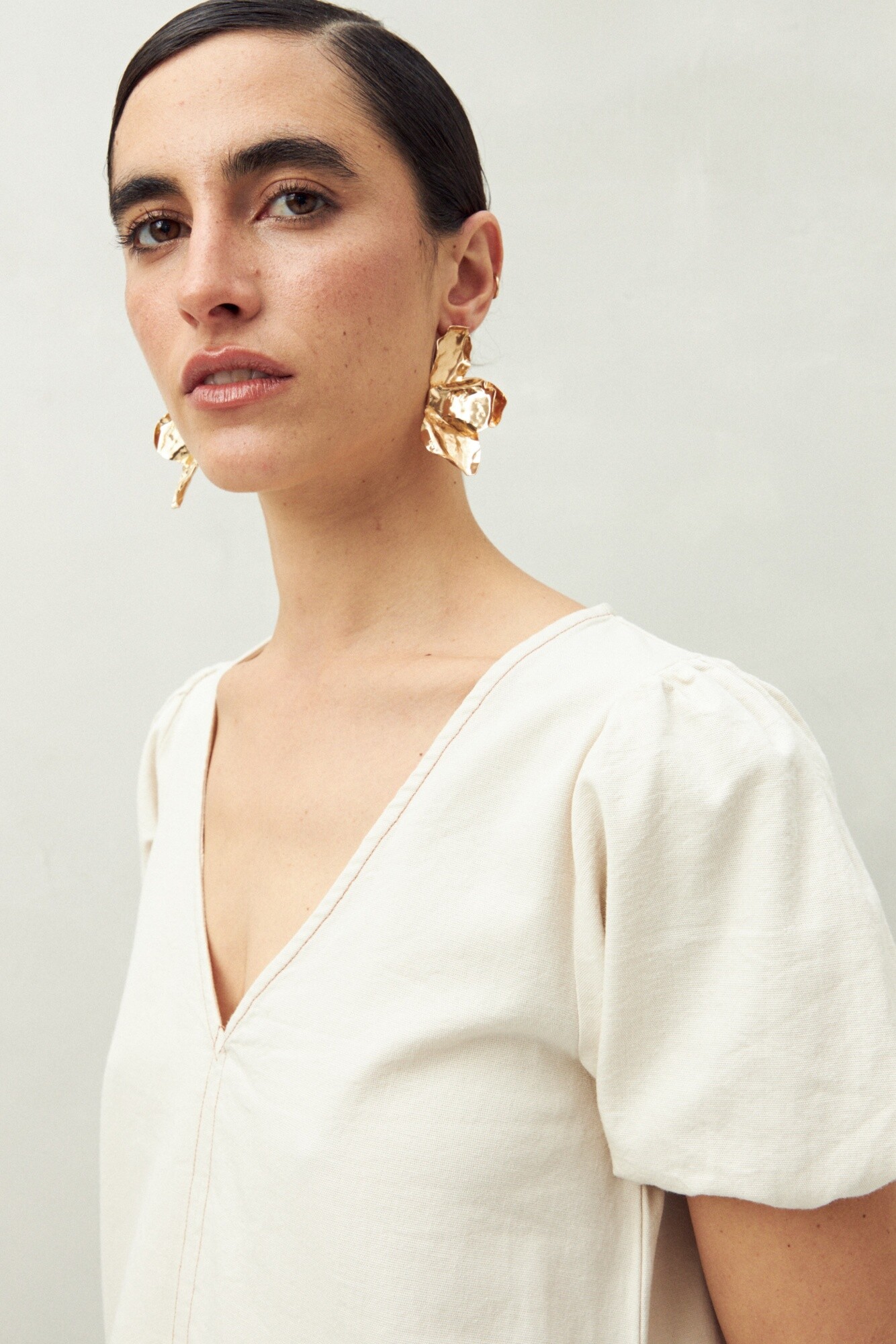 Vestido corto confeccionado en 100% algodón, con un diseño relajado y favorecedor. Presenta escote en V profundo y mangas abullonadas que suman volumen y un aire femenino. Su silueta amplia con costura central estiliza y lo convierte en una opción fresca y cómoda para el día a día. Ideal para llevar con sandalias planas o sneakers y lograr un look trendy sin esfuerzo.