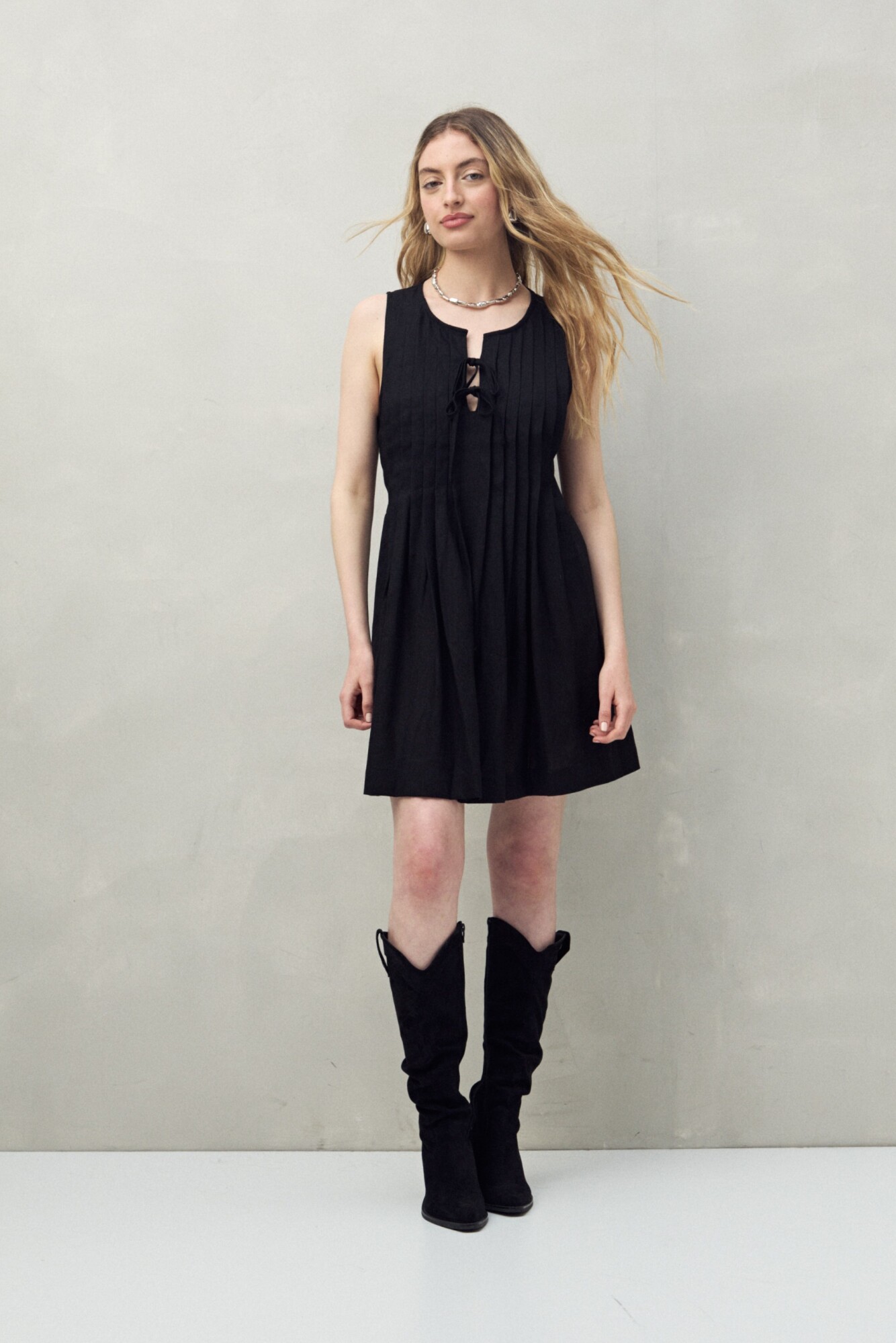 Vestido de lino con diseño de alforzas y escote con lazo, una prenda que combina movimiento y textura para un look fresco y femenino. Su silueta amplia realza la caída natural del lino, mientras que las alforzas verticales aportan estructura visual y un aire artesanal. Ideal para usar con botas o sandalias según el estilo que quieras lograr.