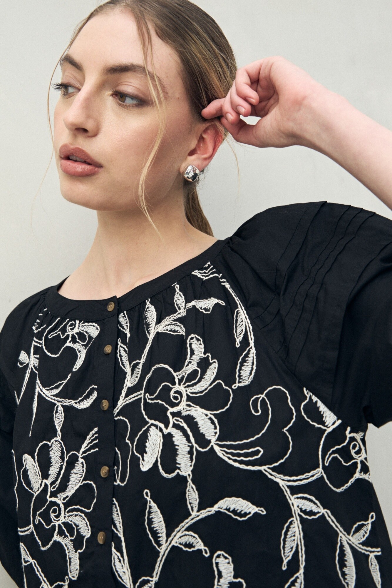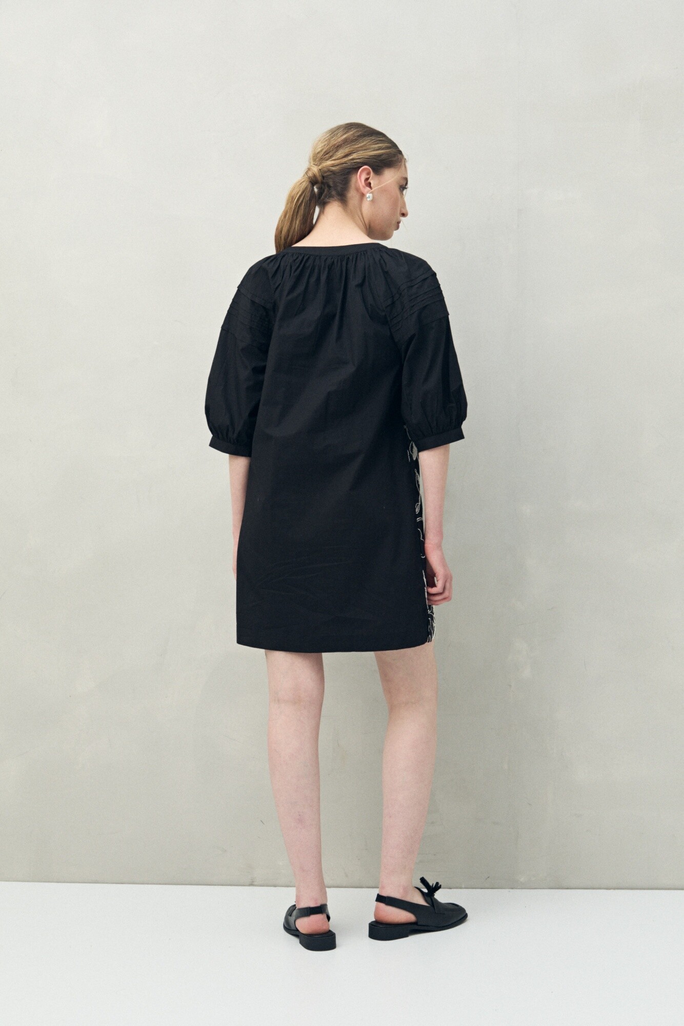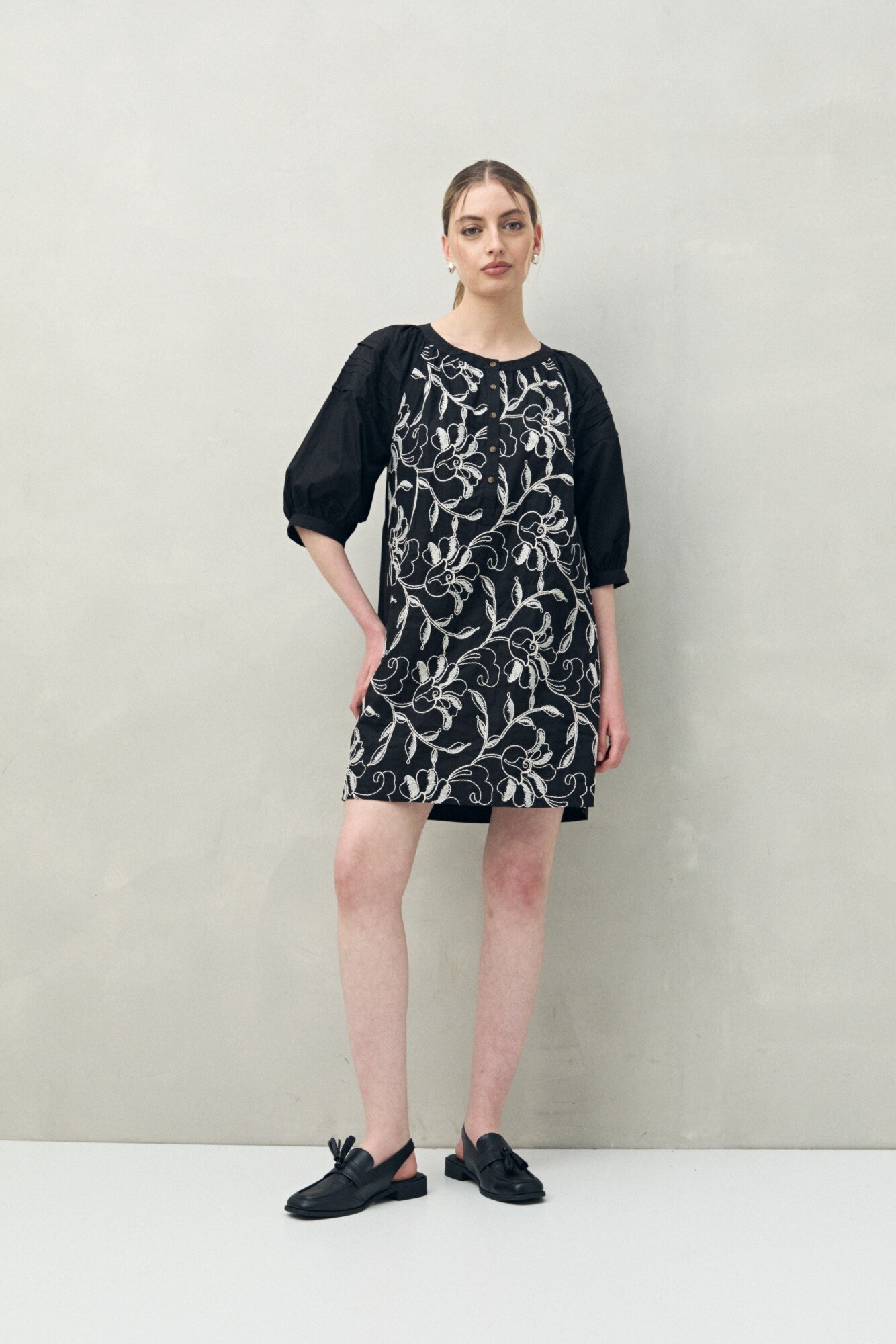 Vestido corto de algodón con bordado floral en relieve y escote redondo con abotonadura frontal. Las mangas amplias y los pliegues en los hombros aportan movimiento y un aire artesanal que lo vuelve ideal para un look femenino con inspiración bohemia.