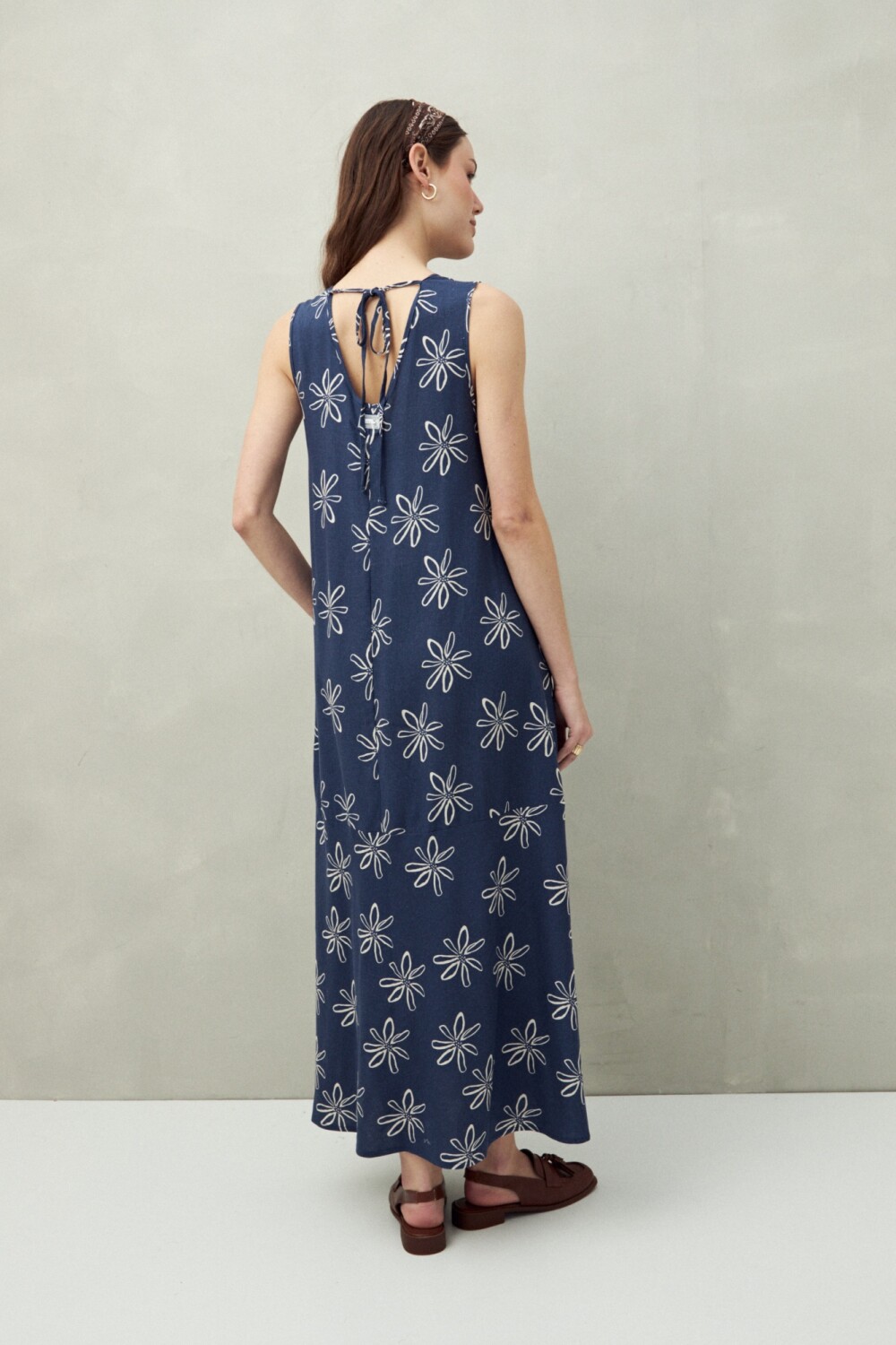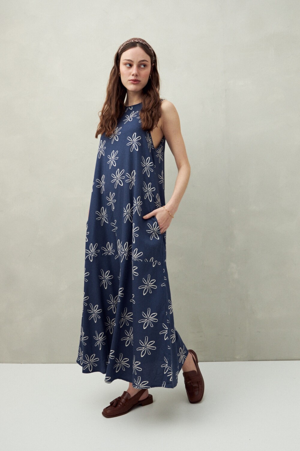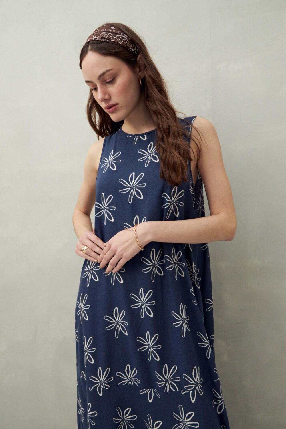 Confeccionado en una mezcla de lino y viscosa que le aporta caída fluida y textura natural, este modelo destaca por su silueta amplia y su diseño estampado, ideal para los días de verano. Su escote redondo y líneas limpias lo convierten en una pieza versátil, perfecta tanto para looks relajados de día como para un outfit más cuidado con accesorios.