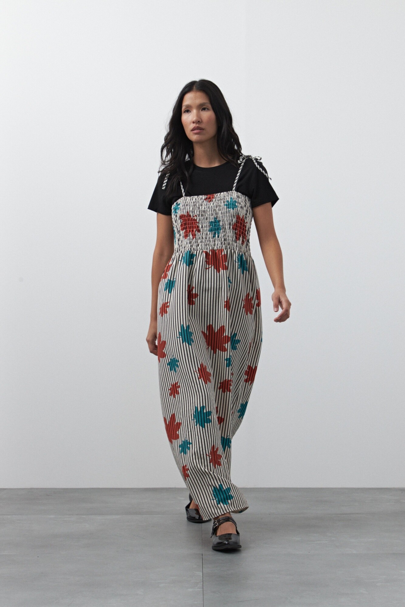 Vestido midi estampado de silueta fluida con cuerpo fruncido que aporta un calce cómodo y femenino. Presenta escote recto y tiras finas regulables que permiten un ajuste delicado, mientras que el corte bajo busto genera una caída suelta y liviana. El tejido acompaña el movimiento y resulta ideal para looks relajados de día o combinaciones más elevadas, clave para sumar un aire trendy sin esfuerzo.