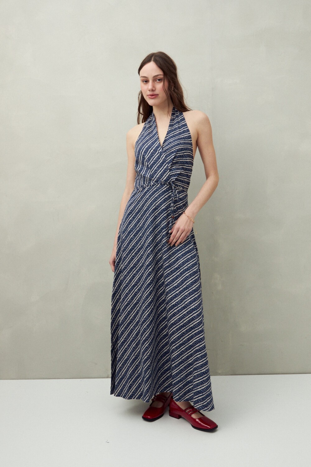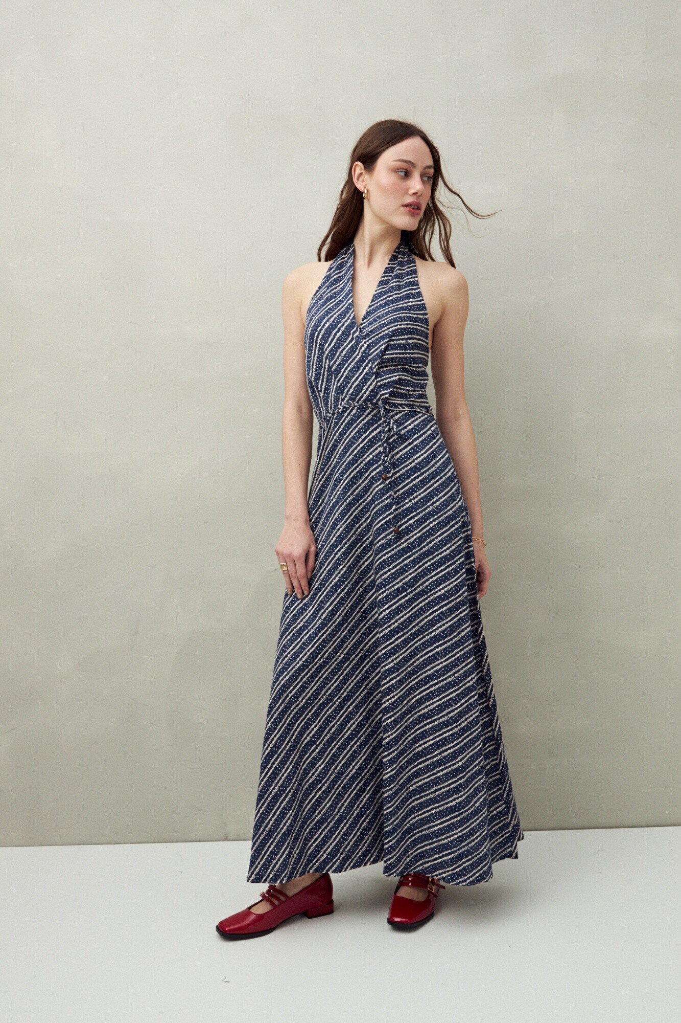 Vestido largo confeccionado en algodón liviano, con escote halter y lazo que se anuda al cuello. Su silueta fluida y cintura ajustable realzan la figura, evocando el encanto de los vestidos veraniegos de los años 50. Un diseño atemporal que equilibra frescura y elegancia.