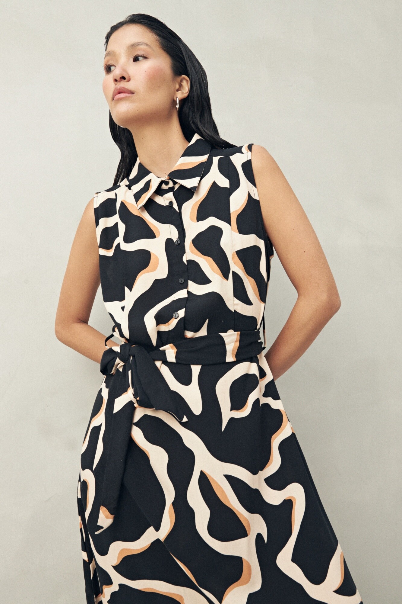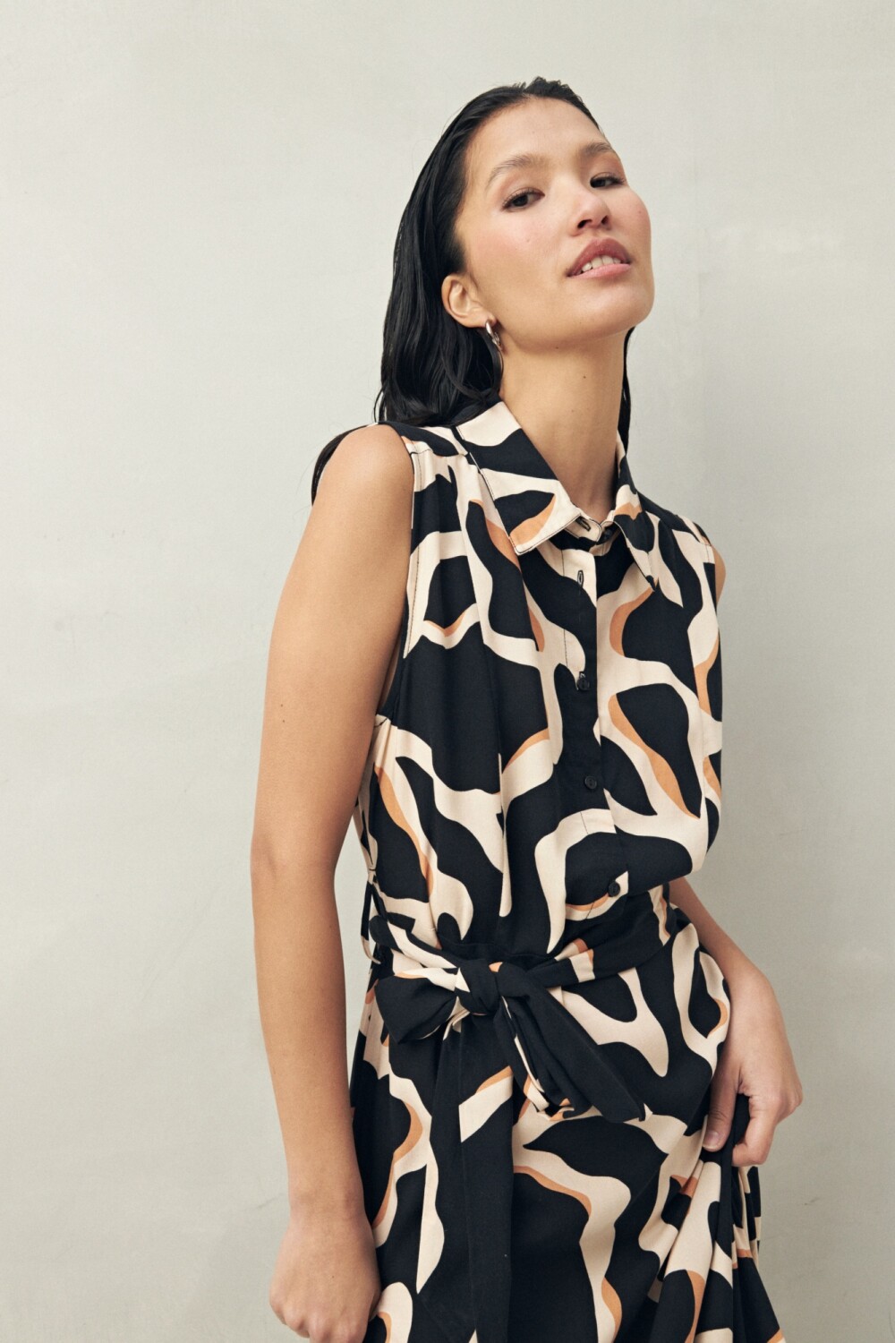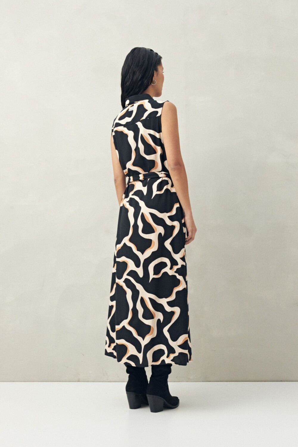 Vestido largo sin mangas confeccionado en viscosa fluida, con cuello camisero y lazo para ajustar en la cintura. Su silueta liviana y femenina lo convierte en una opción versátil para días de calor o eventos casuales, con un aire relajado pero pulido.